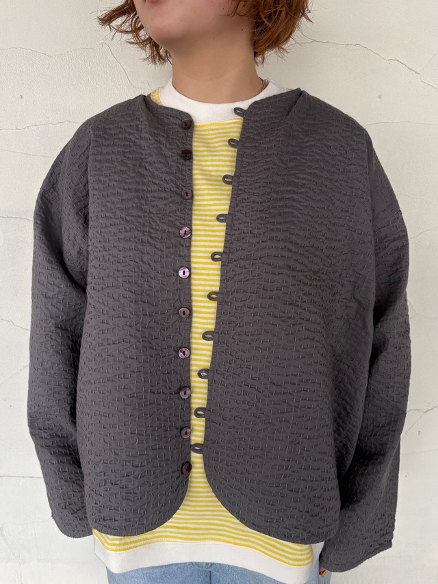 品番 : 38-300X 価格 : ¥22,000 素材 : 綿100% カラー : ホワイト、グレー size : 2 着丈52㎝ 身幅61㎝ 裄丈71㎝ モデル身長 : 148㎝ 細かな凹凸のあるチェック柄がさりげなく映える、やわらかな雰囲気の羽織りでございます。綿100%の軽やかな生地感で、季節の変わり目にも気軽に取り入れていただけます。 ゆったりとした身幅に、短めの着丈がバランスよく、ワンピースやワイドパンツとも相性抜群。さっと羽織るだけで、いつものコーディネートにほどよいアクセントを添えてくれる一着でございます。
