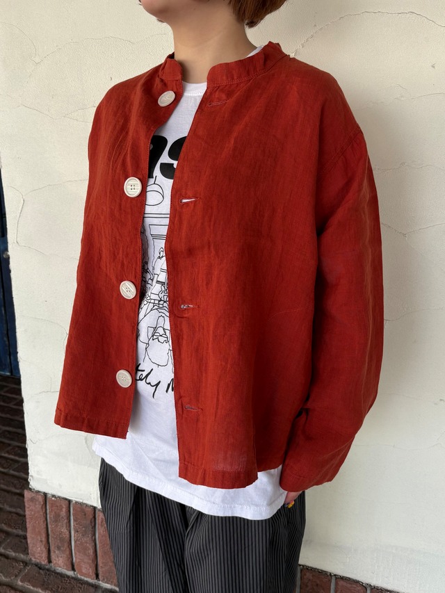 品番 : 8244T-001 価格 : ¥19,800 素材 : 麻100% (別布)綿100% カラー : レッド size : 2 着丈59㎝ 身幅56㎝ 裄丈79㎝ モデル身長 : 148㎝ 落ち着いたレッドが印象的な、リネン素材のシャツジャケット。 麻100%ならではの軽やかで風通しの良い着心地が、これからの季節に心地よく寄り添ってくれる一着です。 程よくゆとりのあるシルエットと、やわらかな風合いがリラックス感を演出しつつ、すっきりとした丈感でバランスよくお召しいただけます。 大きめのボタンやシンプルなデザインが、さりげないアクセントになり、カジュアルにもきれいめにも合わせやすいのも魅力です。 Tシャツの上にさっと羽織るだけで、コーディネートが華やぐ主役アイテム。 今の時期から夏にも涼しく着ていただけます!