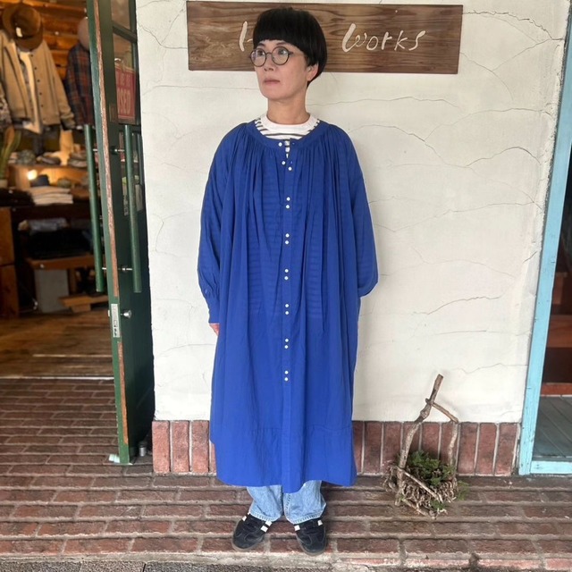 品番 37-285X 素材 綿100% 価格 ¥25300 カラー ブルー サイズ 2 着丈108.5㎝身幅72㎝肩幅58.5㎝ モデル身長160㎝ 軽い着心地で柔らかくふんわりとしたシルエットやや透け感があり、落ち着いたカラーでも軽やかな印象に仕上がります。しわを気にしなくていいので旅行にもピッタリです