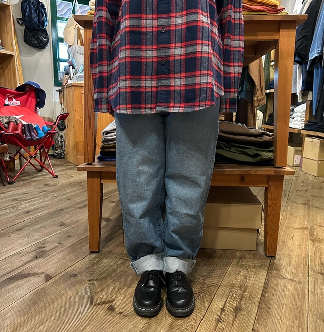 品番 11-208D 価格 ¥22,000 素材 綿100% カラー ユーズド size S、M S ウエスト74㎝ヒップ9㎝その他(パンツ丈)101㎝股上34.5㎝股下68㎝太もも周り60㎝裾周り34㎝ M ウエスト76㎝ヒップ100㎝その他(パンツ丈)101㎝股上35㎝股下68㎝太もも周り61㎝裾周り35㎝ モデル身長148㎝(着用サイズM) メンズデニムのようなリラックス感のあるデニム。 すっきりとしたウエストでゆったりなのに美しいシルエット! 流行に左右されず使いやすい明るめインディゴブルーです️