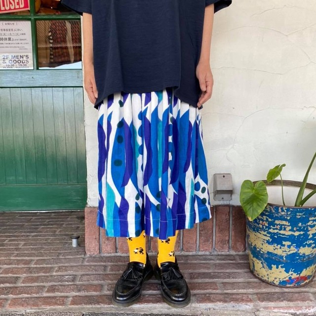 品番 SK-43-TB79 価格 ¥24200 素材 コットン60%リネン35% ポリエステル5% カラー ブルー size FREE ウエスト54~90㎝着丈72㎝ モデル身長160㎝ タイで出会ったなたまめをモチーフに描いたなたまめ柄 石北さんらしいほんわかする1枚です