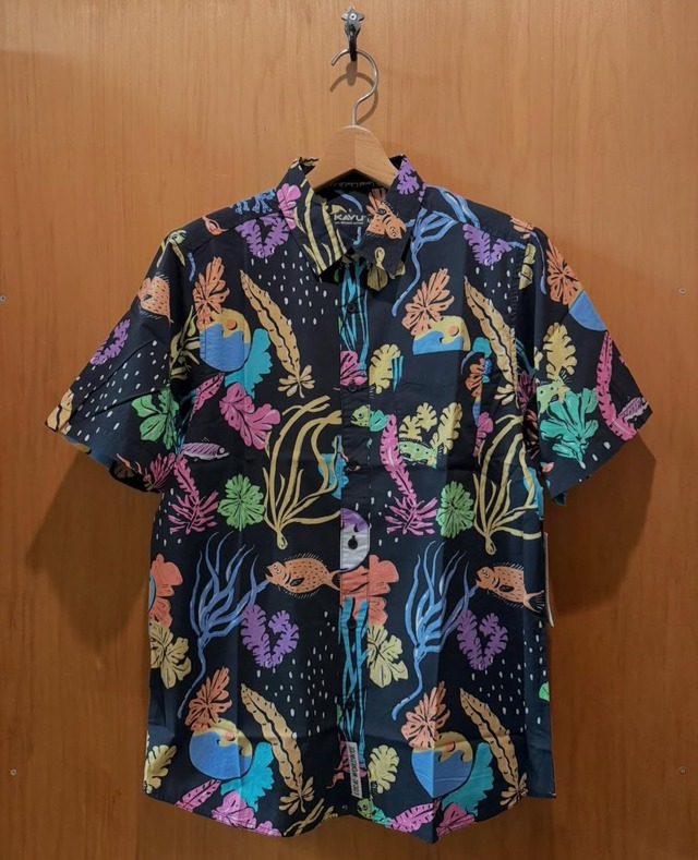品番 : 19810300 ¥13,200 カラー : ブラック サイズ : M, L コットン製の着心地の良いショートスリーブシャツ。 KAVUでは生地のグラフィックを1から手掛けている為、なかなかお見掛けしない個性的な柄のシャツに出会うことができます。 ゆったりとした着心地と首袖周りで、アクセントに胸ポケット。 アメリカンフィット(US規格のサイズ)のサイジングで、コットン素材が肌触りがよく、タウンでもアウトドアでも映える一着。 同柄のショートパンツもあるので、セットアップでの着用も可能です