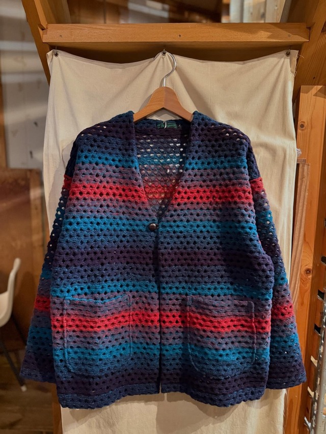 品番:K2608201 ¥29,700 素材:POLYESTER62%, WOOL25%, ACRYLIC13% カラー:ブルー, レッド サイズ:M・L 目の粗い鍵編みのようなデッドストック生地を使用し、深みのあるカラーをゆるやかなグラデーションで表現した一着。 粗めのメッシュ編みが生み出すラフな抜け感と、唯一無二の存在感。 アウターとしてもインナーとしても活躍し、デニム、レザー、スウェットなど幅広いスタイルにマッチします。 入手困難なデッドストック生地を、美しい仕立てで完成させた特別なカーディガン。 トレンドに左右されない一枚をぜひお楽しみください。