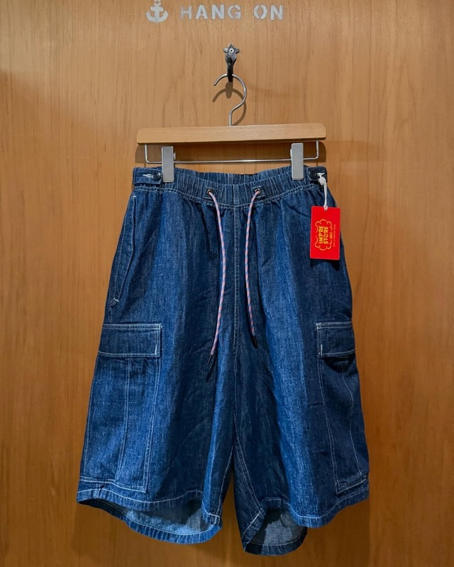 品番:imst68 ¥16,500 素材:コットン100% カラー:バイオウォッシュ サイズ:FREE (ウエスト:60~95cm, 股上:37cm股下:67cm, わたり: 45cm, 裾巾 : 30cm, 脇丈 : 99.5cm) アメリカ軍が極寒地域でボトムの上から重ね穿きするオーバーパンツとして採用した「TROUSERS SHELL ARCTIC M-1951」のMEDIUM-REGULERからシルエットとディティールをサンプリングしたデザイン。 スウェットパンツの快適さを街着に昇華したい思いを根底にスタートしています。 今回リリースされたこちらの素材は薄手の6.5オンスデニム。シャツぐらいの薄さなので、真夏にも余裕で対応します。 カラーは穿き込んで色落ちも楽しめるワンウォッシュ。 ウエストはゴムとドローコードが内蔵。更に釦アジャスターも装備しており、ウエストサイズの調整可能。リラックスフィットなカーゴパンツです。 根底がスウェットパンツなのでフロントジッパーは排除。 大き目のサイドポケットやサイドシームのダブルの巻き縫い仕上げも抜かりなく忠実に再現。フロントのフラップ付きのポケットは、本来はスルー(貫通)ポケットですが実用性を考慮して袋ポケットにアレンジしております。 楽チン仕様と骨太ビンテージのディティールを取り入れたイージーカーゴショーツは、それぞれの良いとこ取りで、唯一無二の仕上がりとなっております。持ってると一番履いちゃうタイプのパンツ。是非!