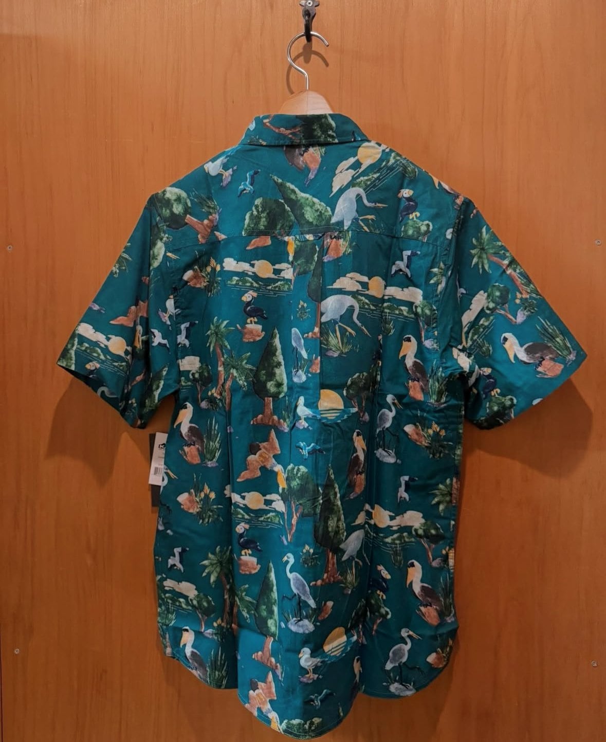 鳥や草木など自然にちなんだ総柄が、キレイな深いグリーンに映えて、アロハシャツのような雰囲気に