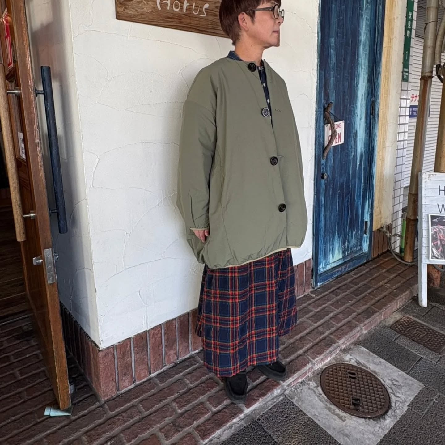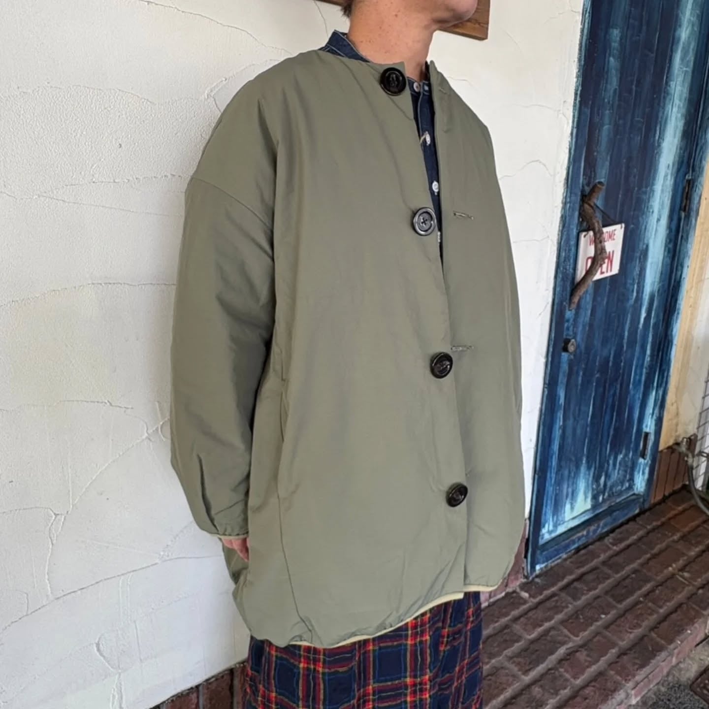 メンズライクな雰囲気もありつつ、BIGボタンが可愛らしさのポイントに