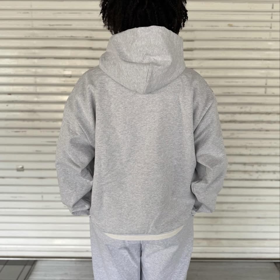 お腹部分ははオーセンティックなカンガルーポケット。フードは存在感のある2重仕立てで、ドローコードはなく、クロスした首元がモダンなディティール。