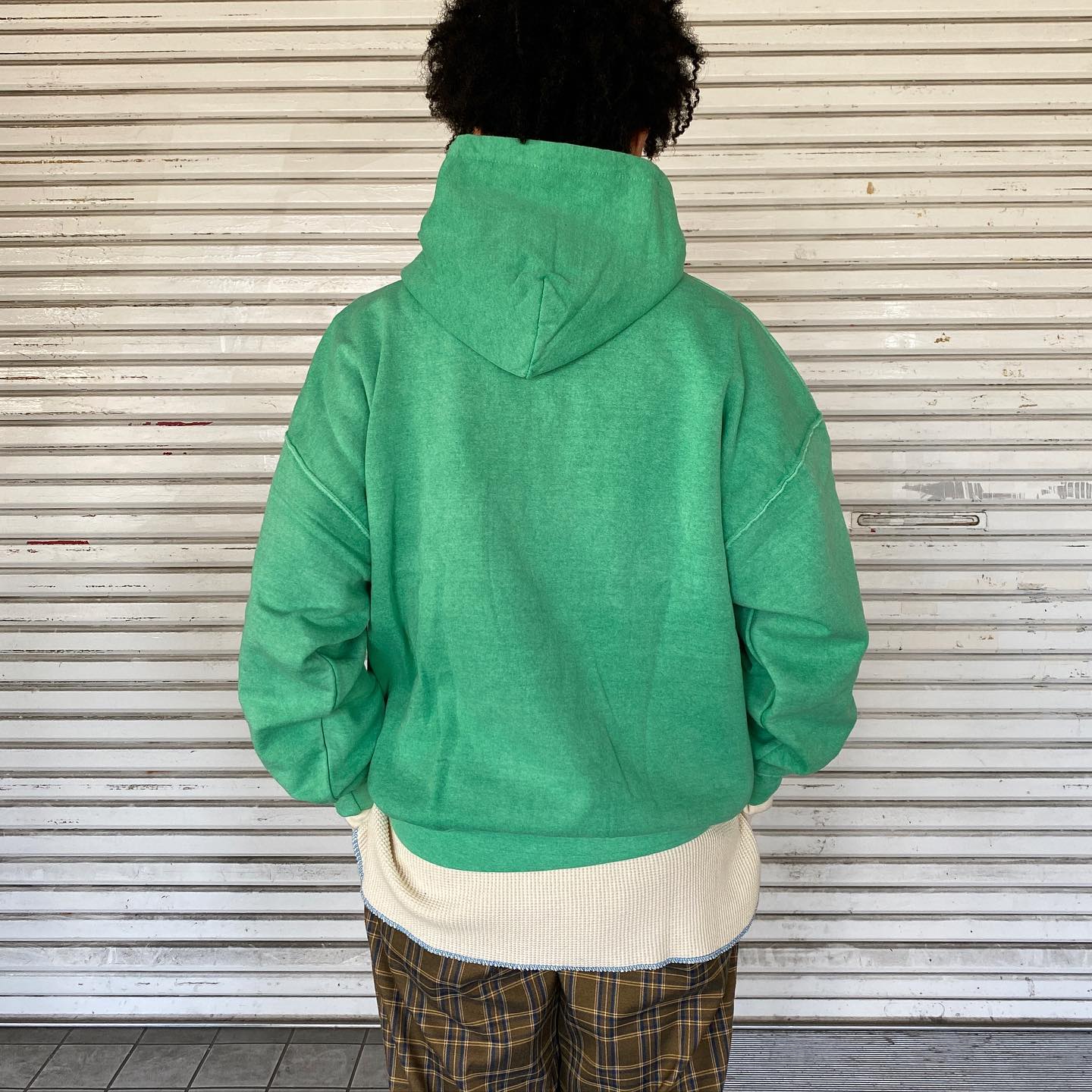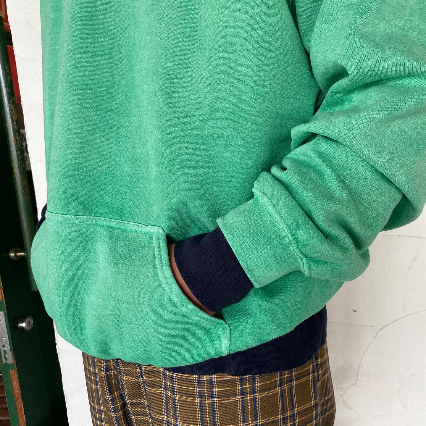 生地は、70年代からアメリカンスポーツウェアのスタンダードとして使用されているコットン50%、ポリエステル50%、丸筒の8oz フリース素材。