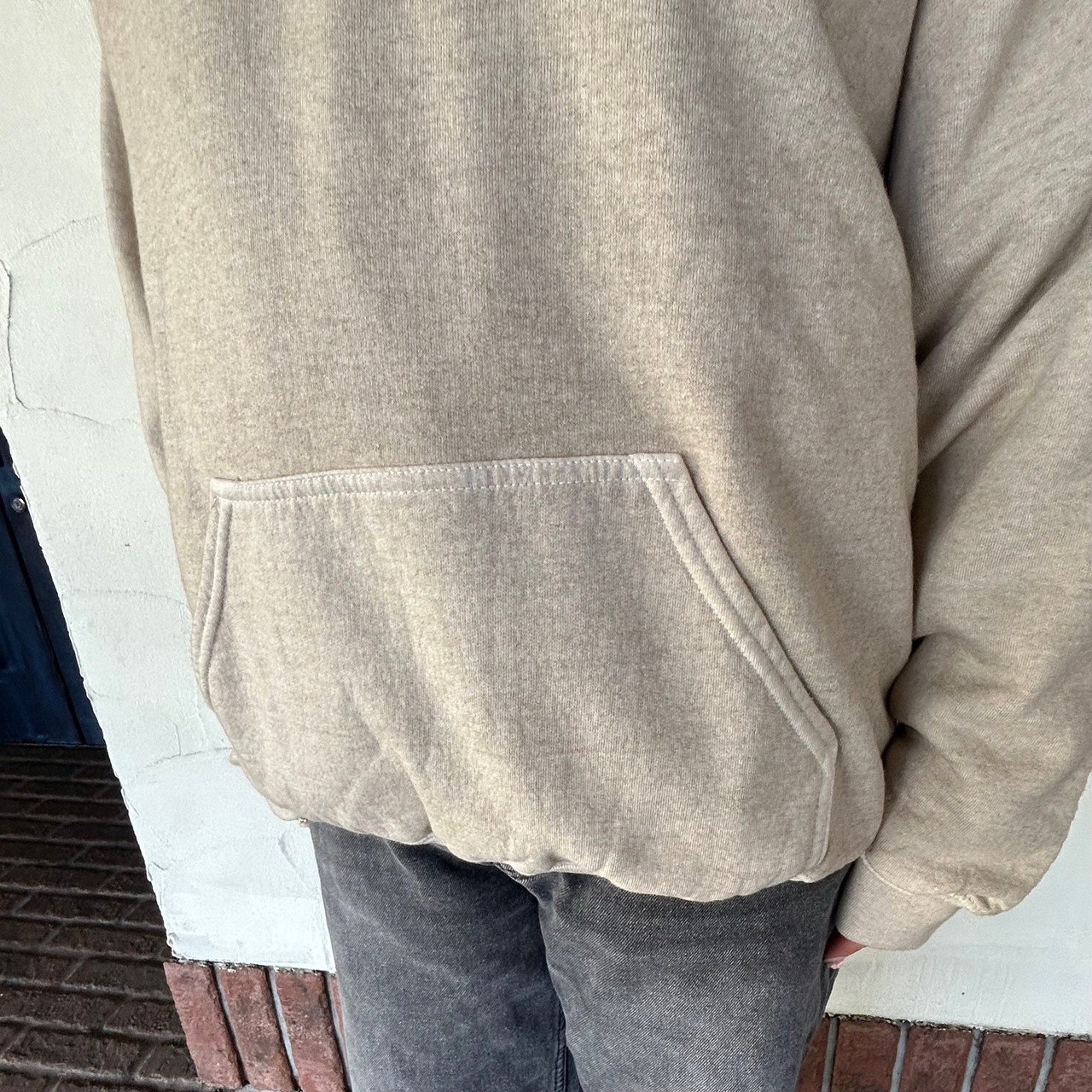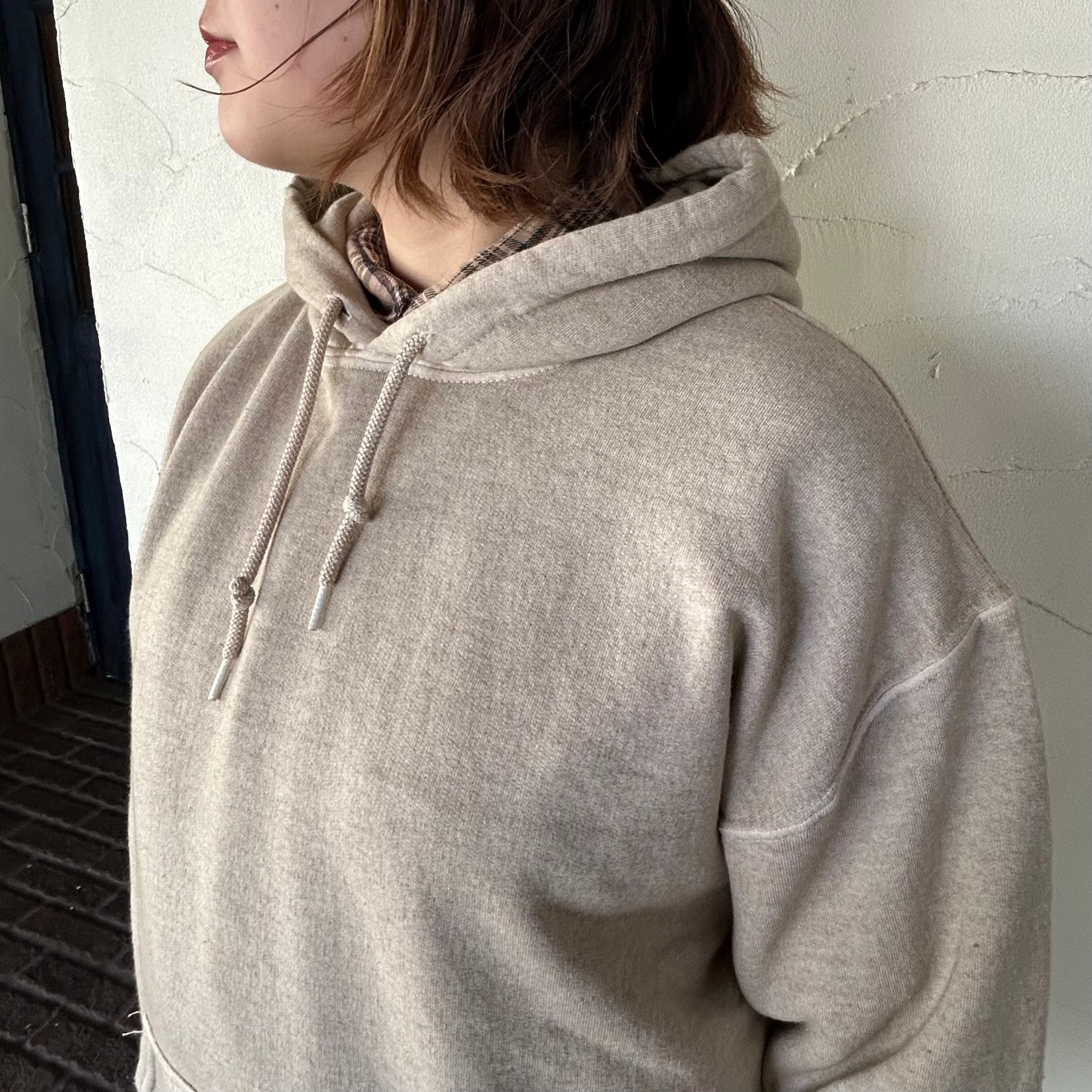 頭をすっぽり覆う大きなフードがポイントのスウェット。ノーカラーのジャケットからフードを見せるスタイルもおすすめです。
