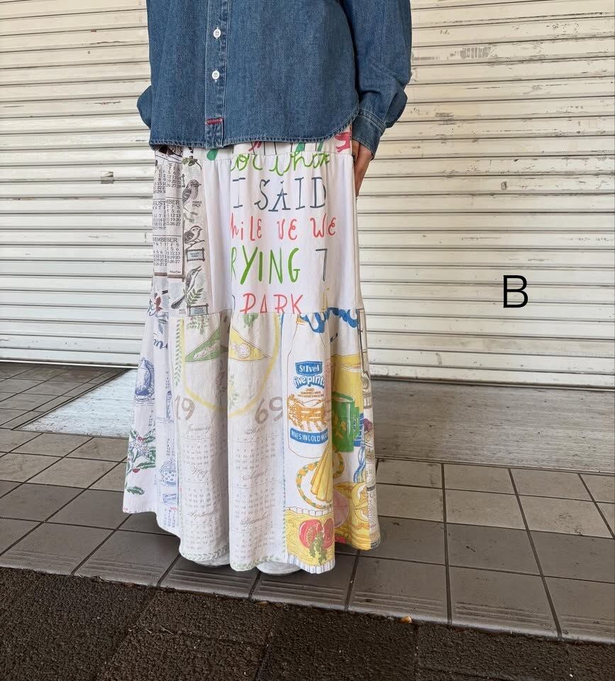 ヨーロッパのヴィンテージタペストリーやペナントクロスなどをパッチワークしたティアードスカート