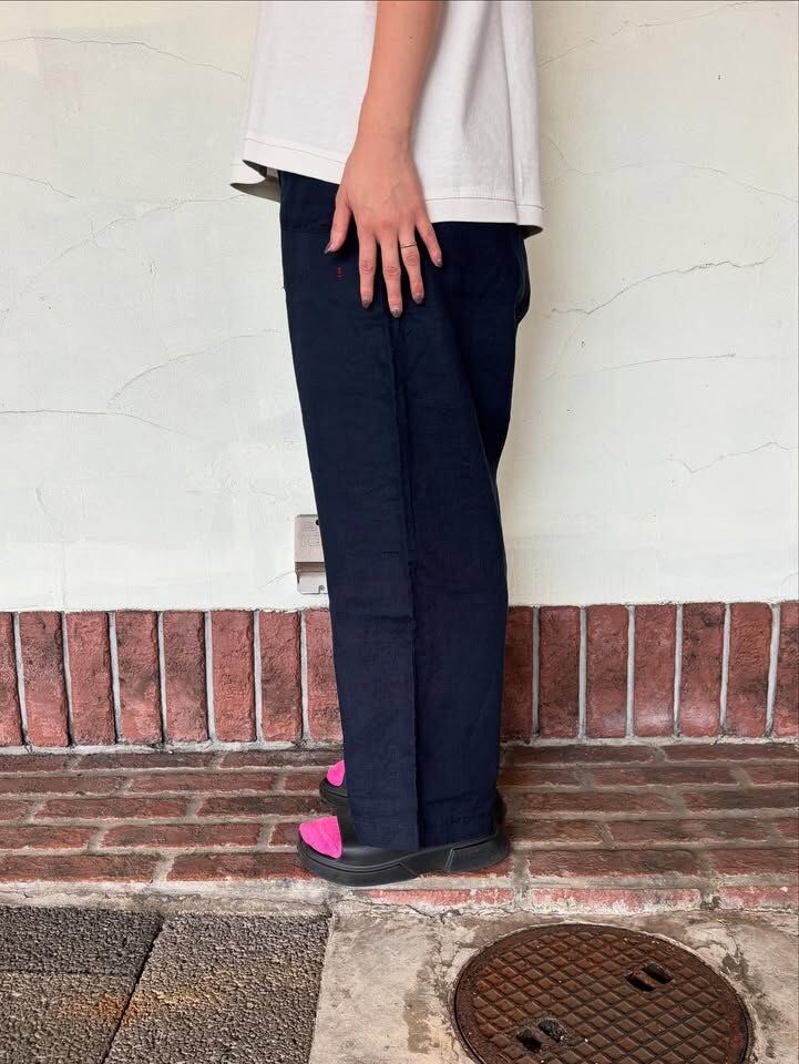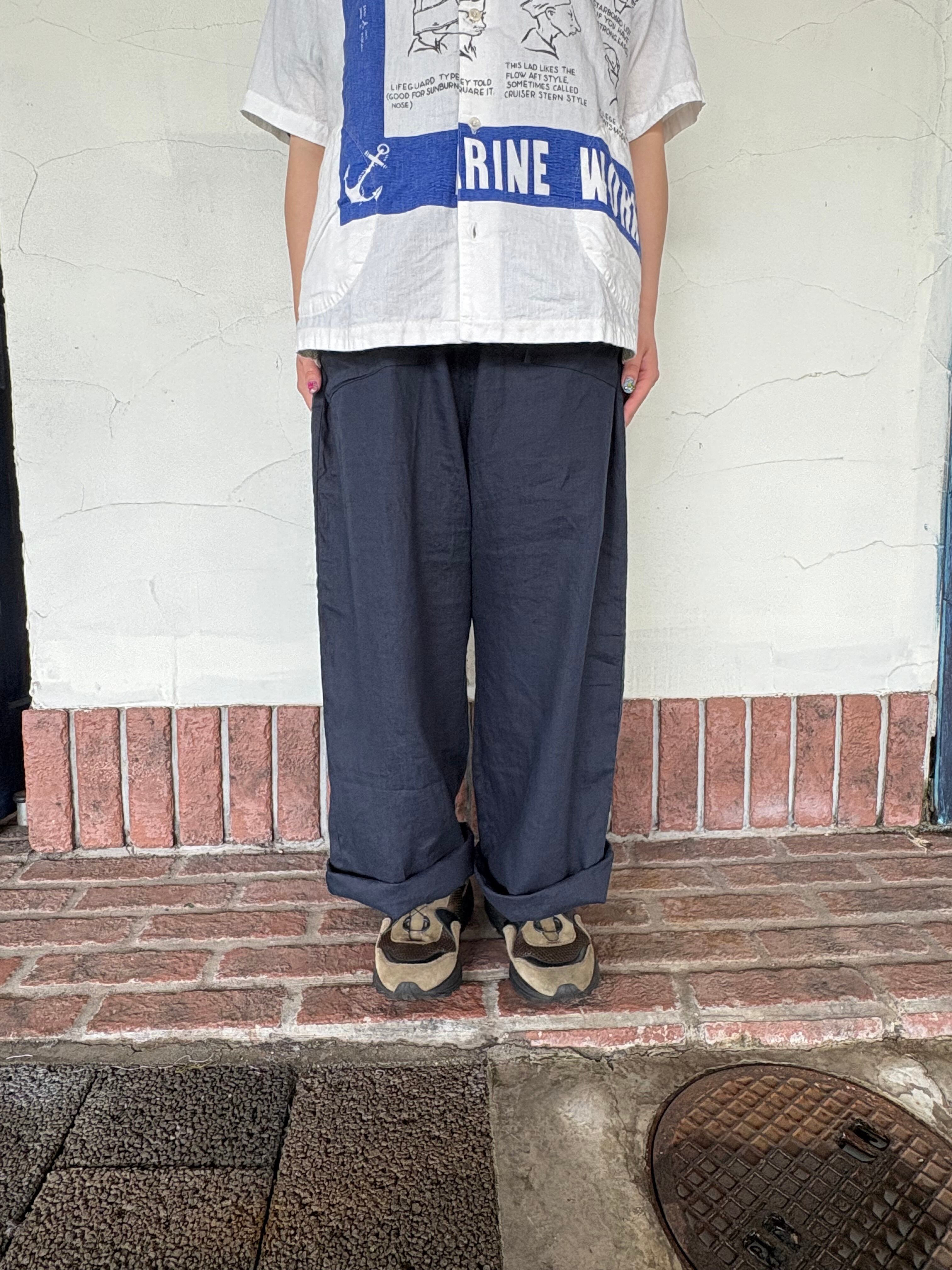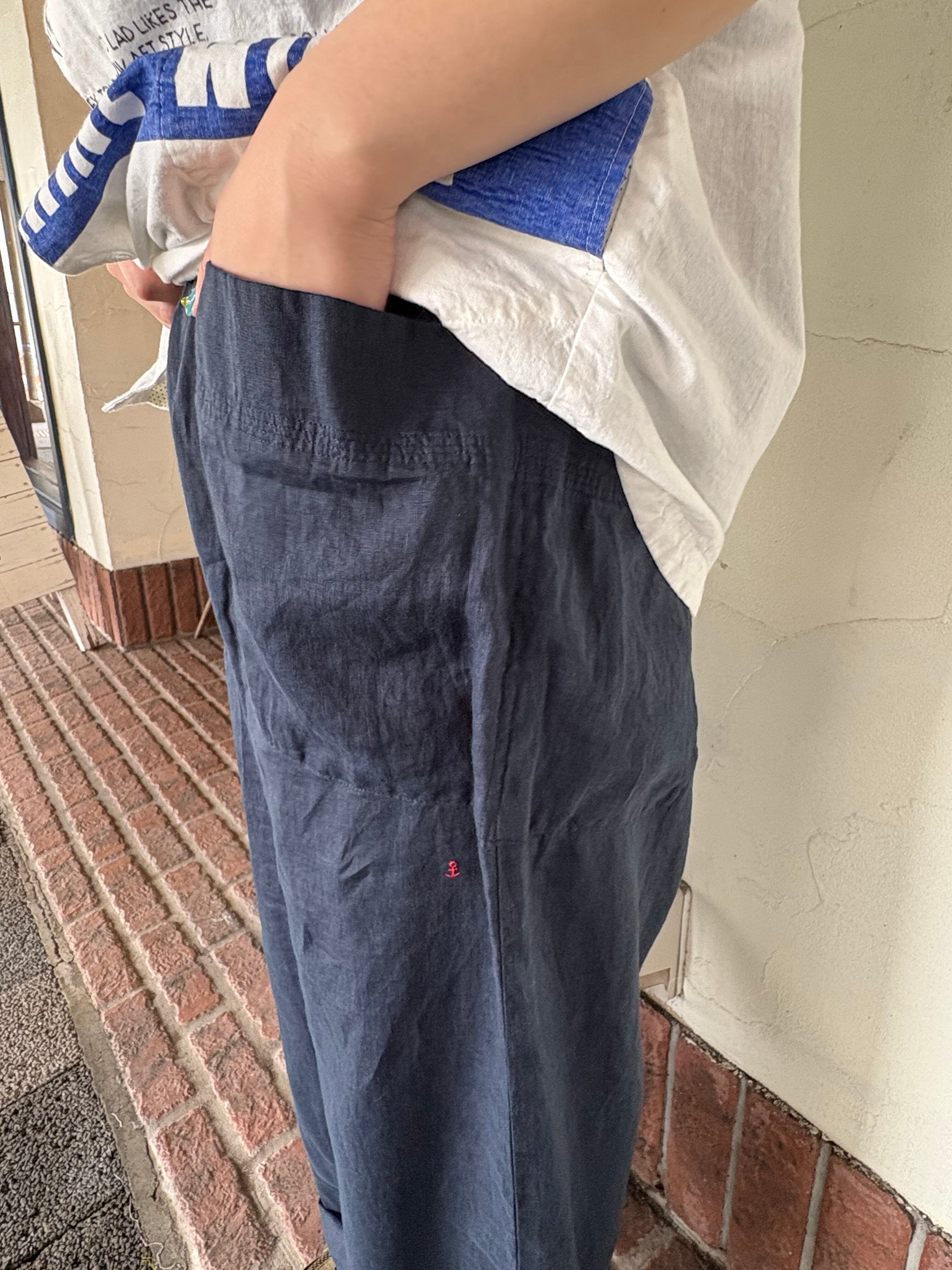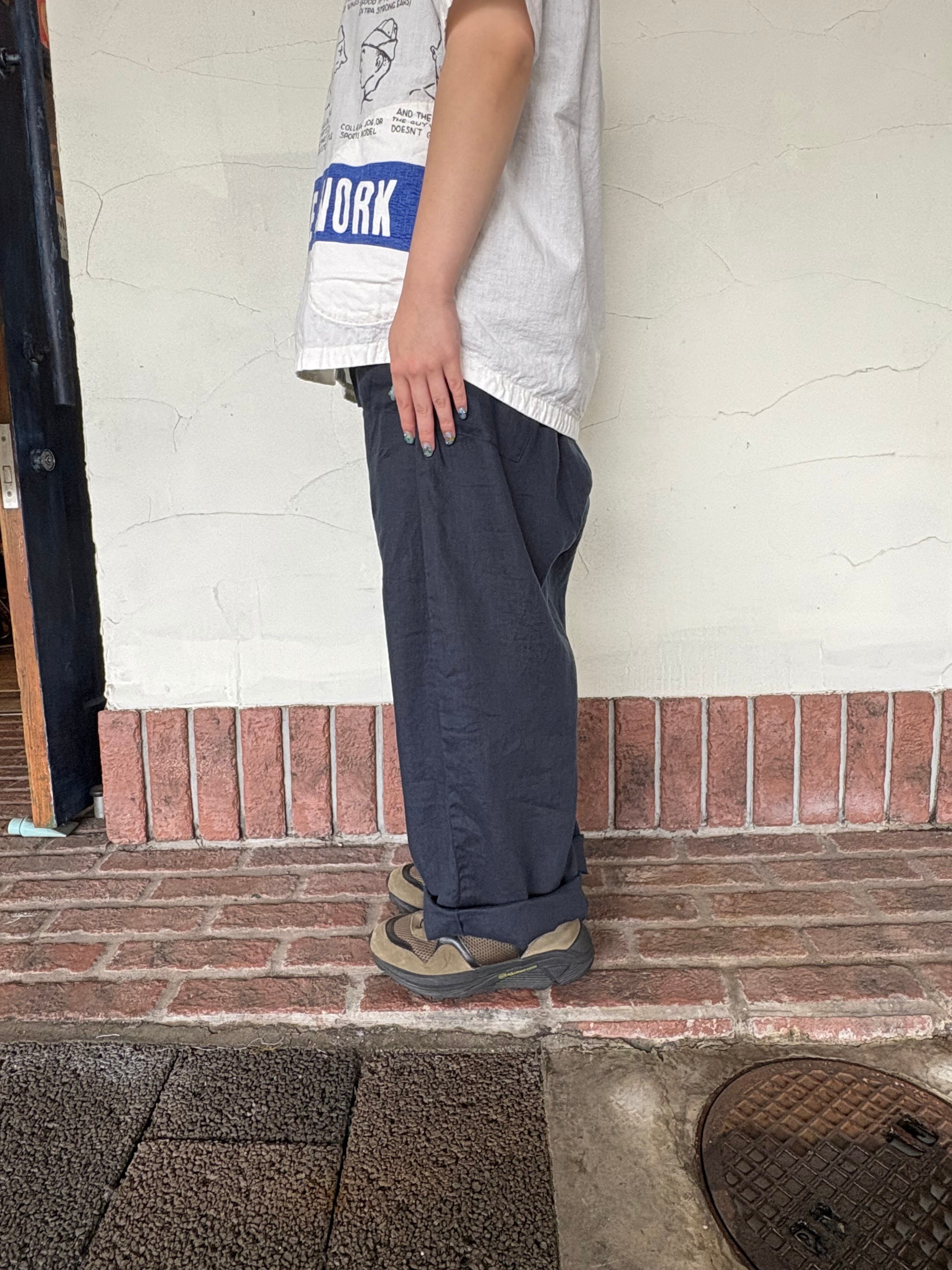 リネン100%の軽やかな素材感と、ワイドなシルエット。