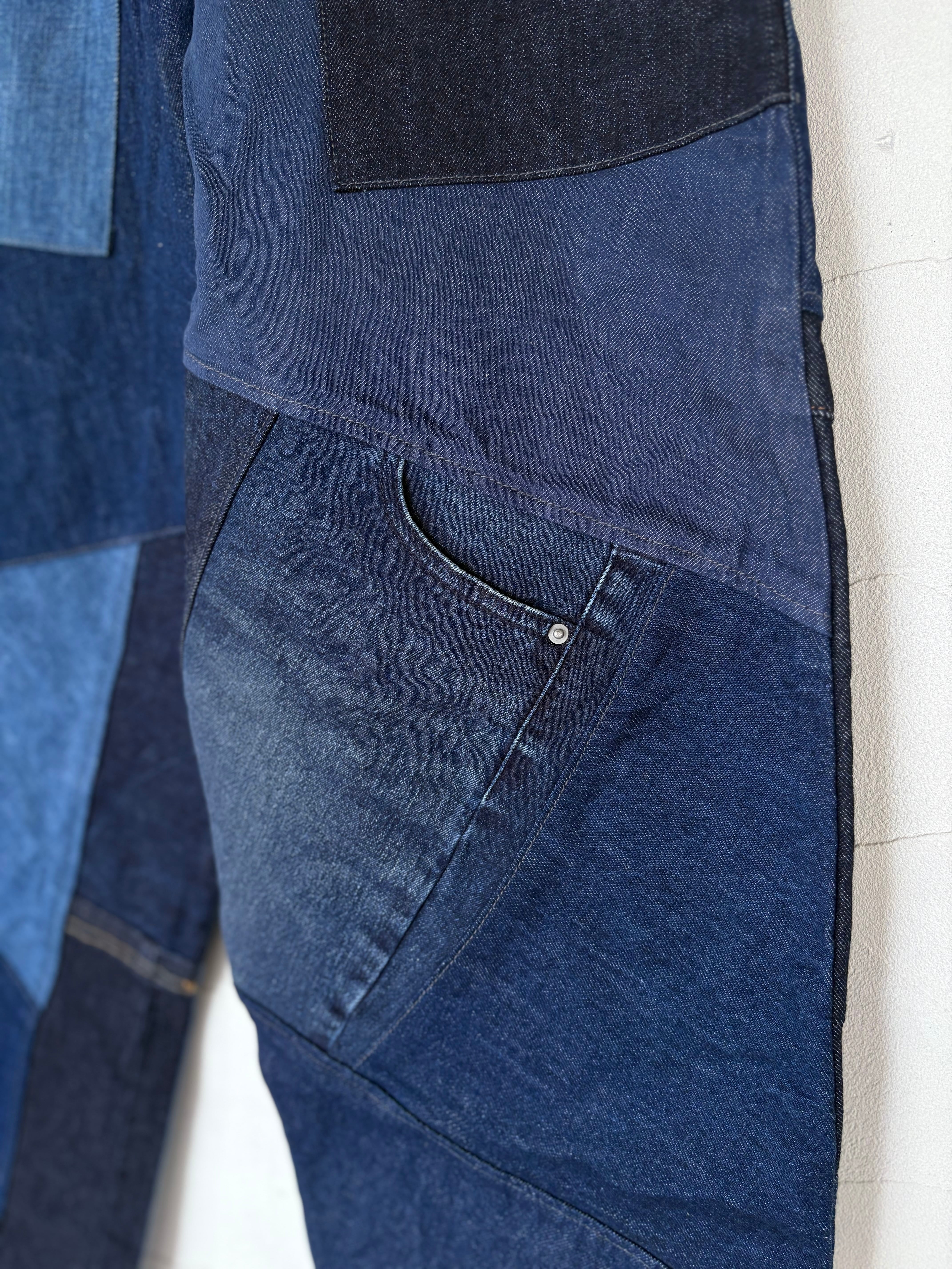 製品や古着、未使用の生地などを使用してパッチワークにしたイージーパンツ。