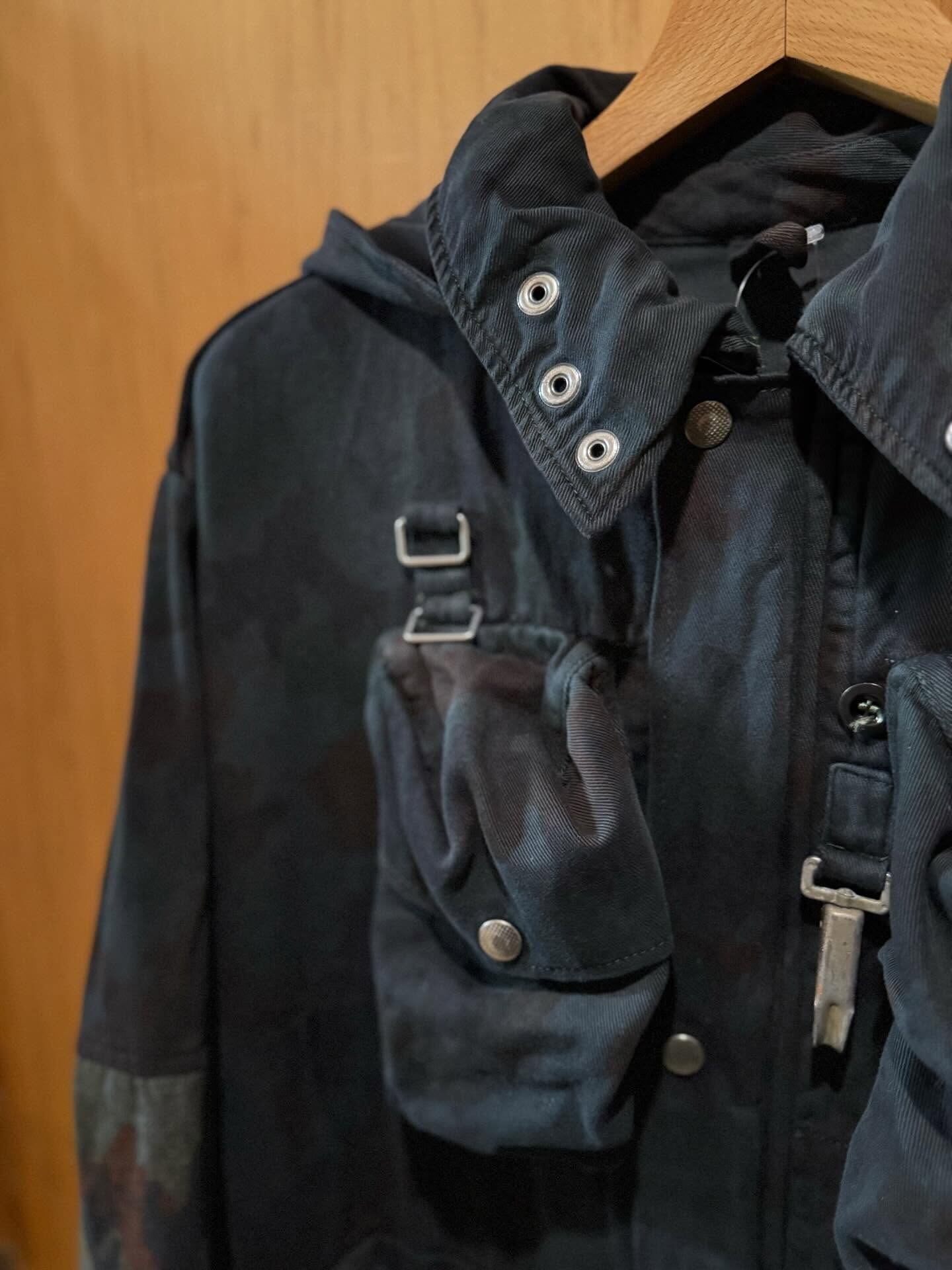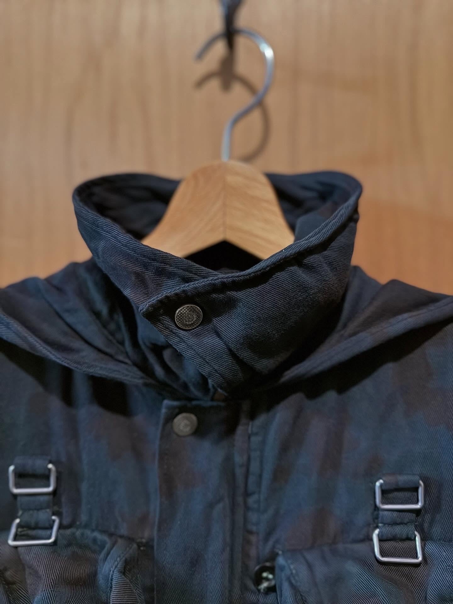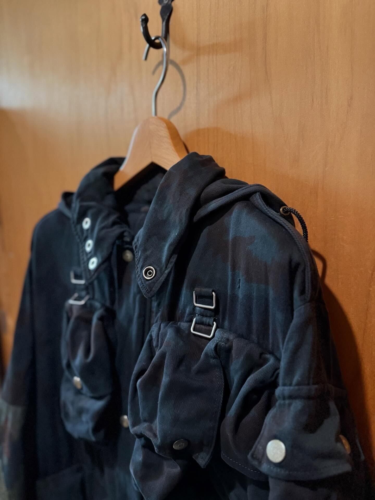 その独特なアルペンカモを染め職人に丁寧にBLACK染めして頂いた一着。完全にブラックするのではなく、アルペンカモフラージュのうっすら浮き出ている迷彩柄が雰囲気抜群の仕上がりです。