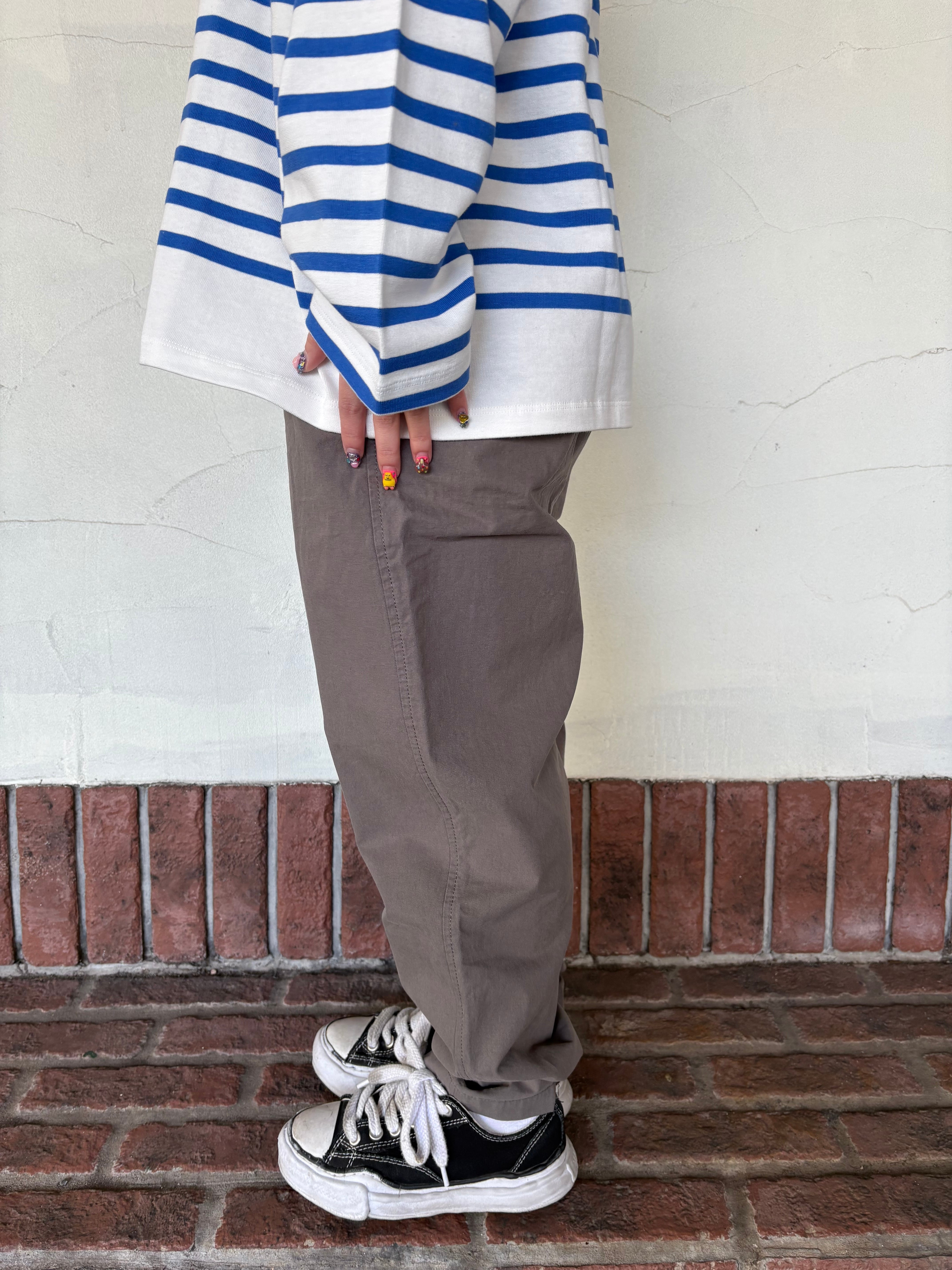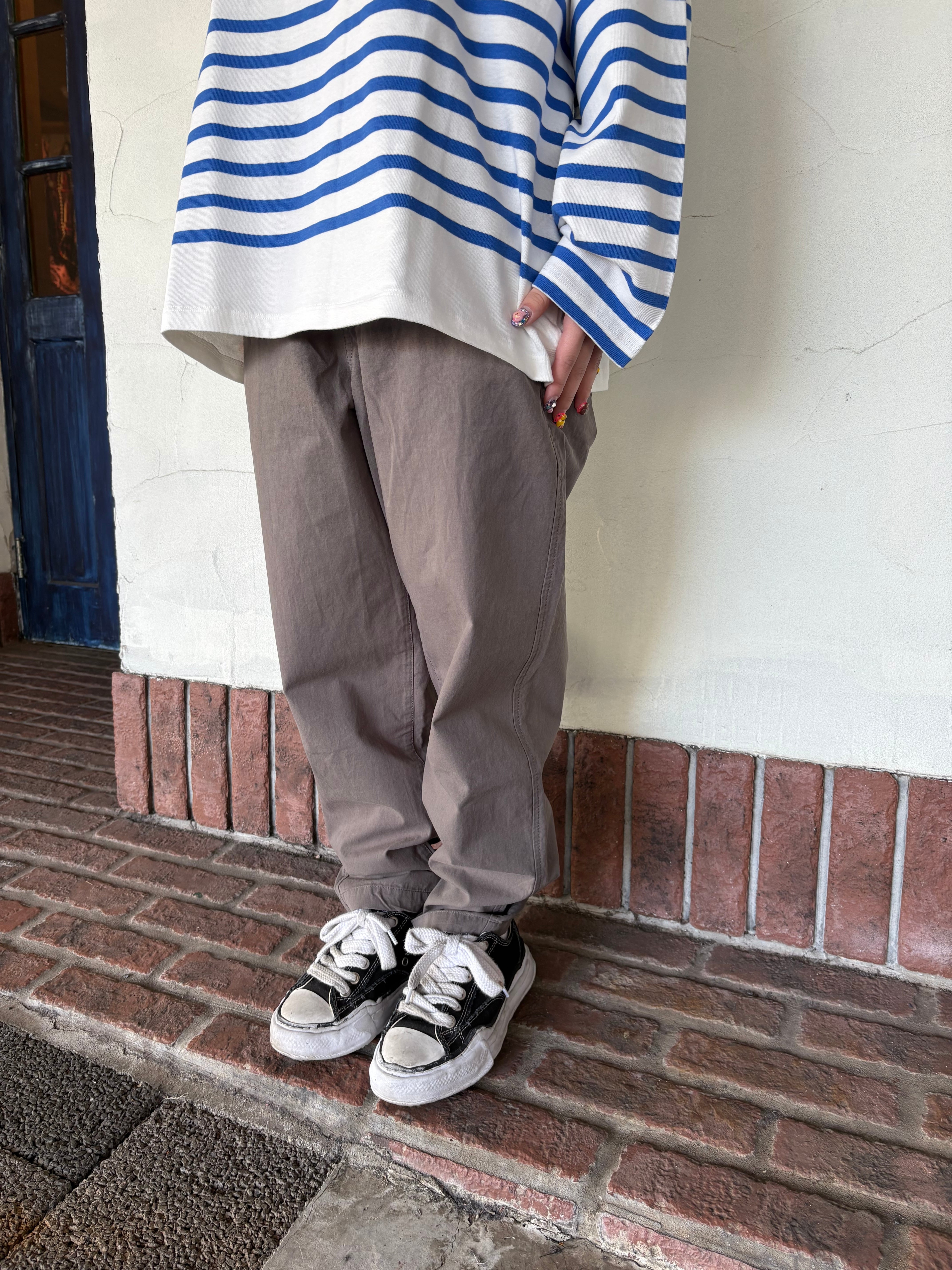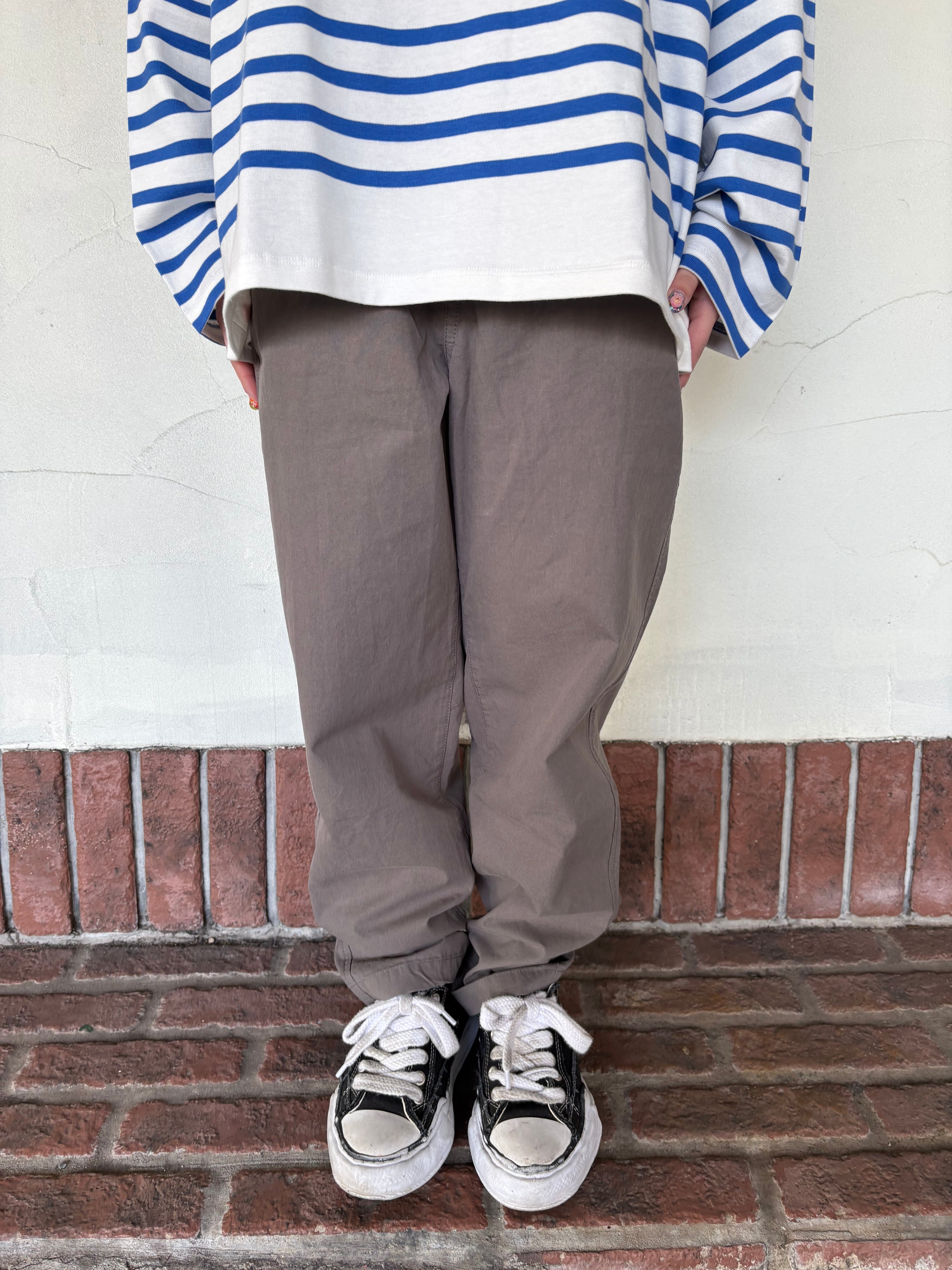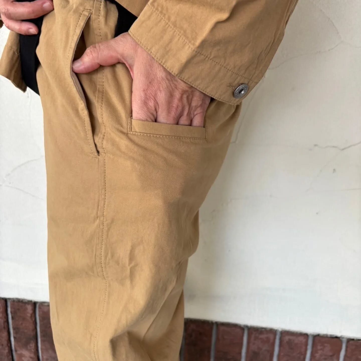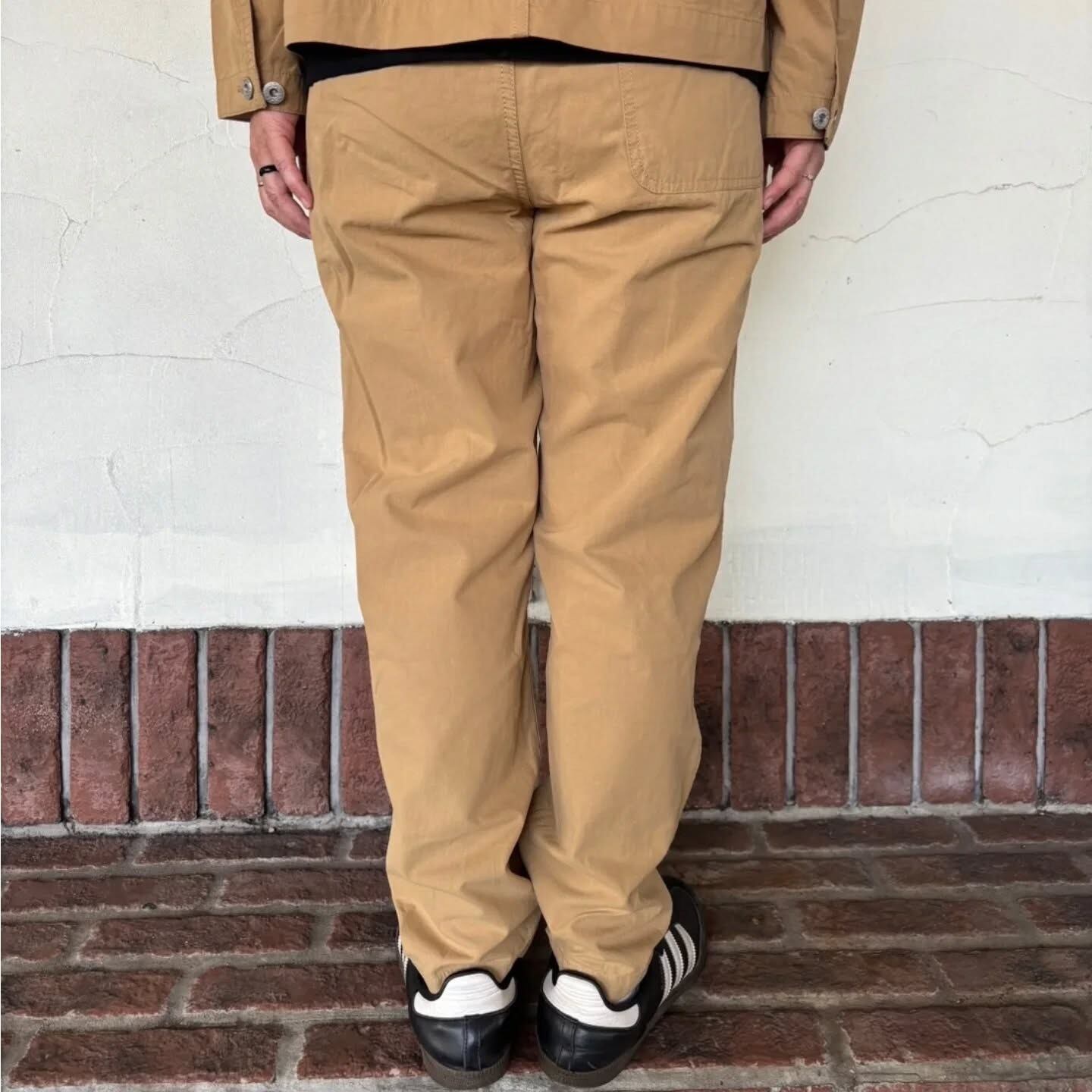 薄手ですがハリがあって丈夫な素材、馬布を使用したワークパンツです。太すぎず、細すぎずのゆるやかなテーパードのシルエットで、トップスを選ばずすっきりとしたカジュアルスタイルに仕上がります。軽い着心地でこの季節にピッタリのアイテムです!