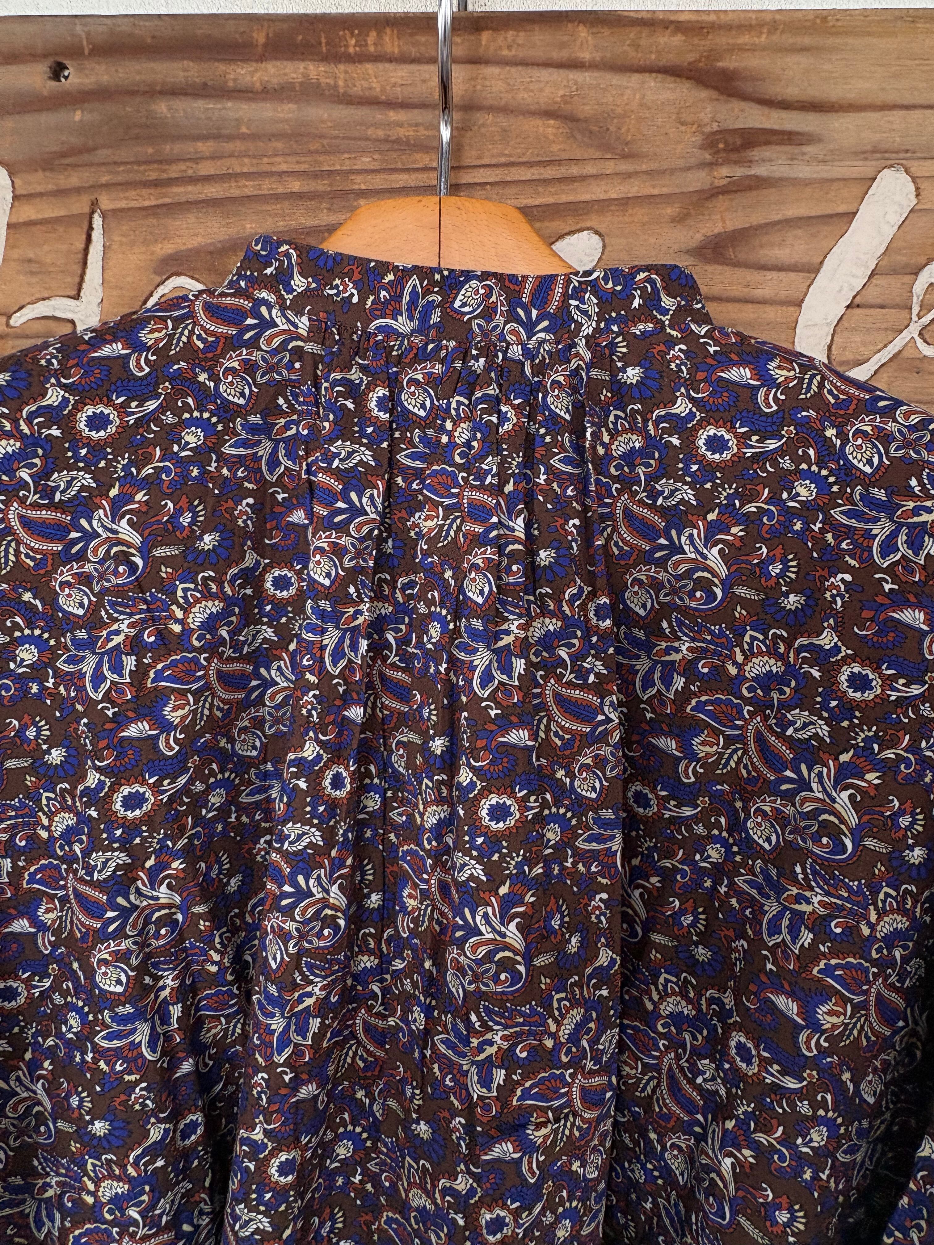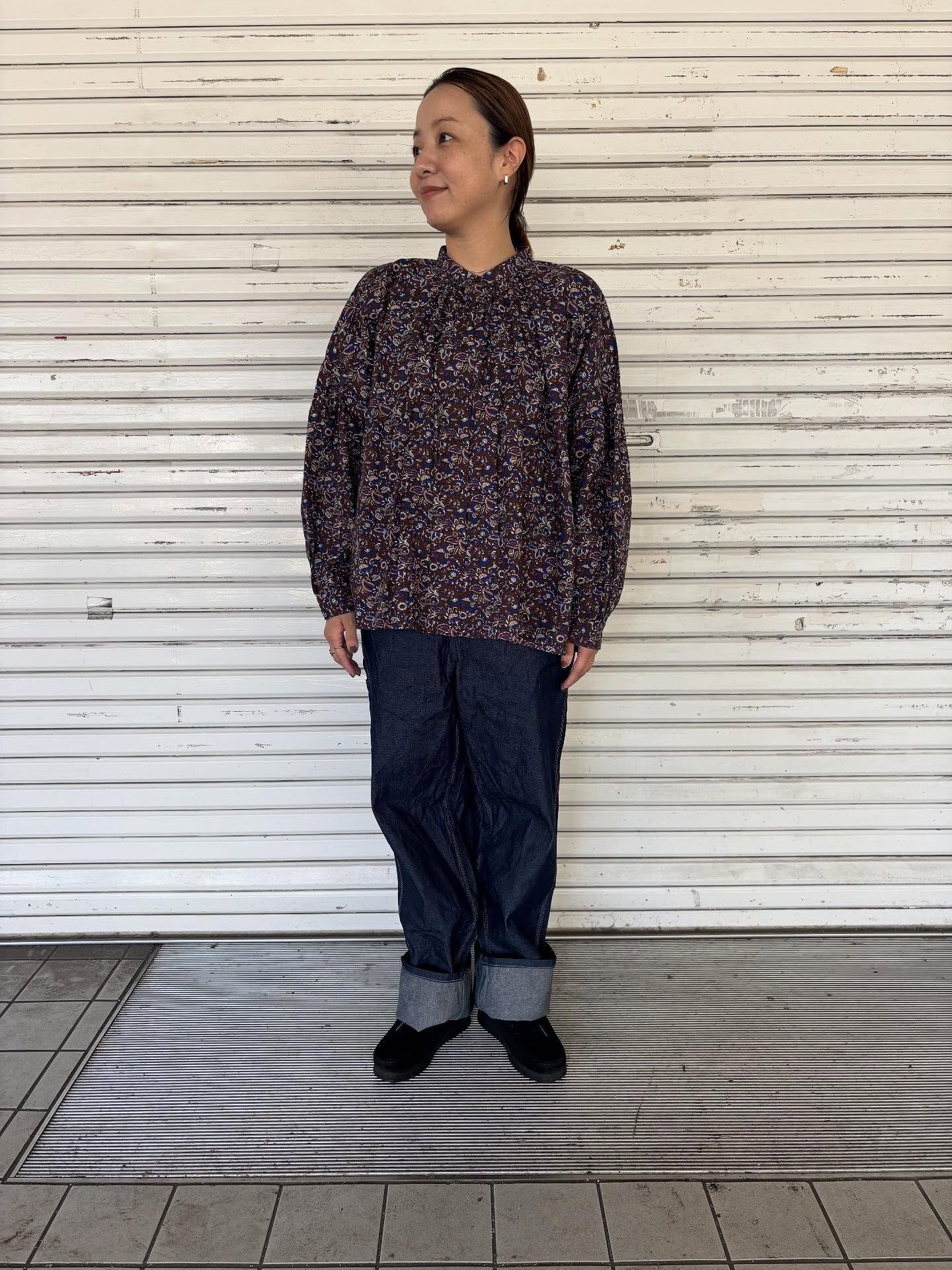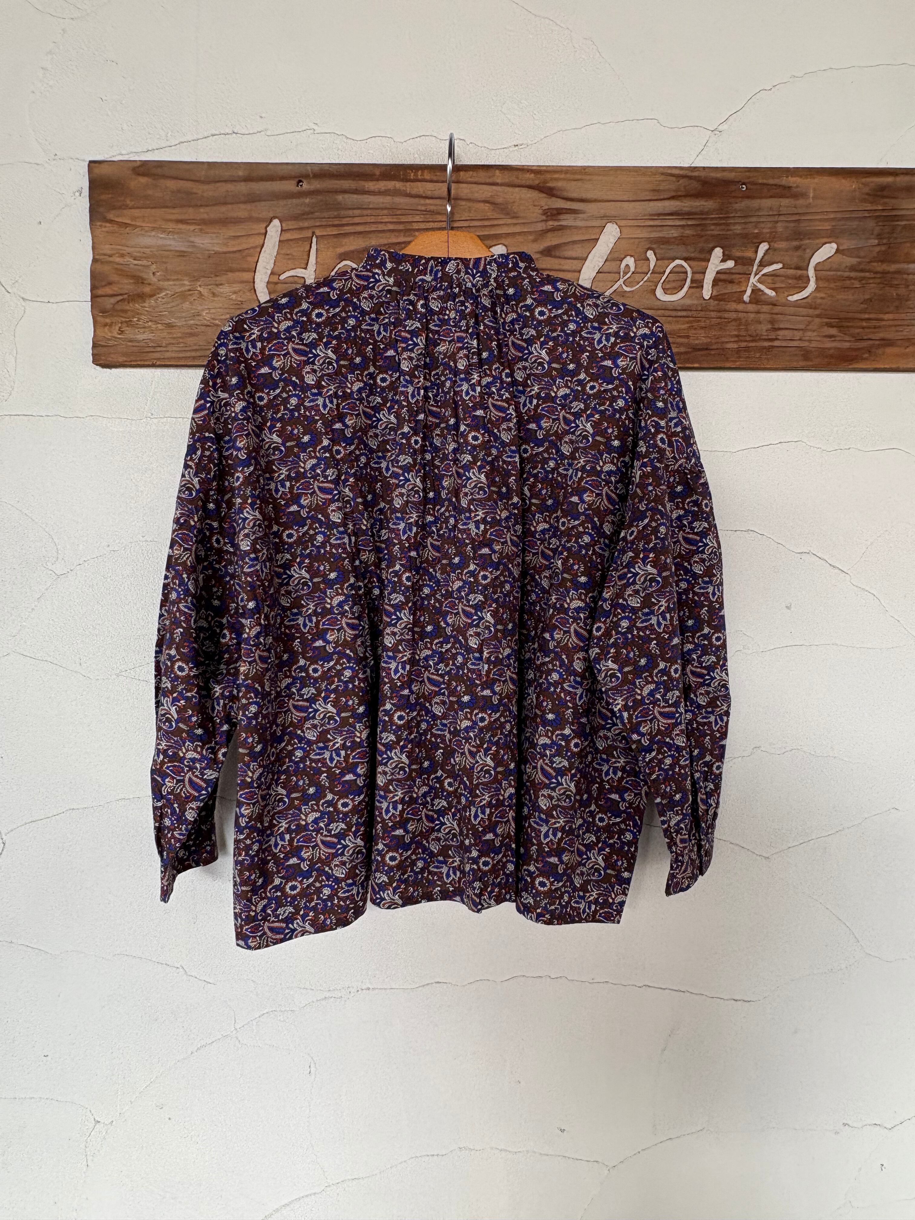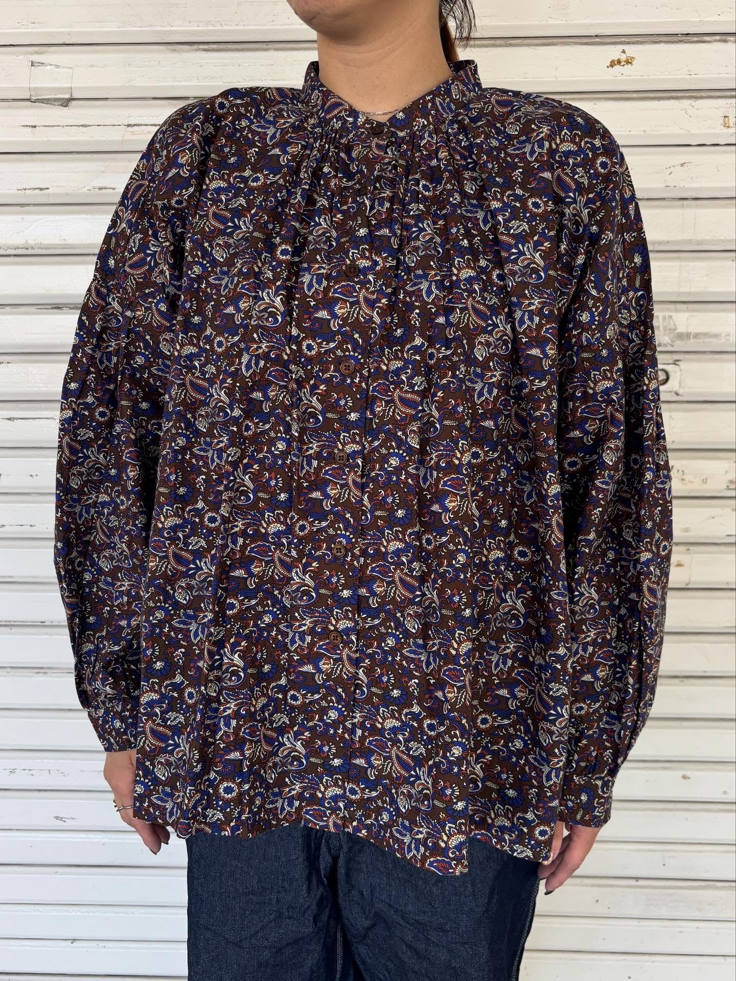 ハリと上品な質感が魅力のコットンポプリン素材を使用しています。甘くないヴィンテージライクな花柄がデイリーに使いやすく、上品なスタイリングが完成します。愛らしいコンパクトなバンドカラーや、背中のギャザーによる大らかなシルエットも特徴です