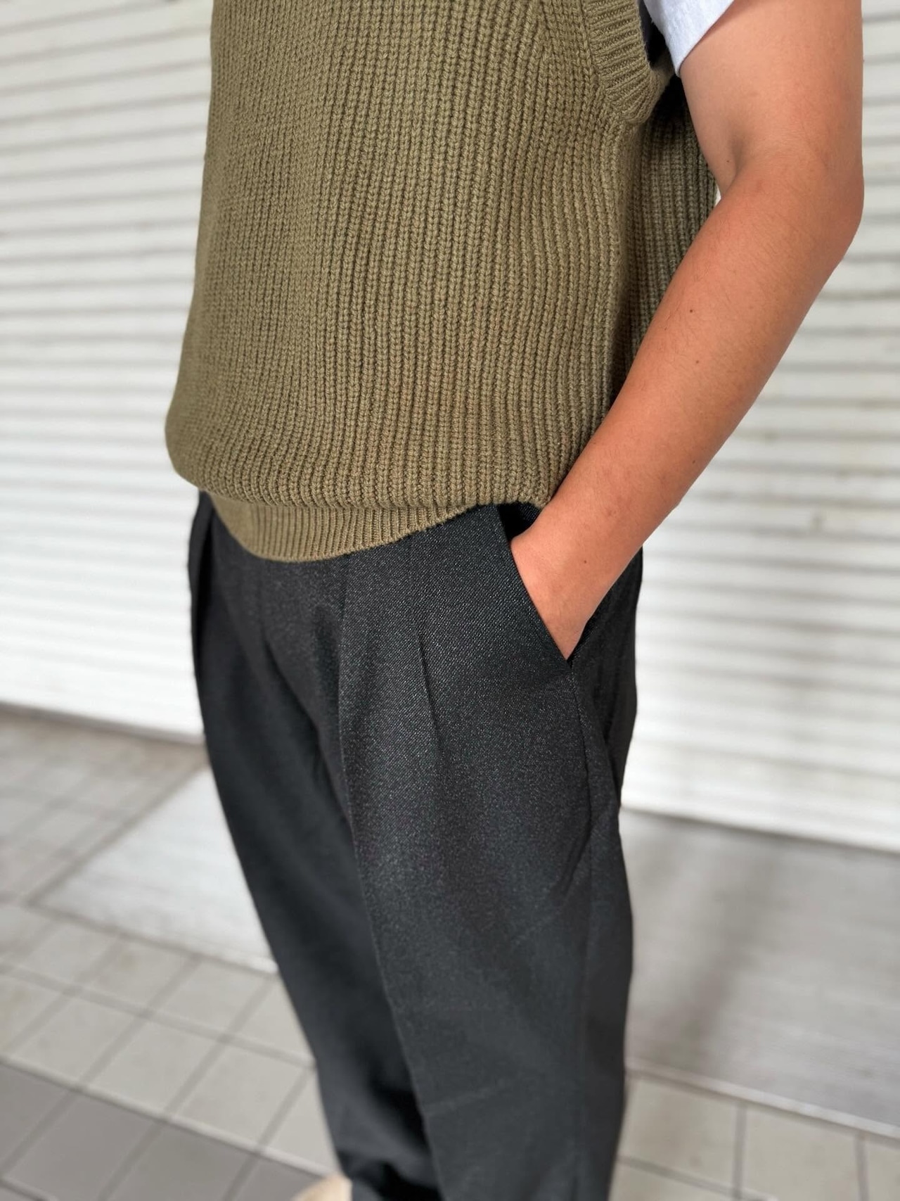 少しワイドなテーパードシルエットのツータックトラウザー。