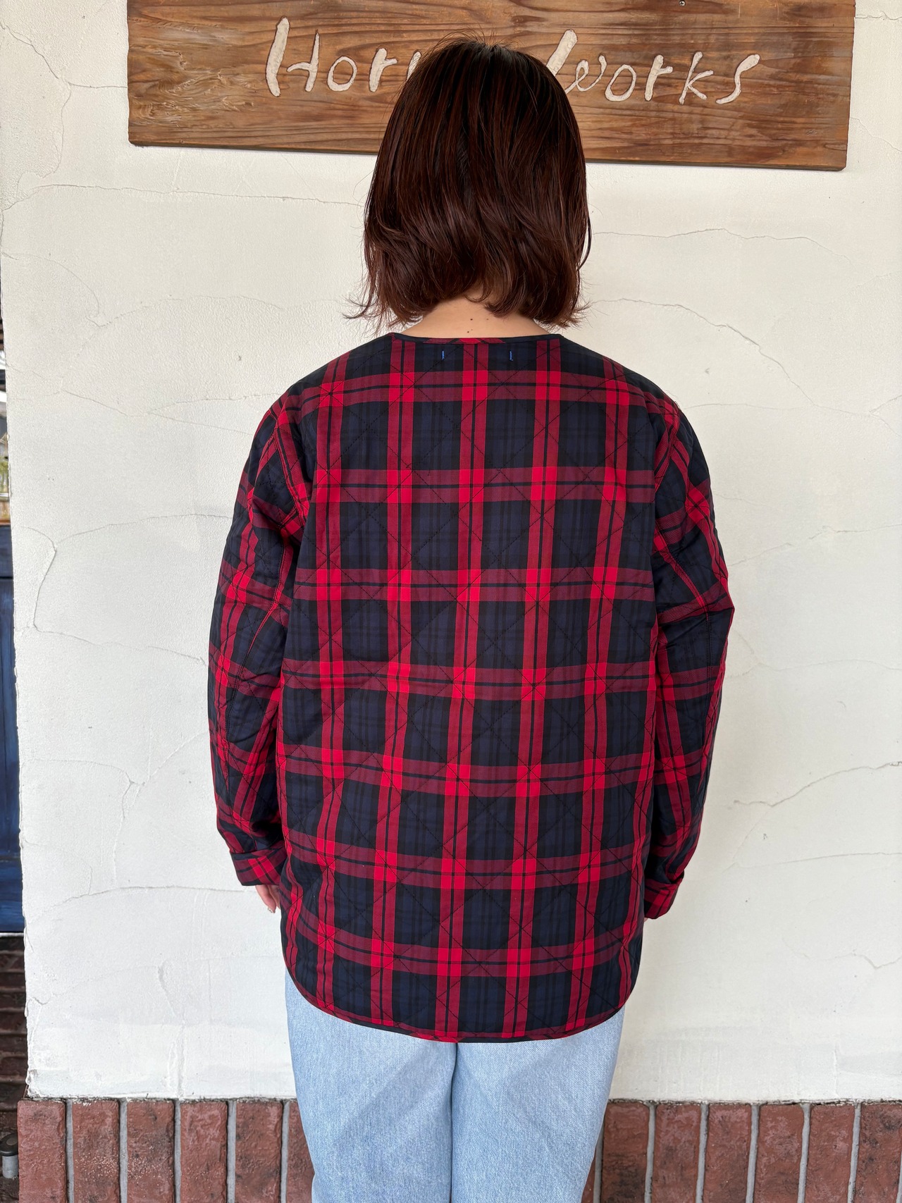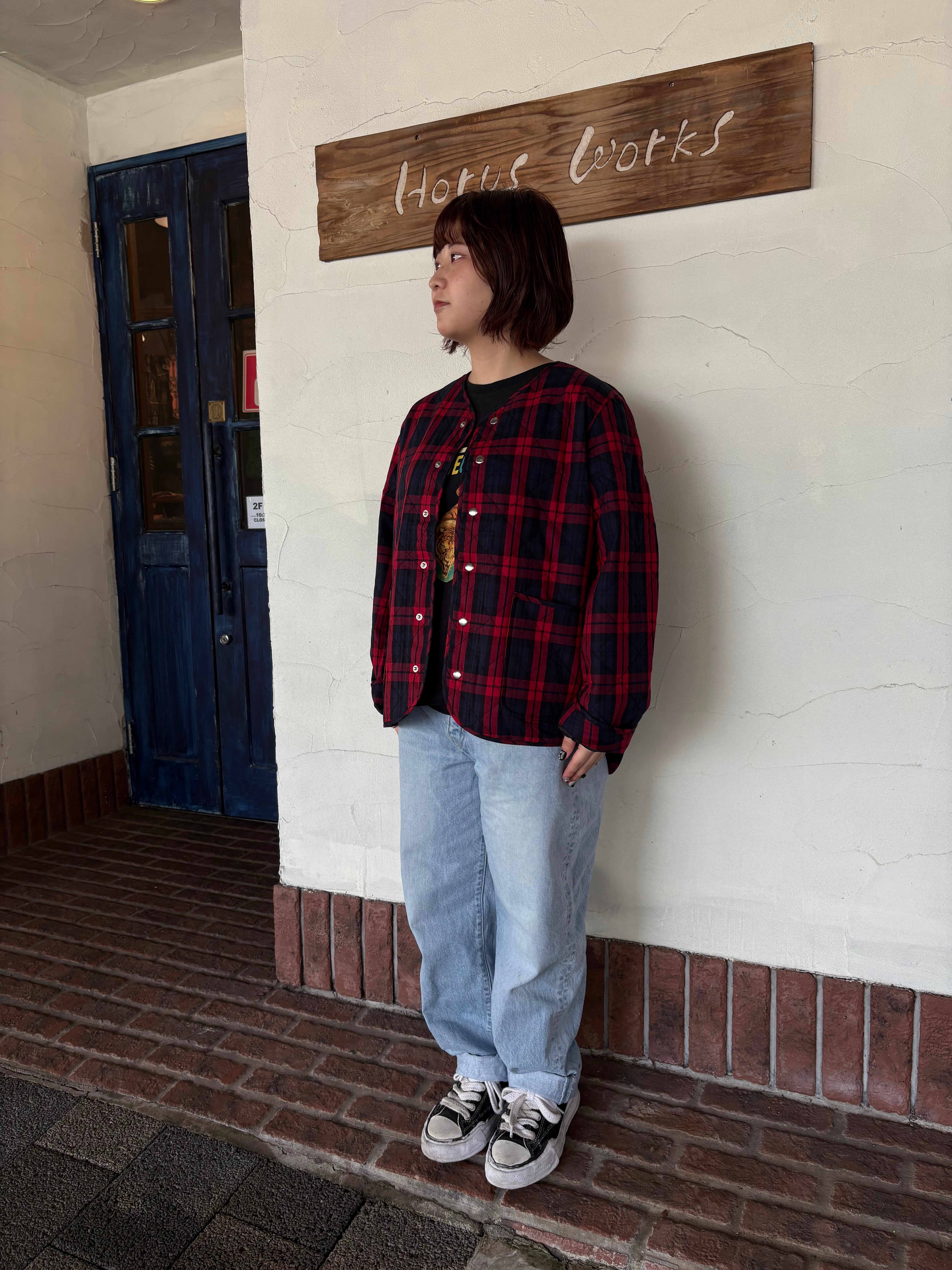 寒い日のお出かけに気分を上げてくれる、チェック柄のキルティングジャケットです!