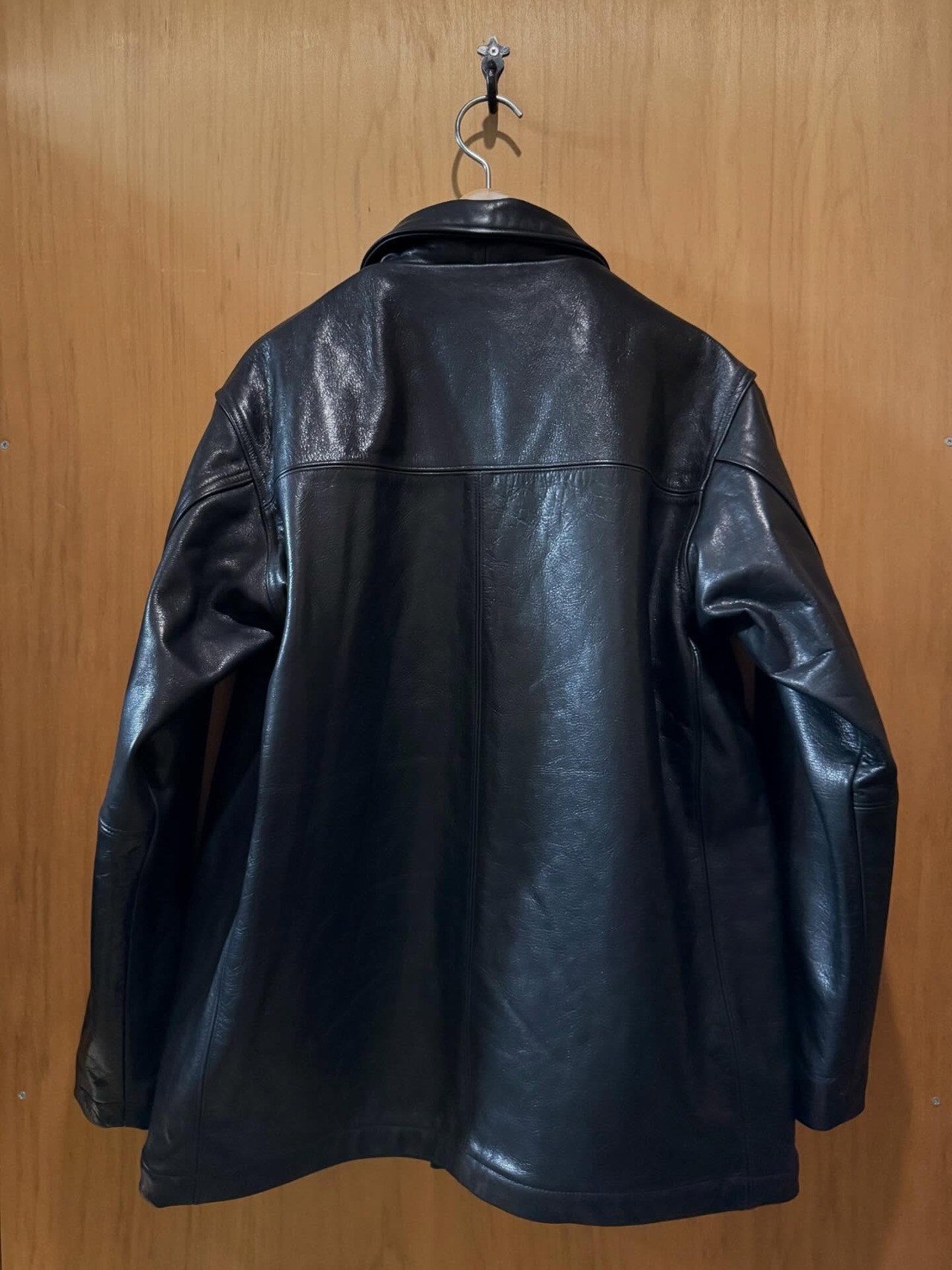 当時のカーコートは厚みがあり硬く無骨な印象であるが、このアイテムは牛革をクロム鞣しと、植物タンニン鞣しの両方の方法で鞣されたセミベジタブルタンニン鞣しで、柔らかくかつ丈夫で自然の風合いを活かした風合いに仕上げています。