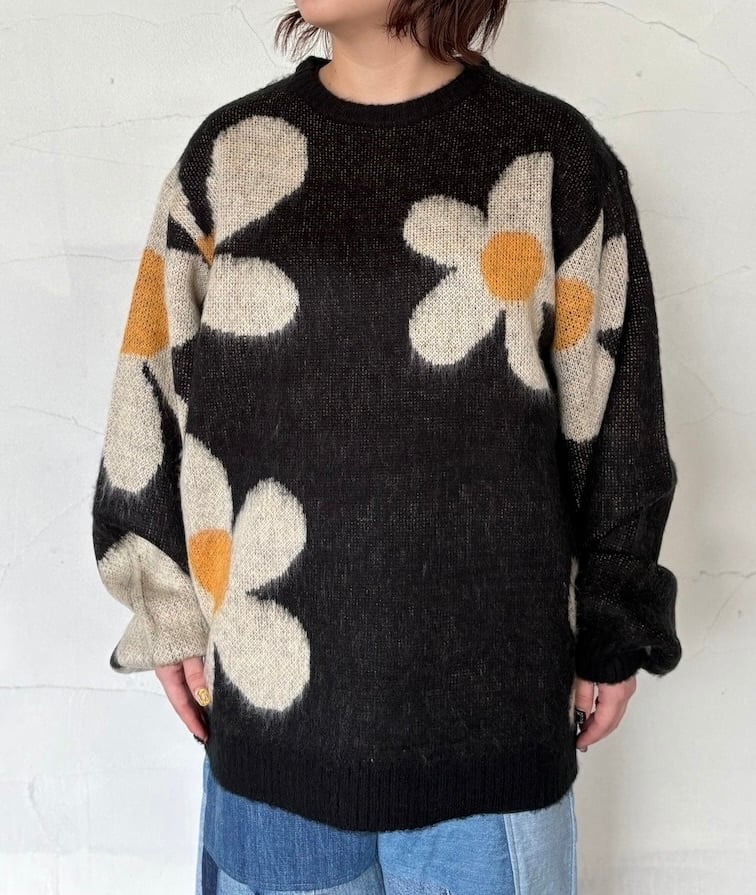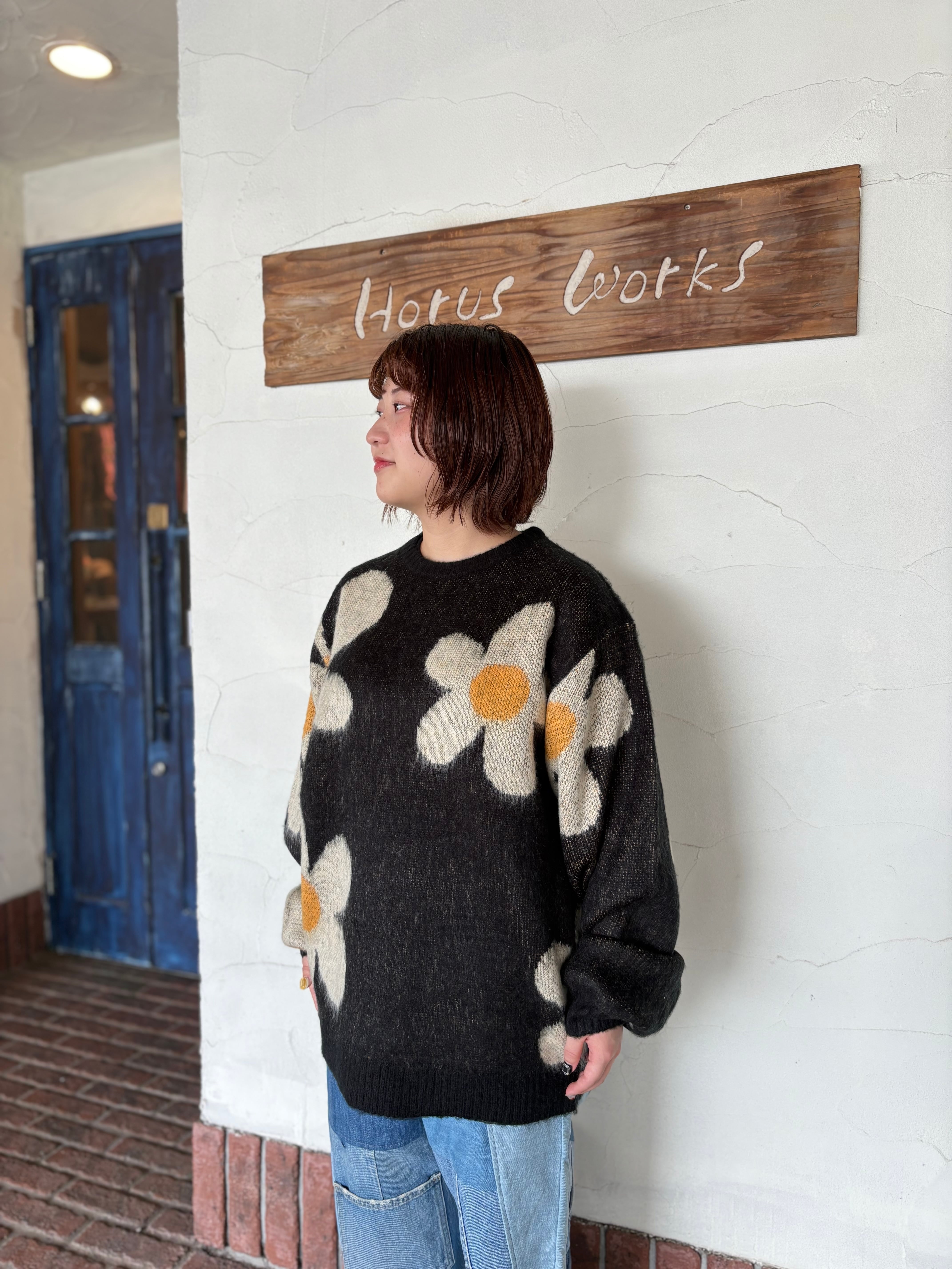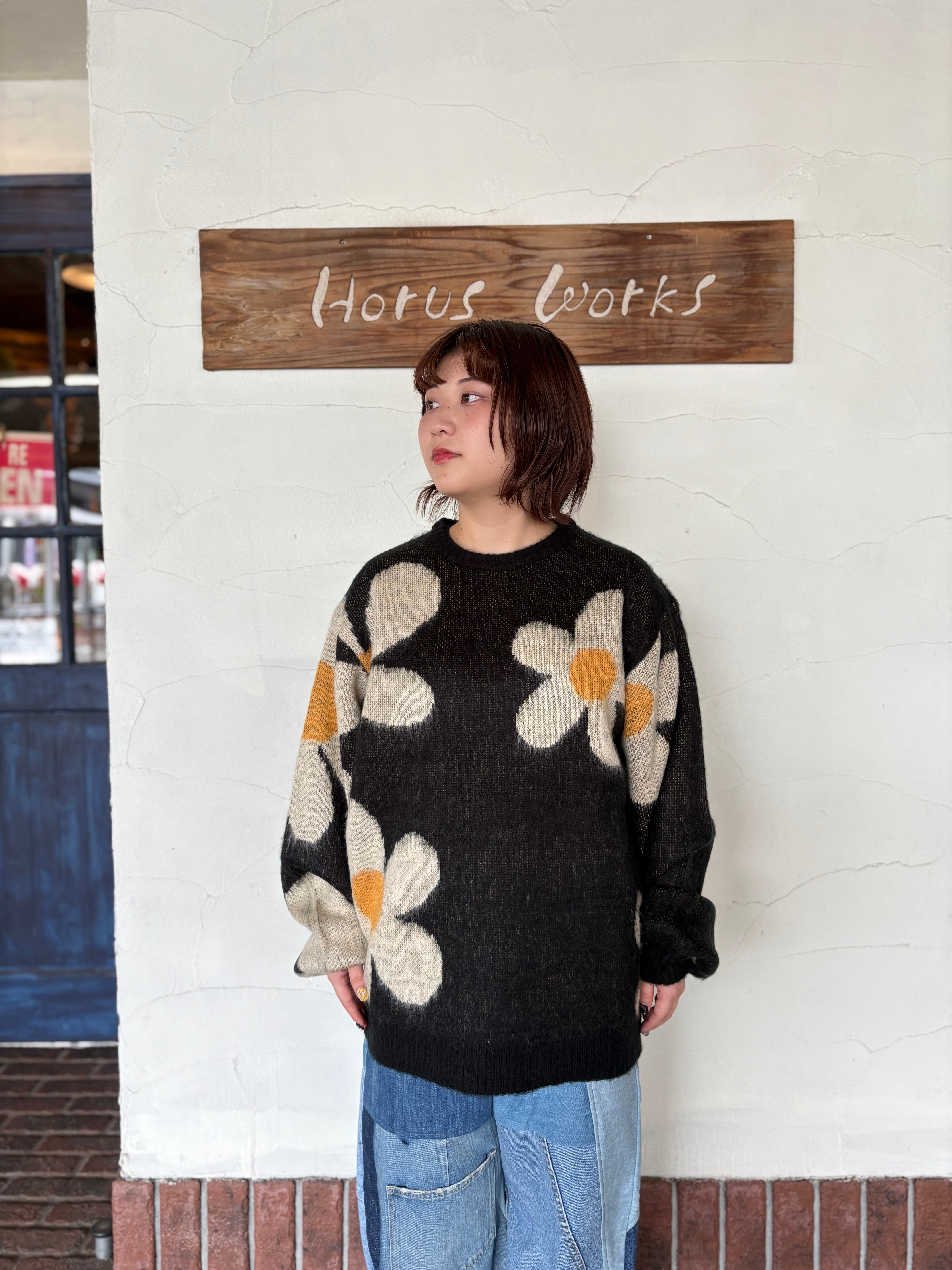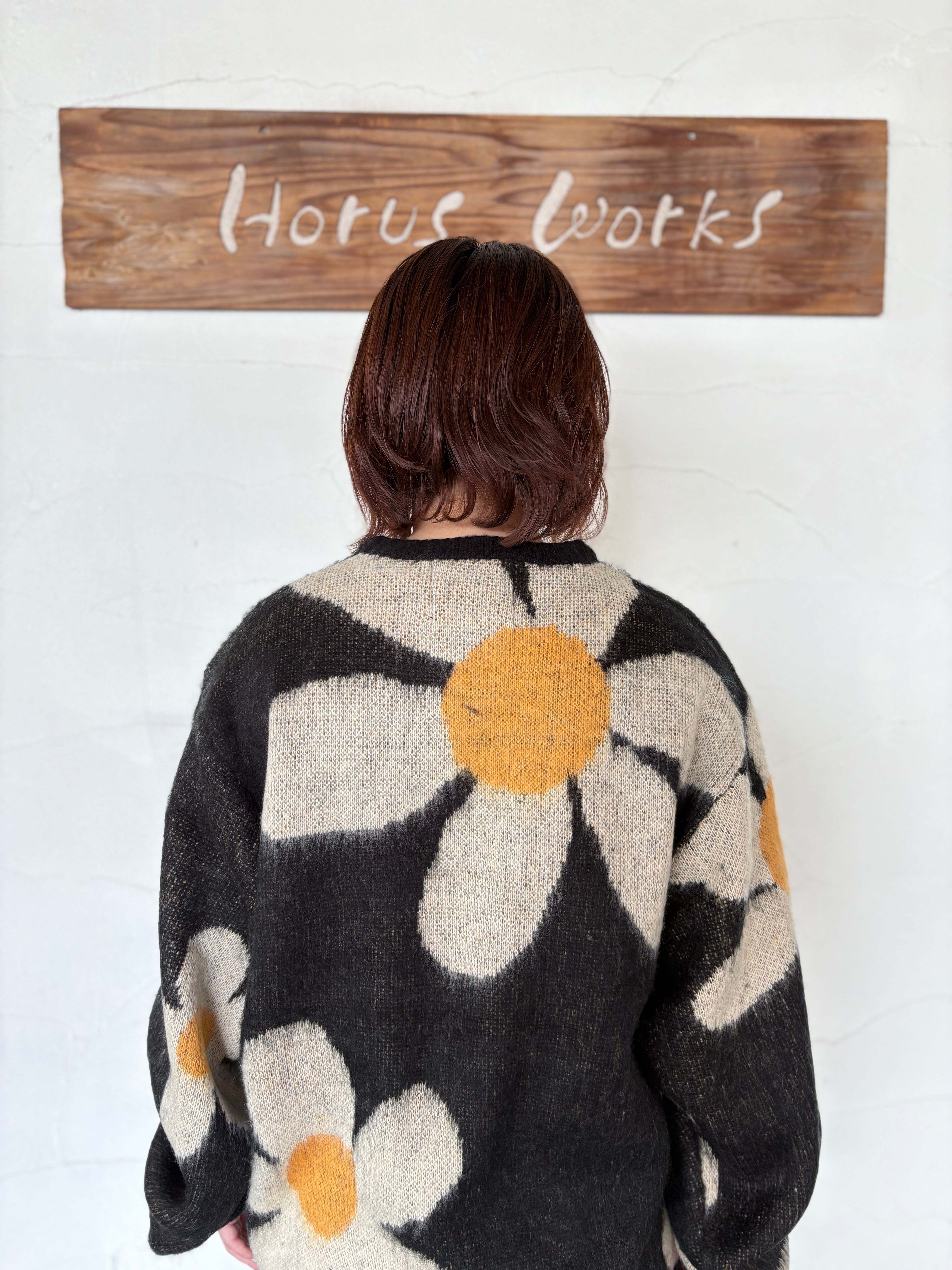 モヘア調アクリル糸でヴィンテージモチーフの様々な柄をジャガードで表現しています。