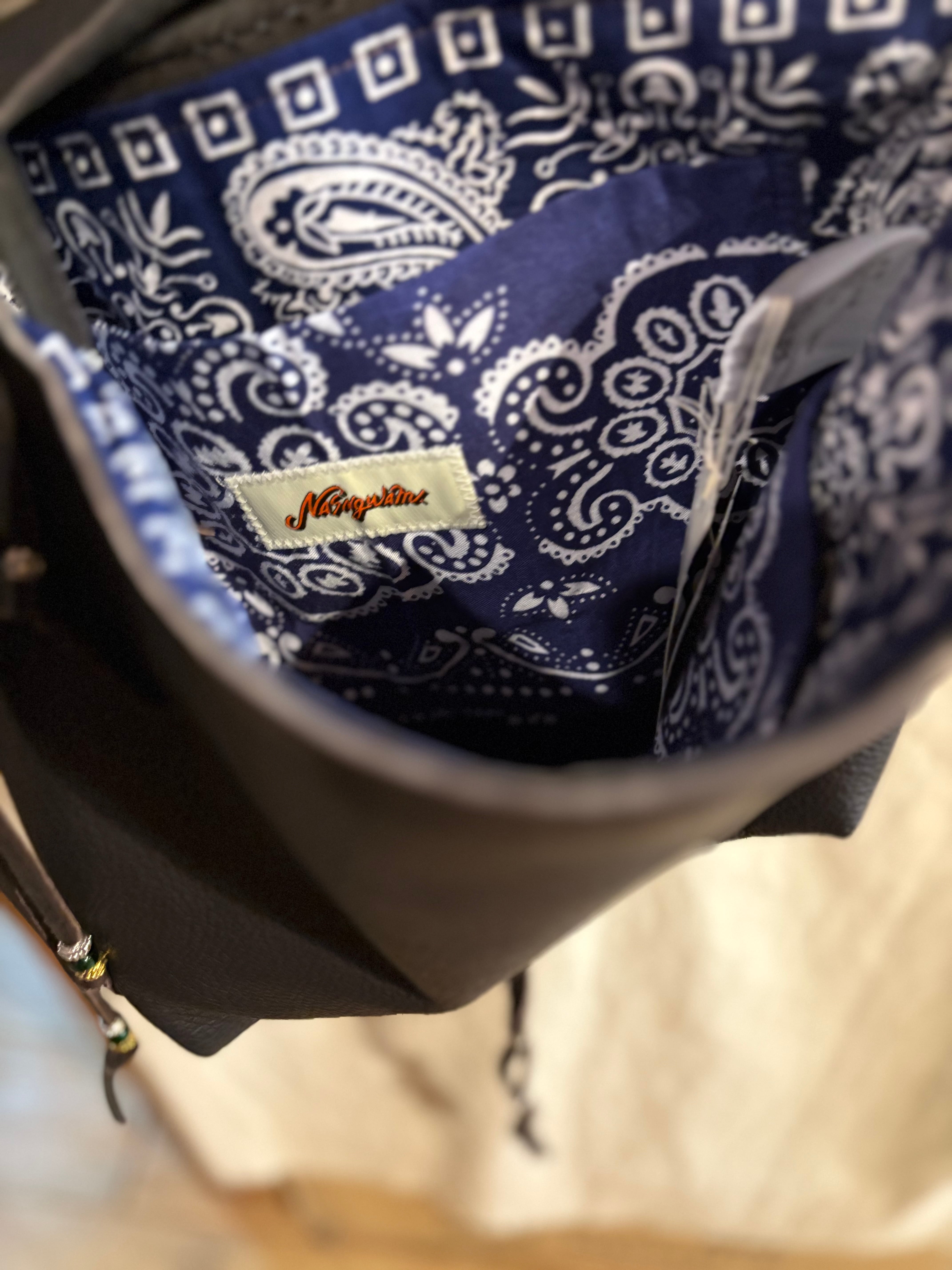 贅沢なレザーやハンドステッチ、鹿角ボタン、ビーズ飾り、バンダナ裏地など細部までこだわり抜いています。