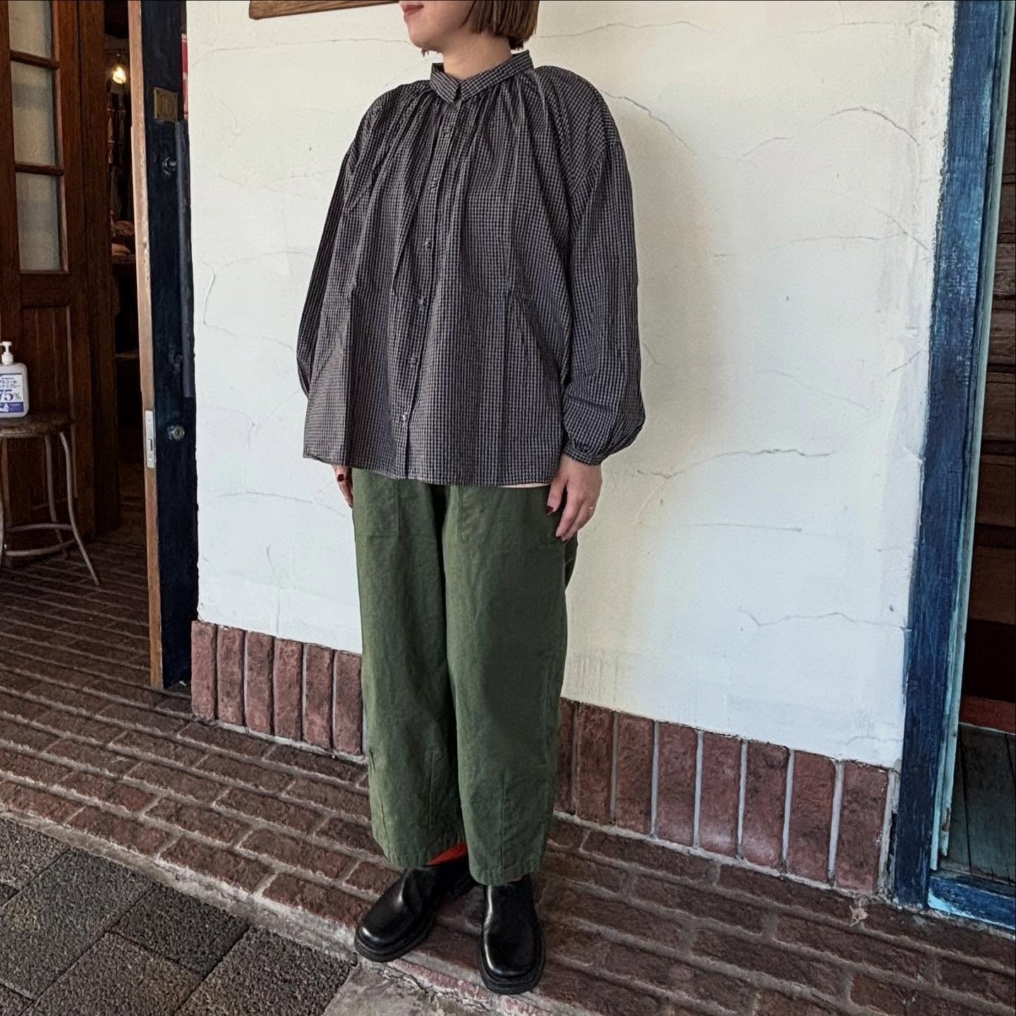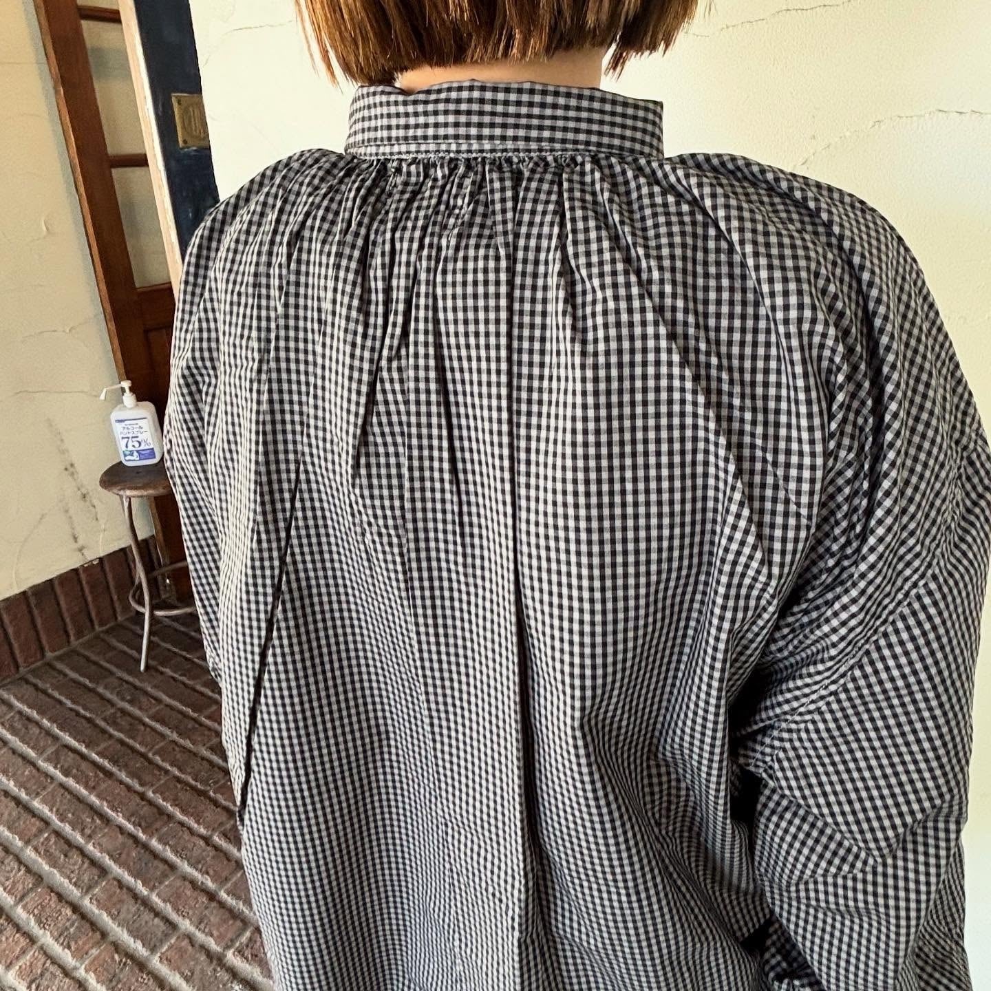 ふんわりとしたシルエットと首元のギャザーが女性らしい抜け感を演出。