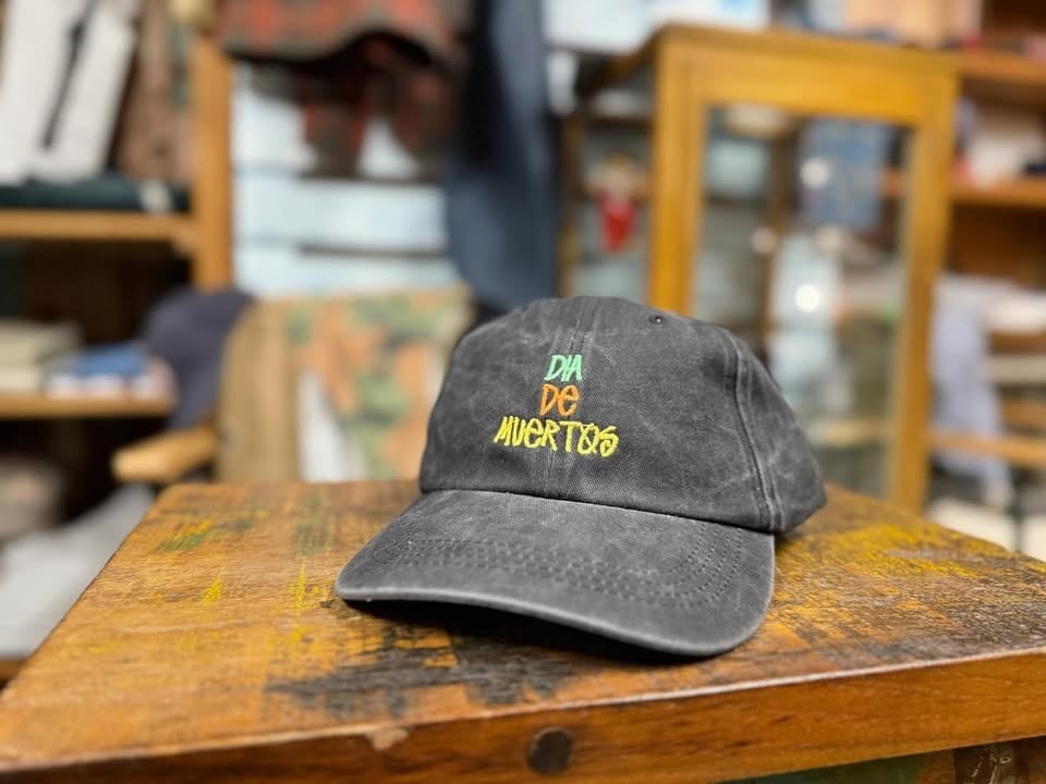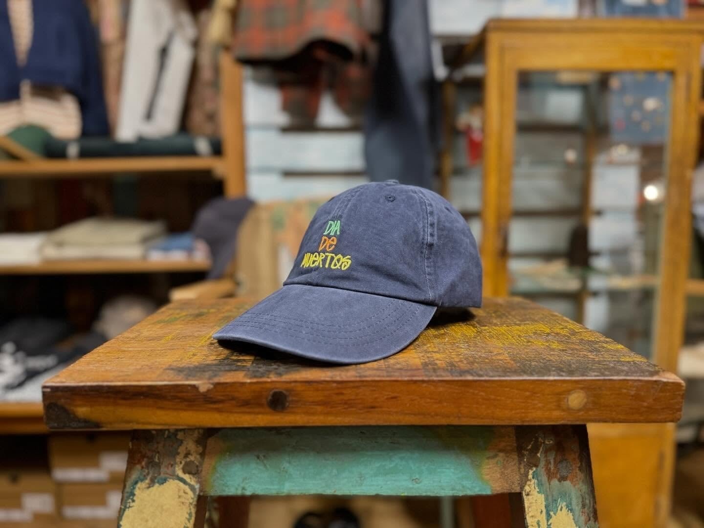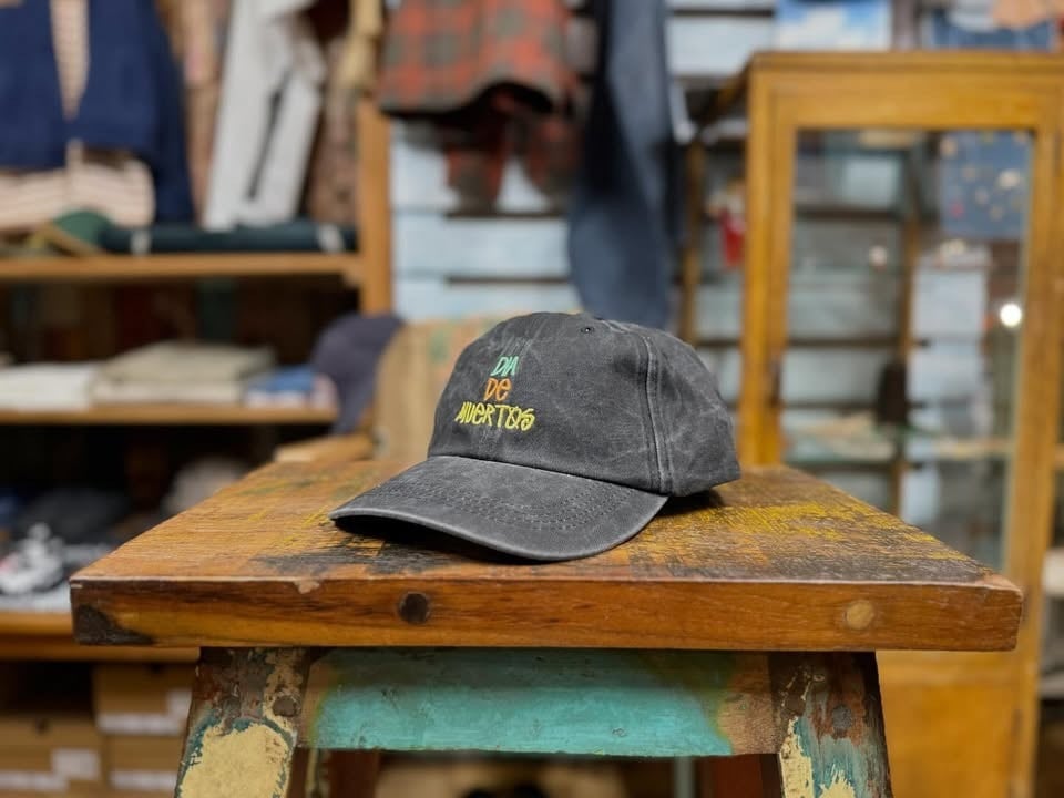 強めのウォッシュをかけたベースボールキャップのボディーに刺繍を施した一点。NISSIN CAPボディを使用。