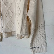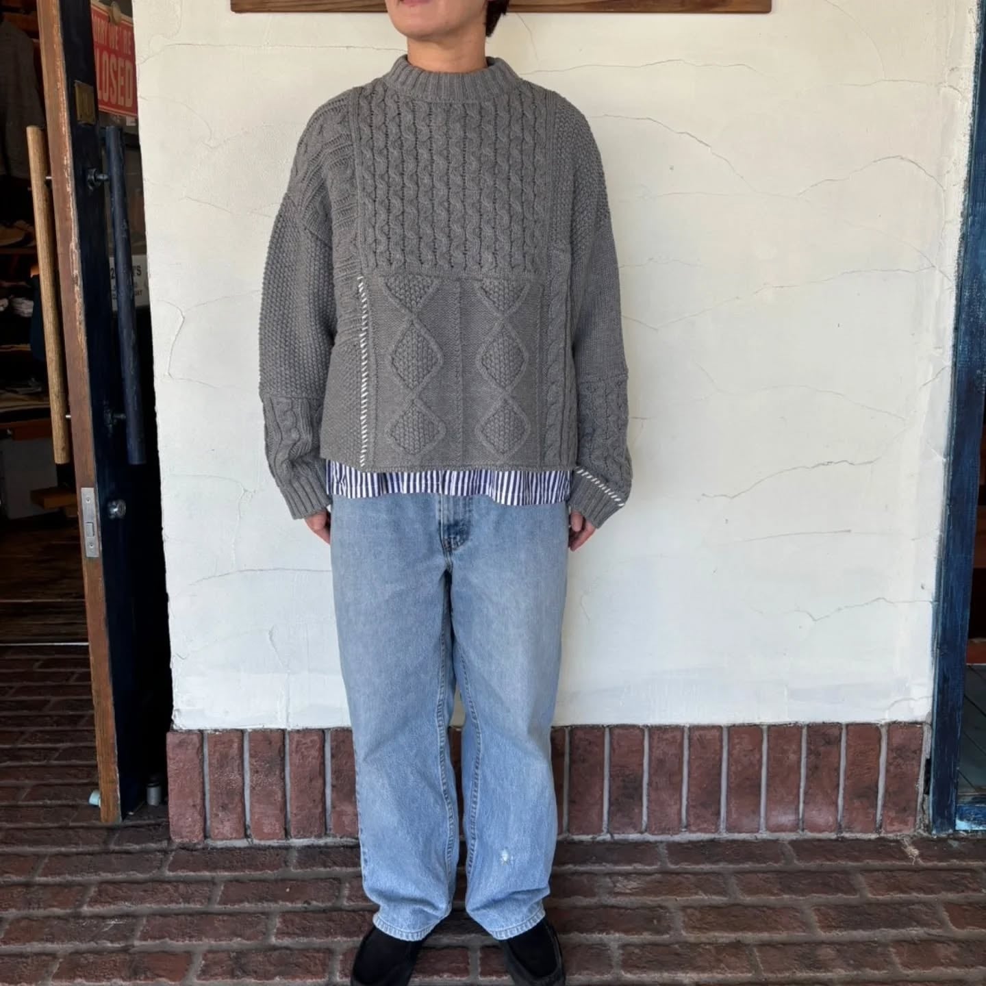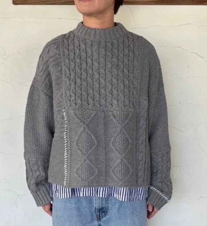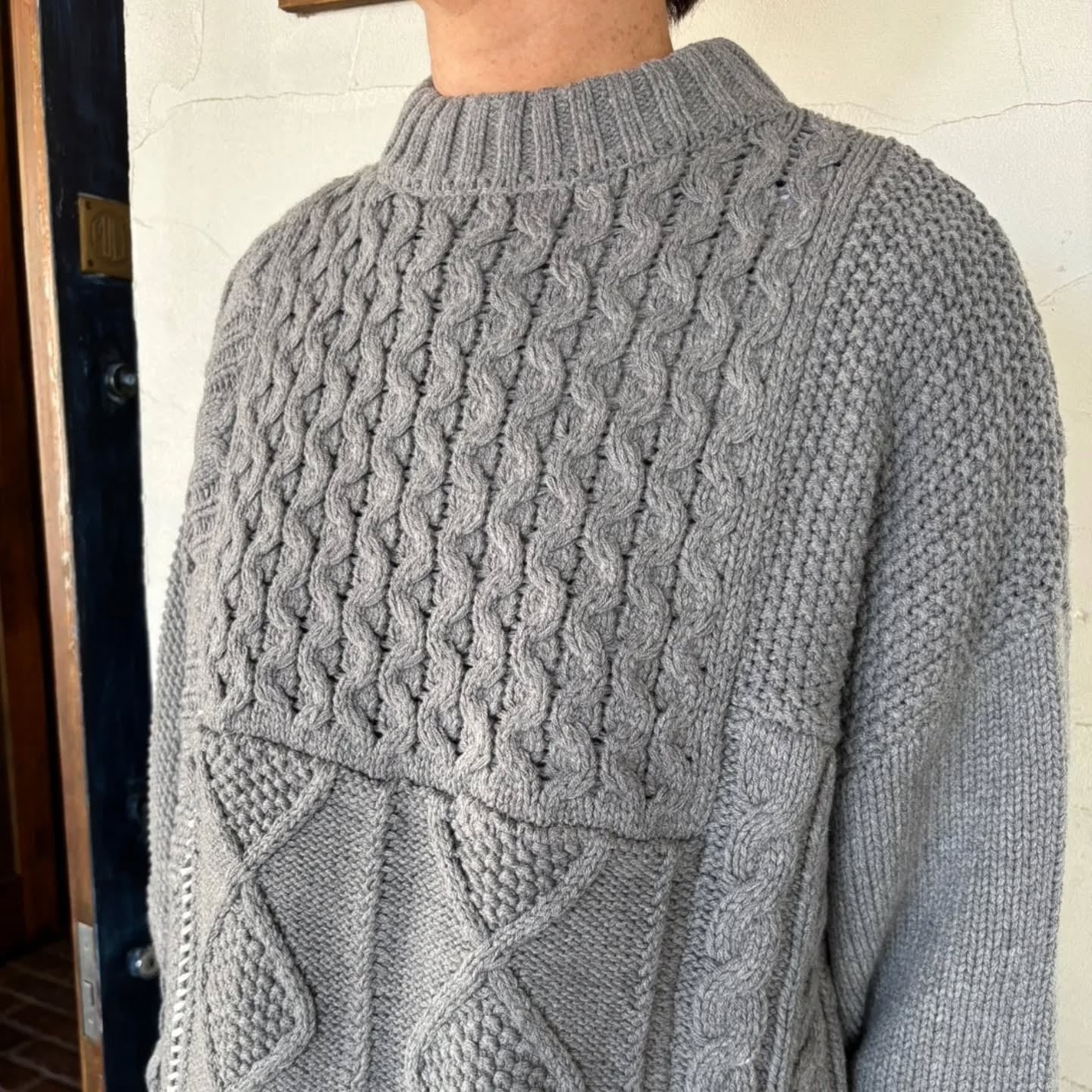 パッチワークのようにつなげた遊び心のあるケーブルニット。1枚で主役になるデザインで冬のコーディネートが楽しくなる1枚です!