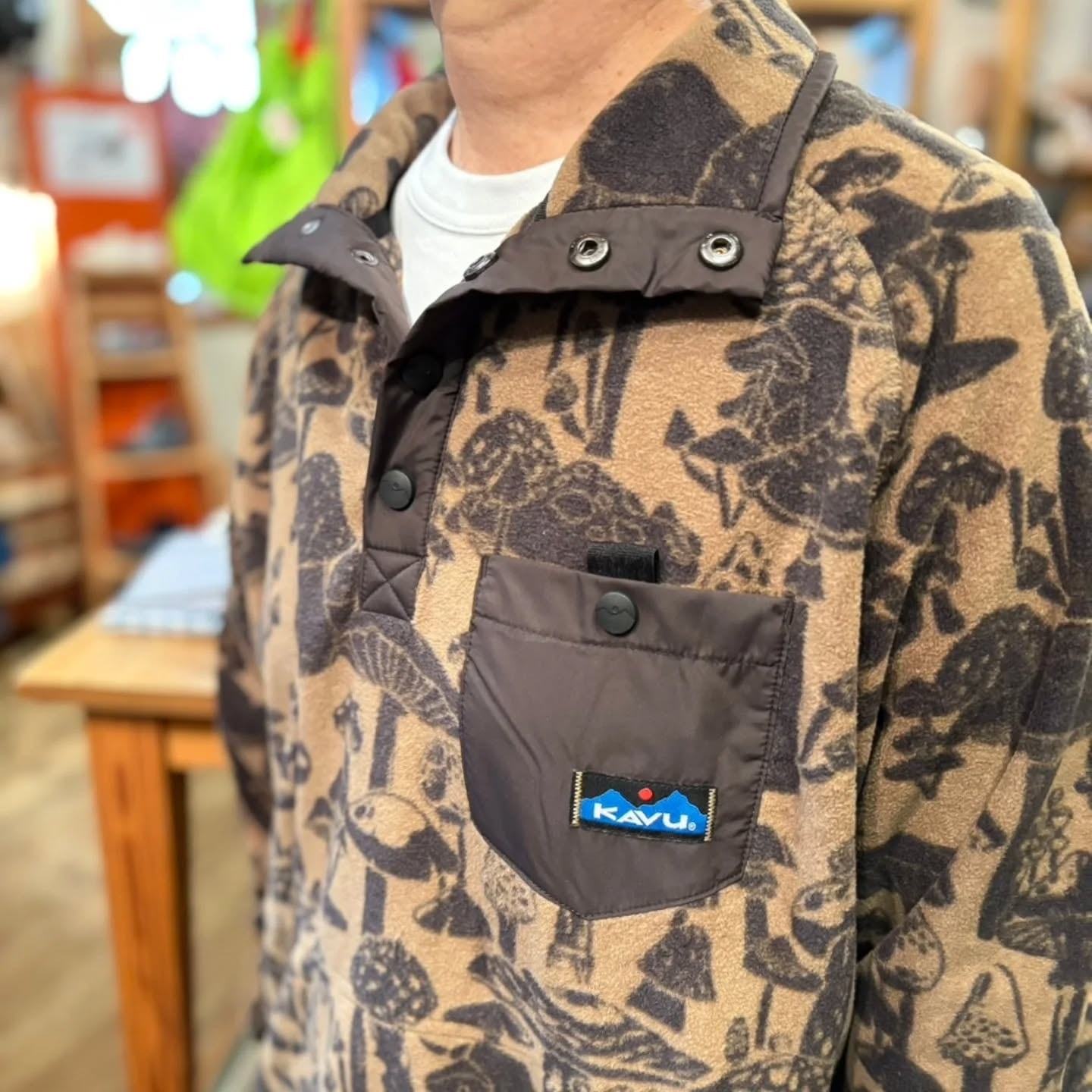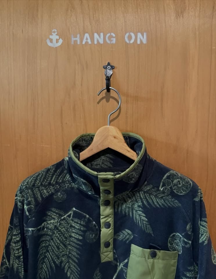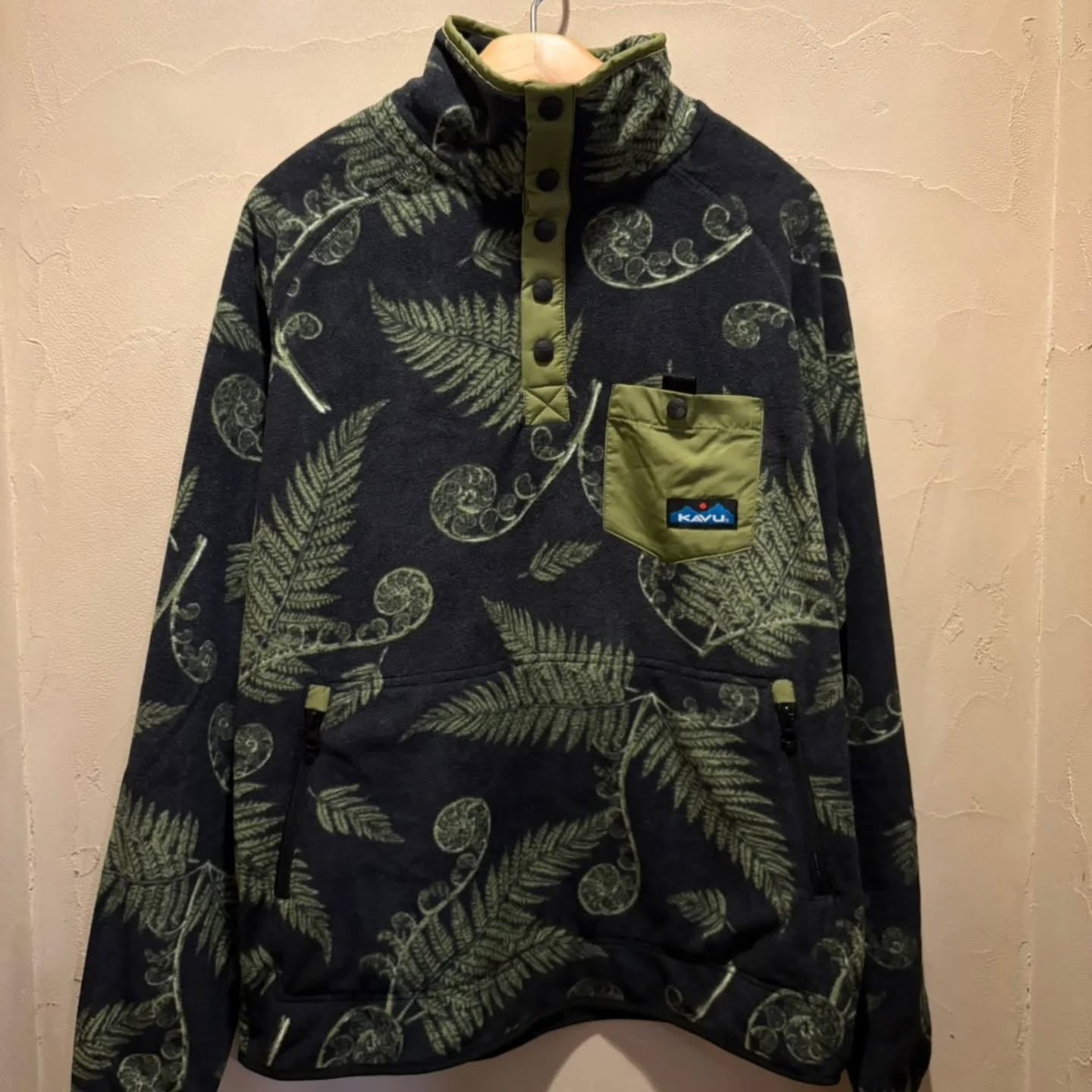 KAVUティーナウェイはプルオーバータイプのフリースです。スナップボタンで首元の温度調整ができるフリースで、左側にはスナップ式のポケットが付いています。とても個性的なフリースの柄はデザイナーがKAVUの為だけに書き起こしたオリジナルデザインなのも嬉しいポイントです!