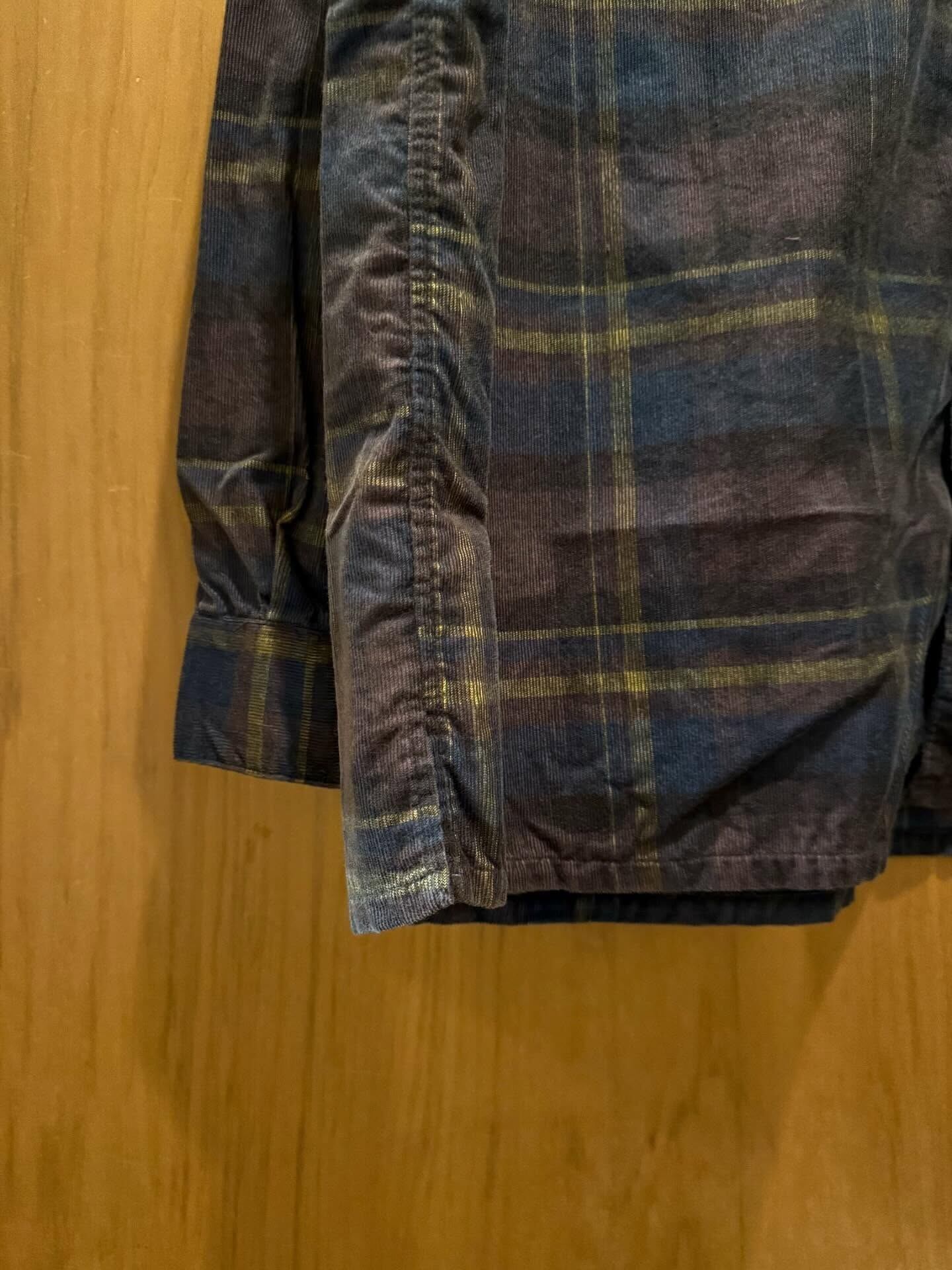 コットン100%の細畝コーデュロイ生地を用いて、チェック柄に仕立てたファティーグシャツ。