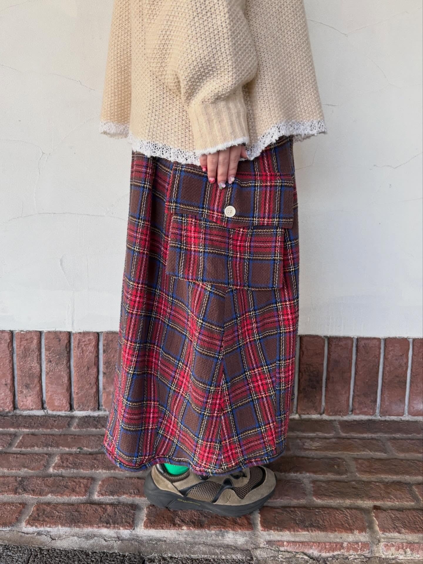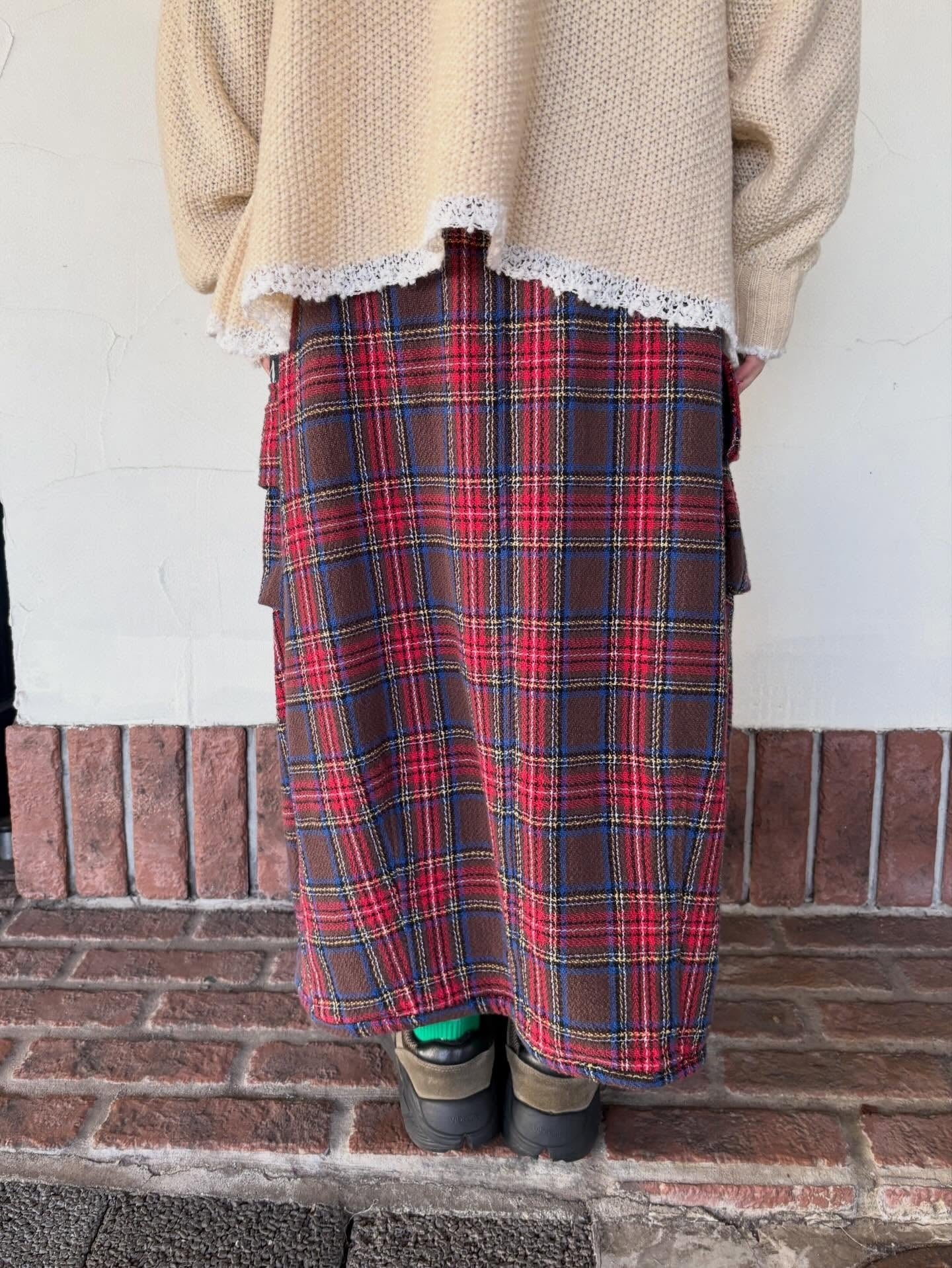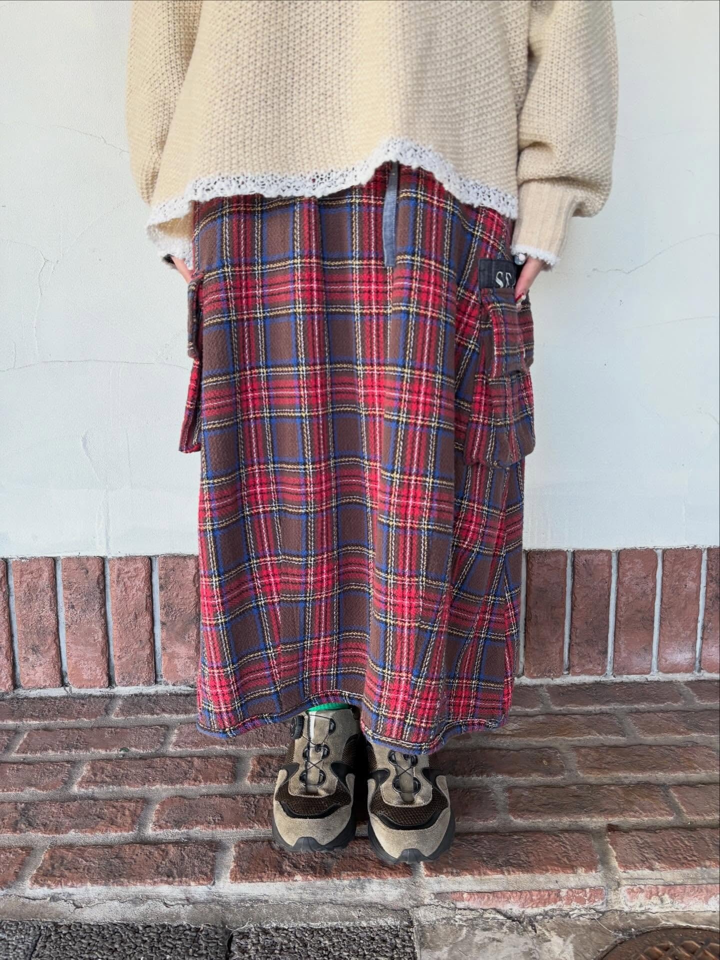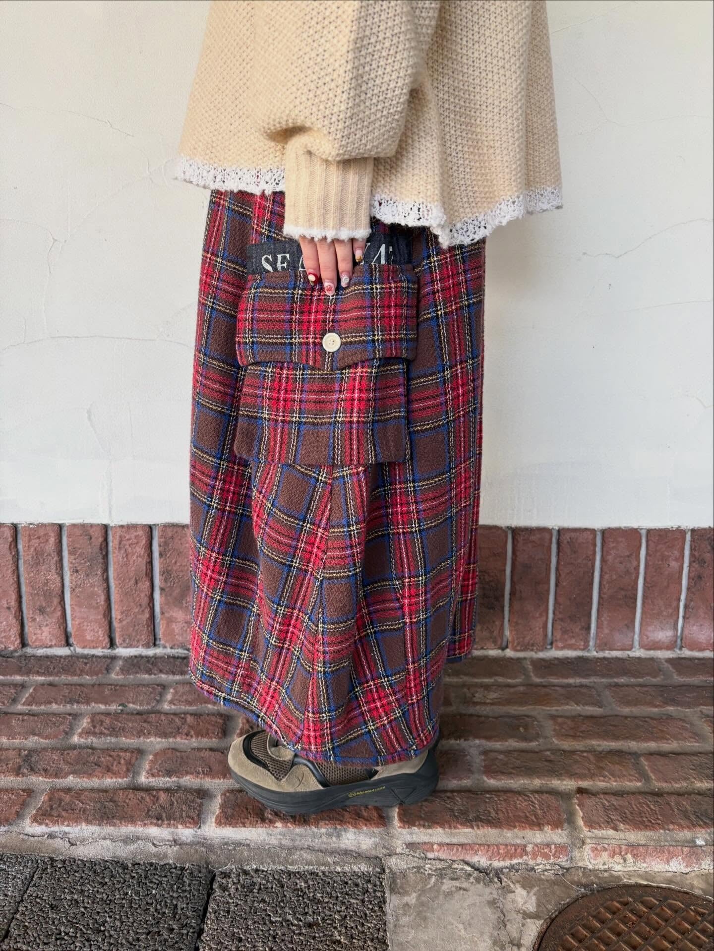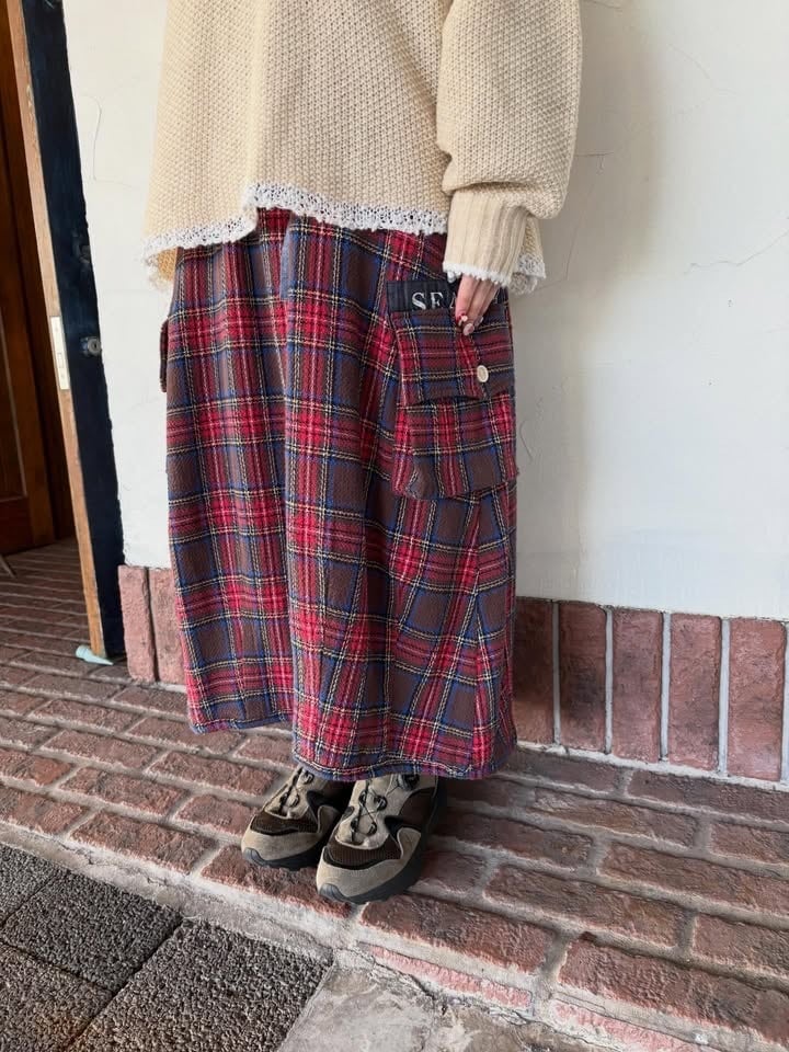 コットン100%のざっくりとしたタータンチェック。梨の皮のようなざらざらとした凸凹が特徴的な梨地織のアムンゼン生地です。立体感のあるたっぷりとしたポケットとヘリンボンデニムにステンシルプリント。可愛らしいgirlyな生地とワークテイストのアンバランスか快晴堂らしく可愛いです