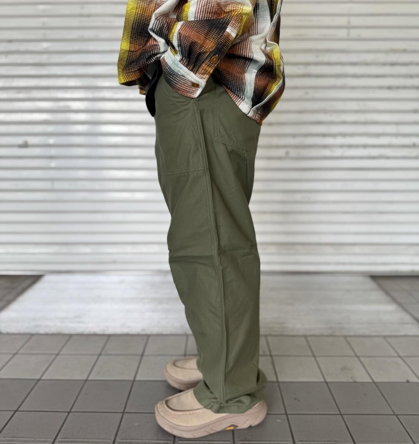 50年代のアメリカ軍ファティーグパンツをベースにしており、細かいディテールは現代風に見直しています。当時は戦地だけでなく軍国内の作業などでも使用され、ユーティリティーパンツとも呼ばれていました。
