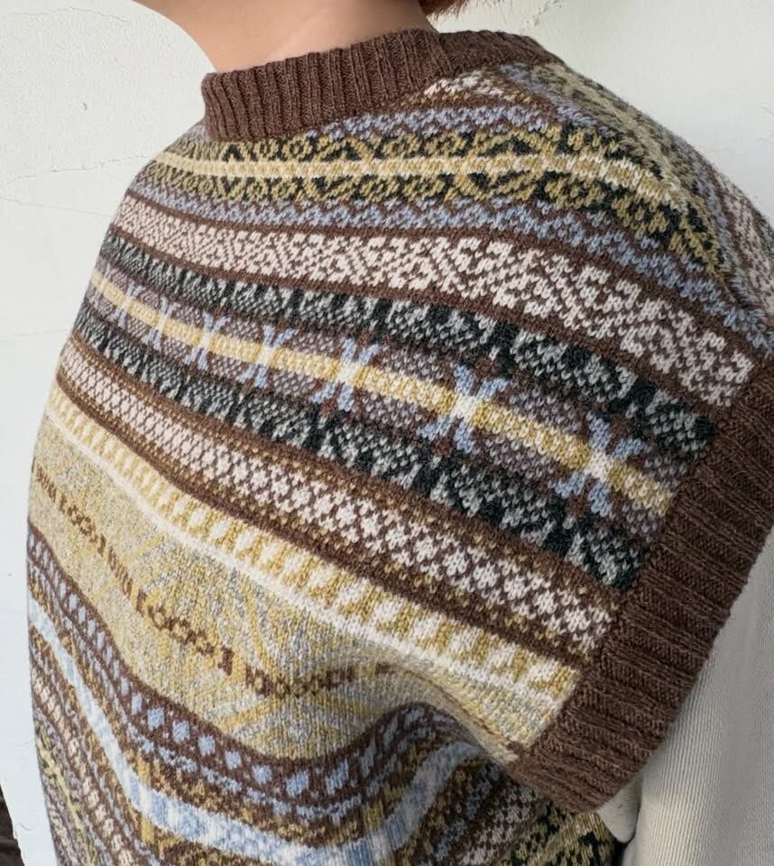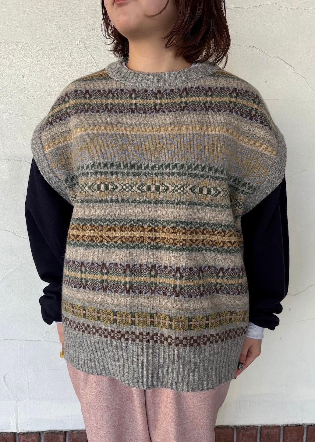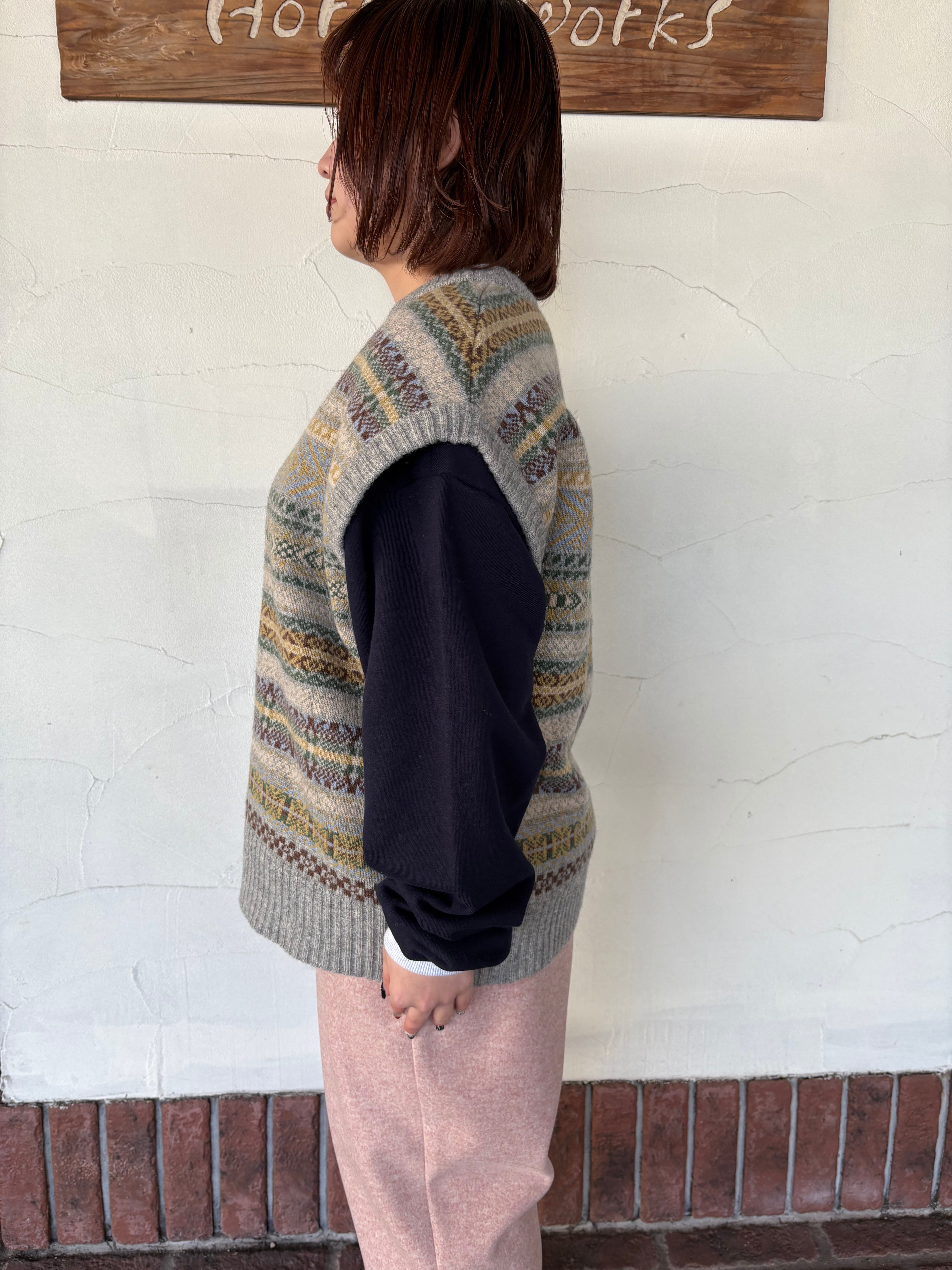 コーディネートがぱっと華やかになるフェアアイル柄ベストです。