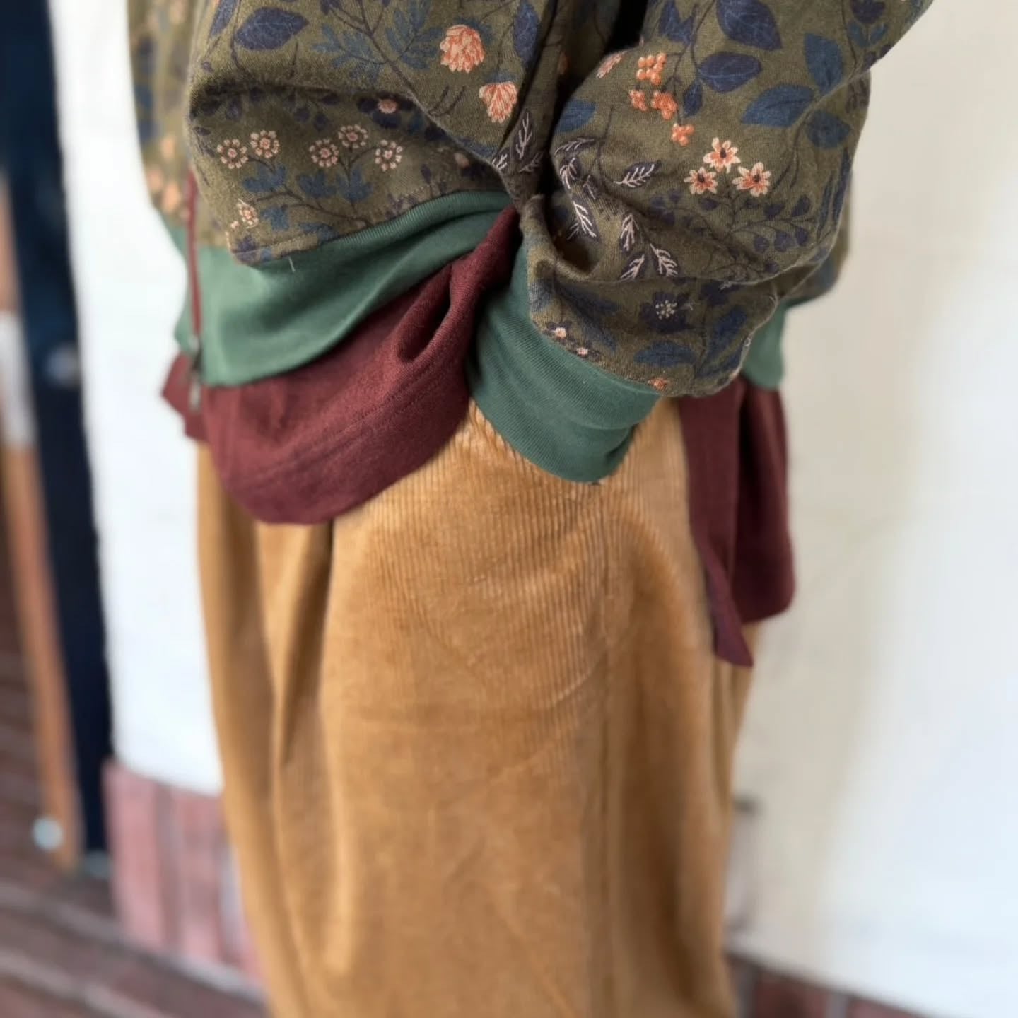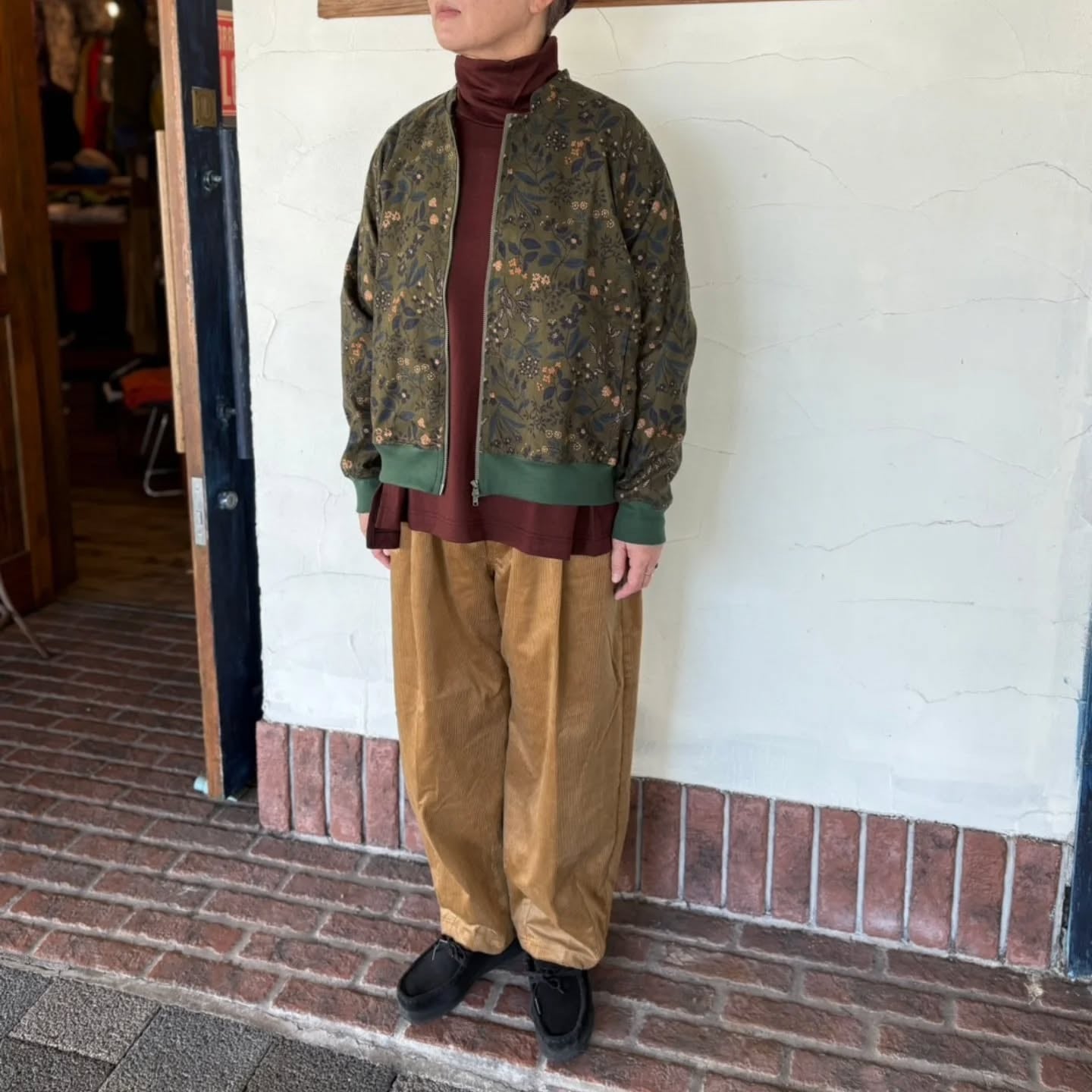 少し光沢があるコーデュロイパンツ。ウエストはゴムと紐で履きやすくなってます。カジュアルには勿論ですが、キレイめなスタイルの時にも役立つ1枚になってます!