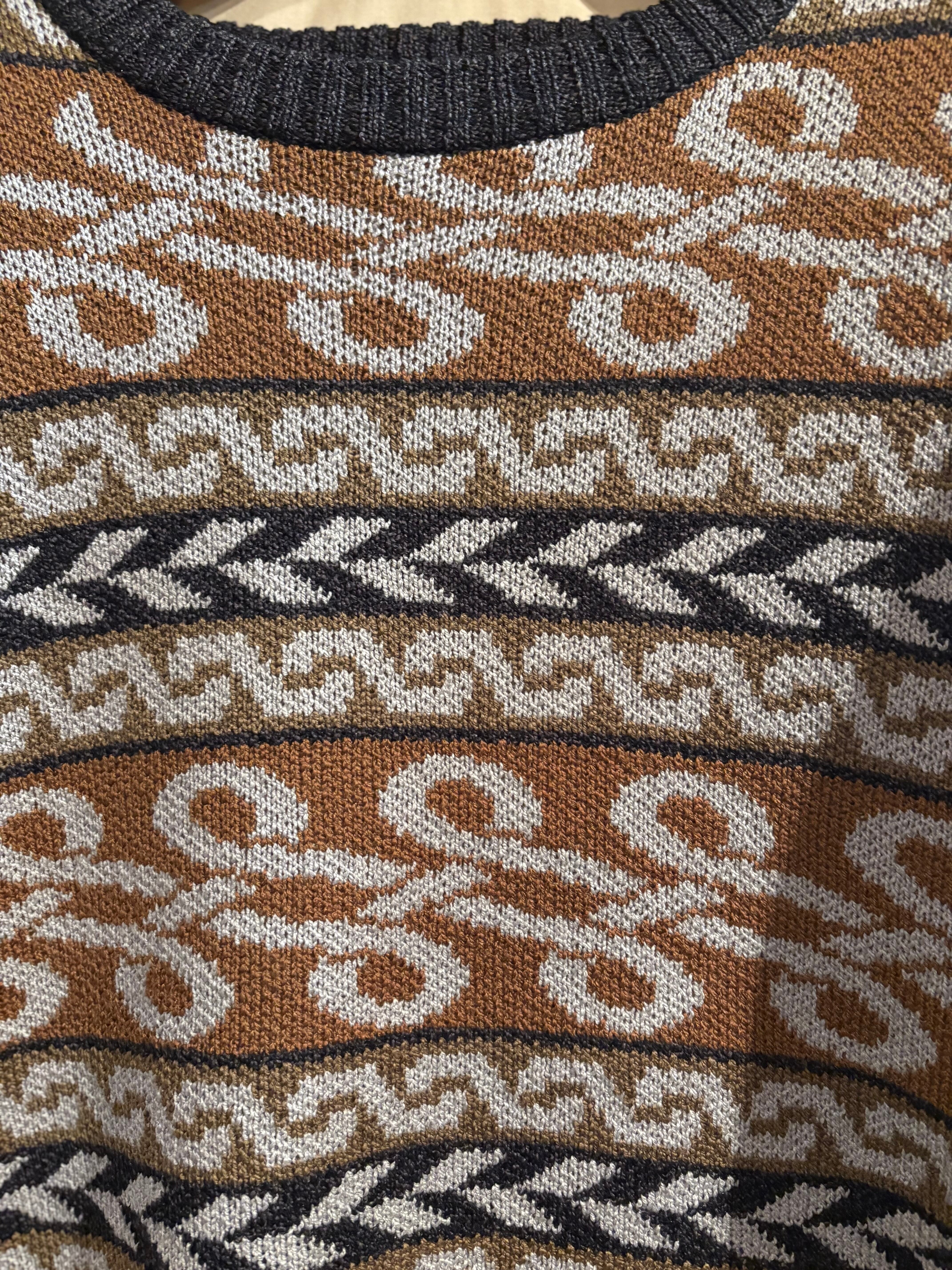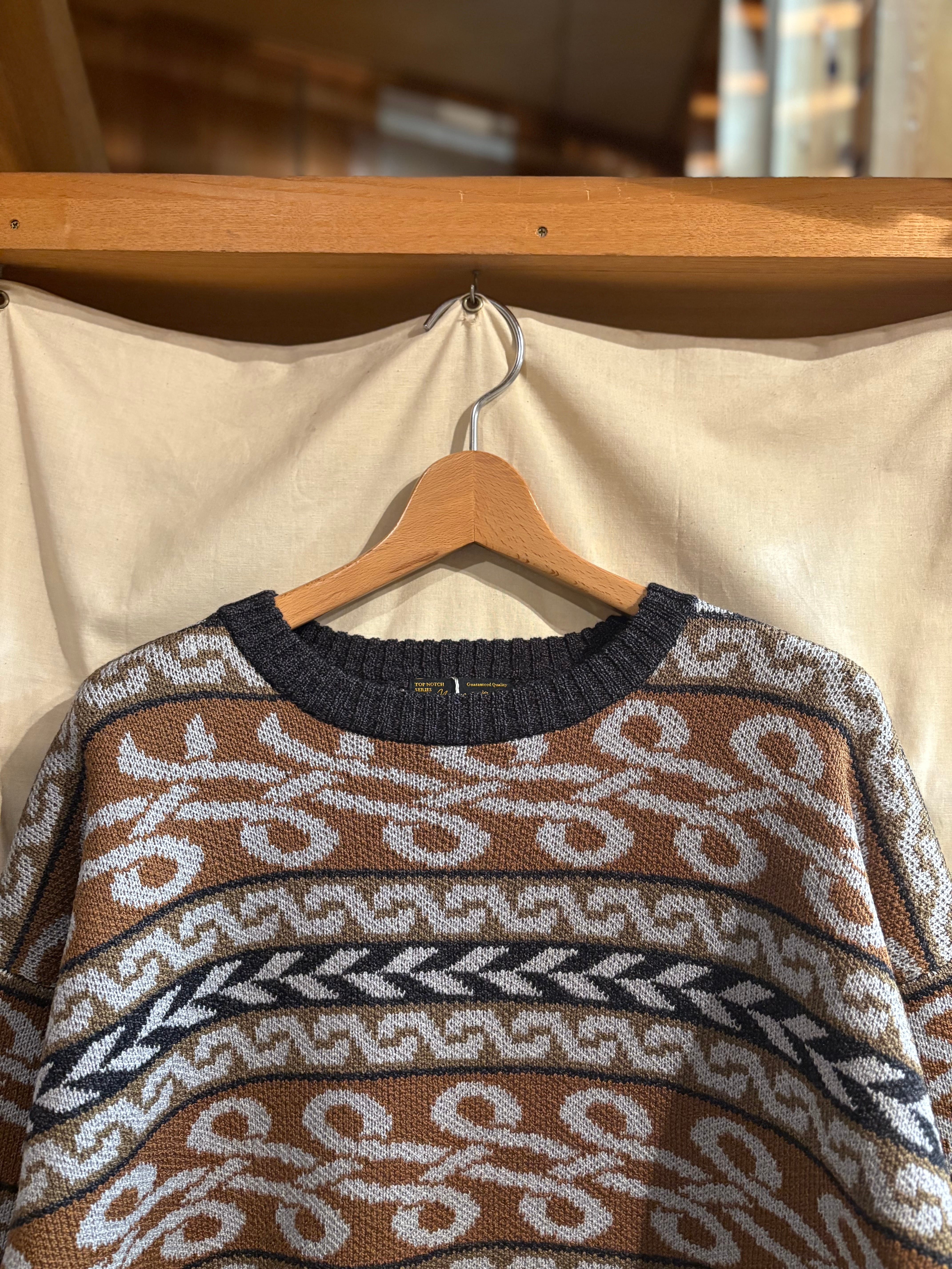 ケルティック柄のようでもあり、日本の籠目文様のようでもある、始まりと終わりのない独特な模様が特徴的。どこかトライバルな雰囲気が漂い、Nasngwam. らしい個性が光る一着。