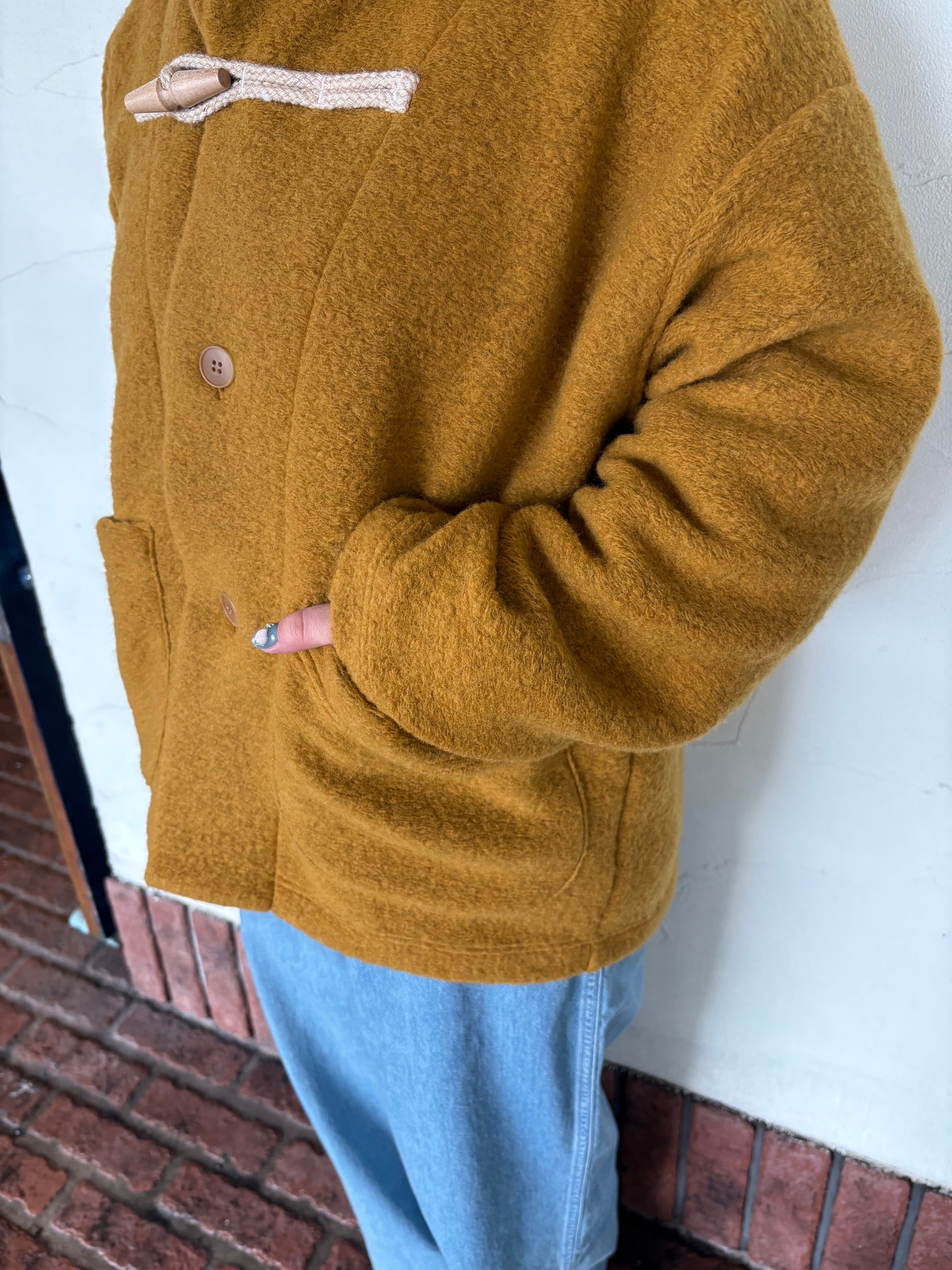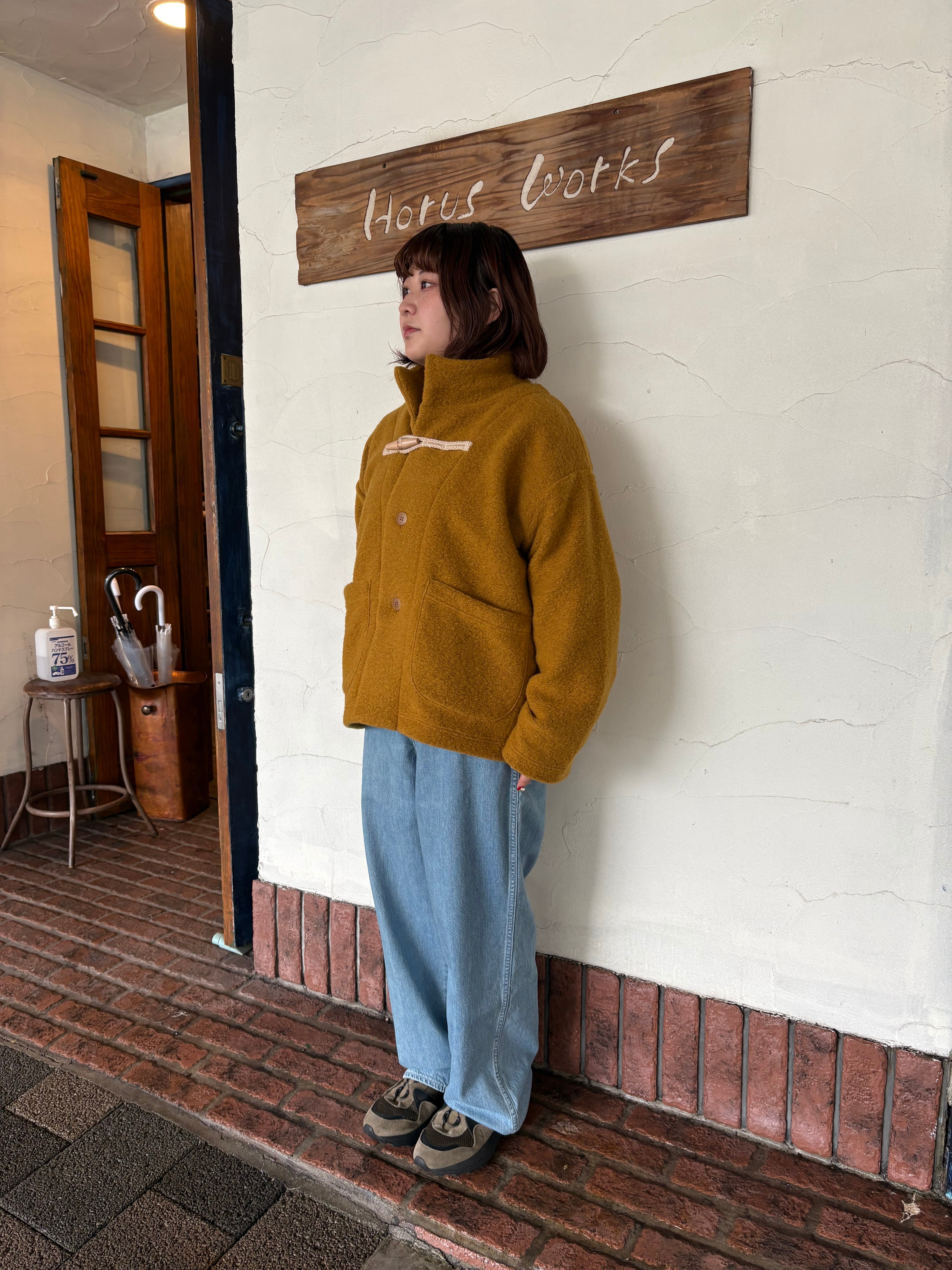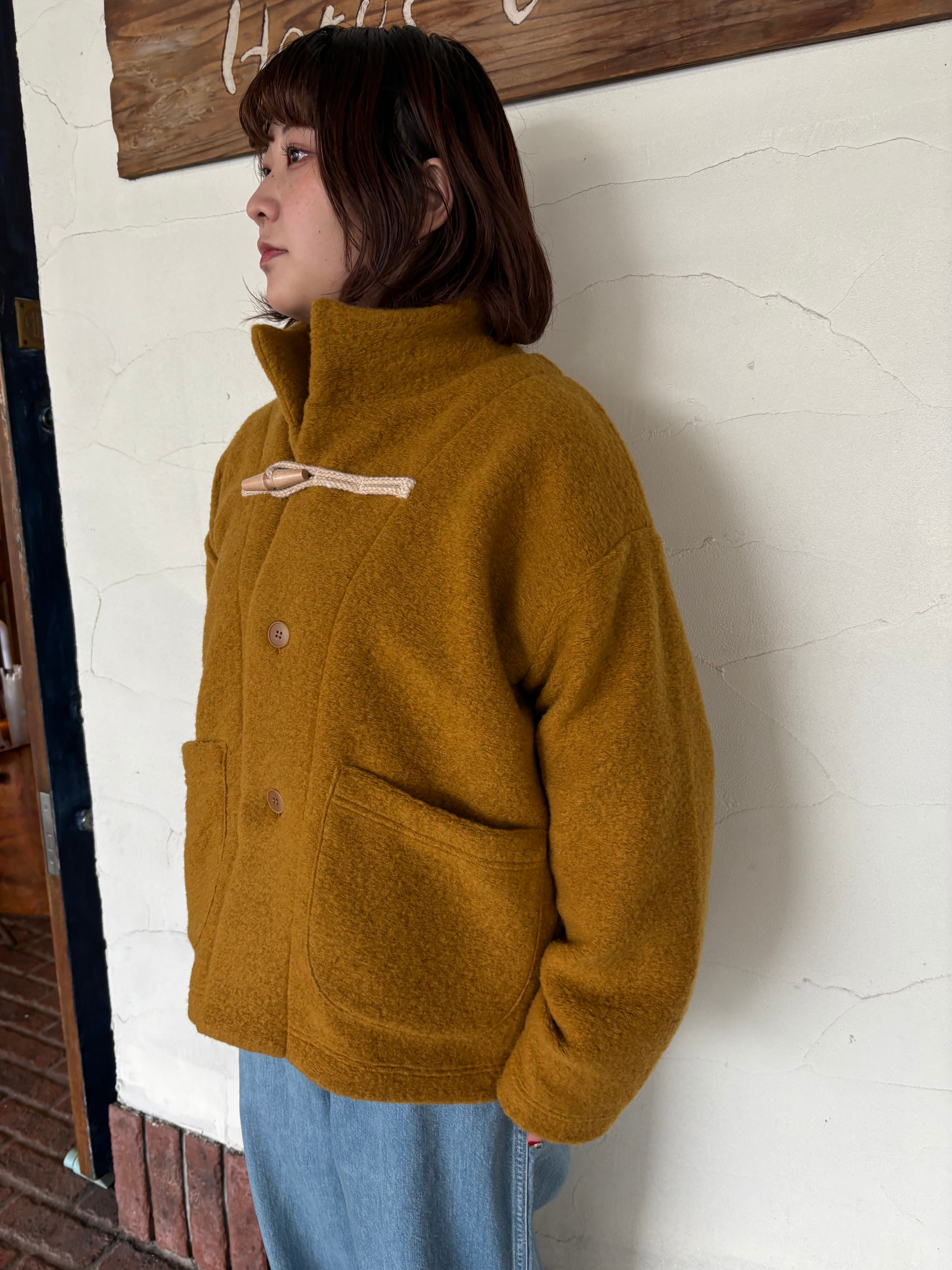 もこもこっとした質感と、やさしいマスタードカラーが目を惹く一枚