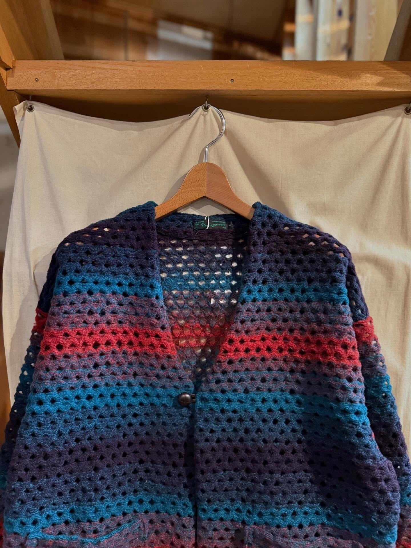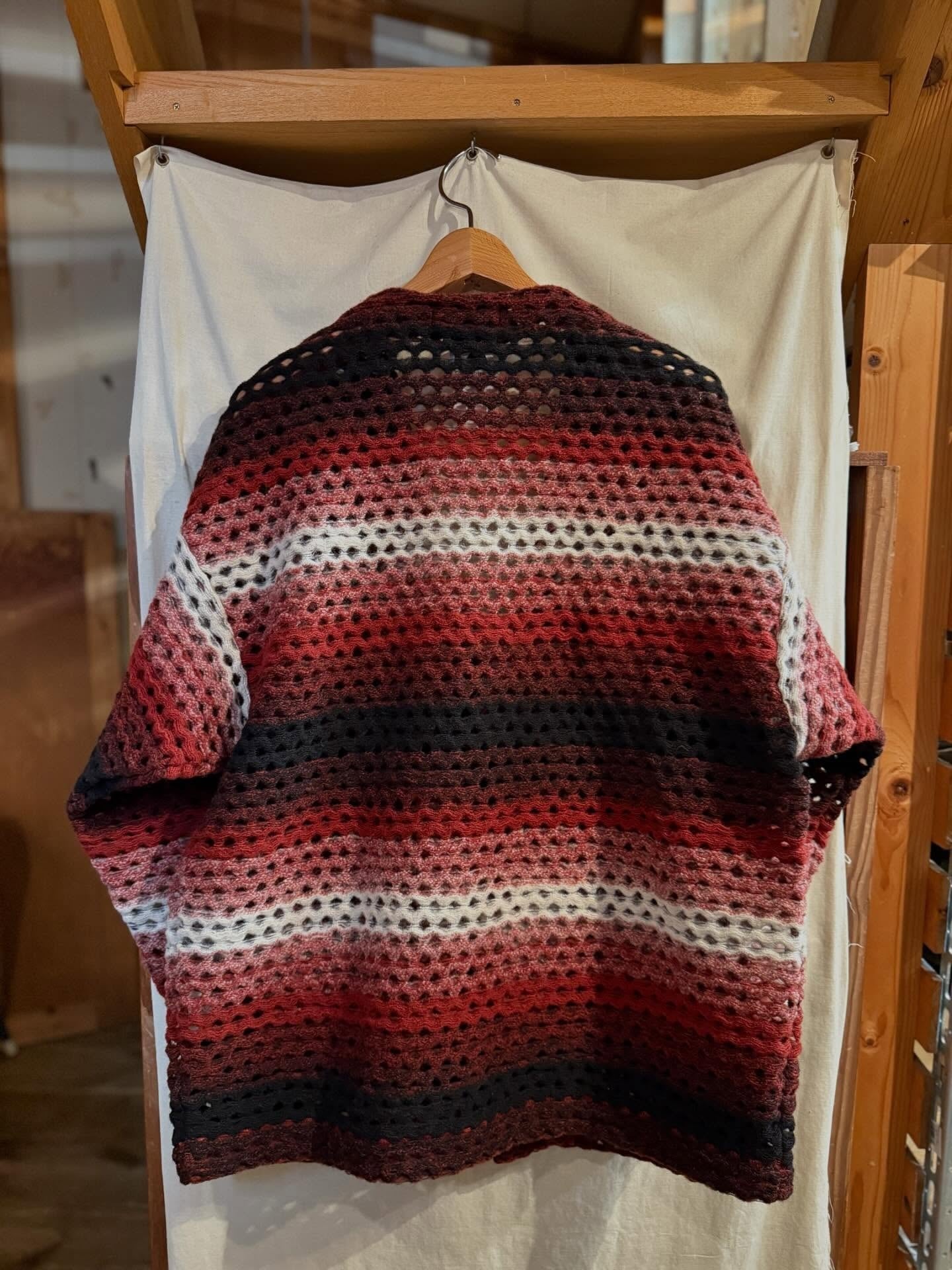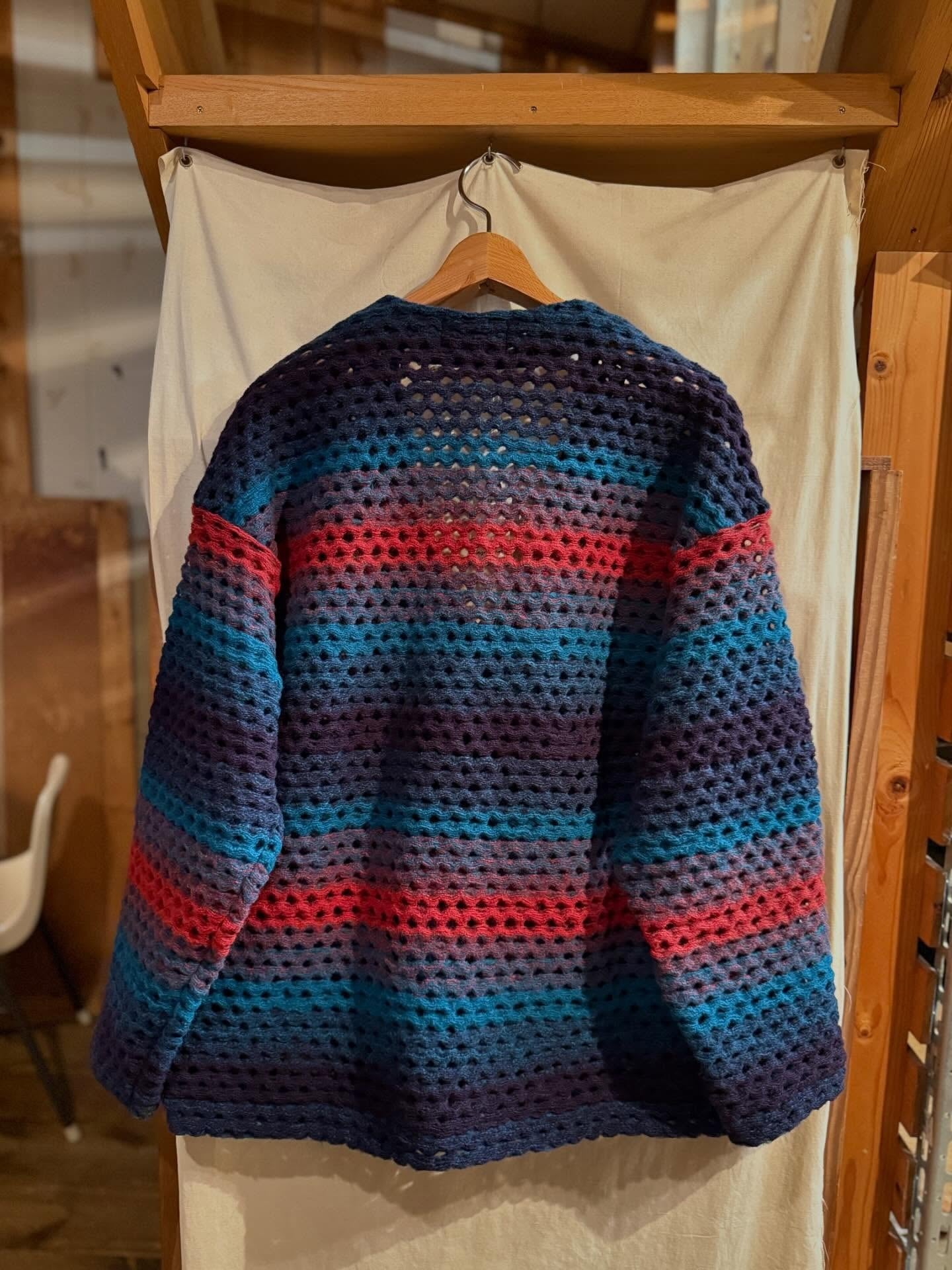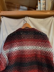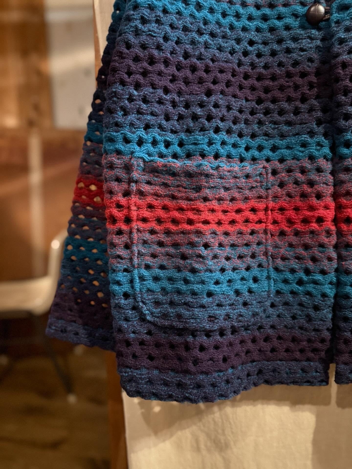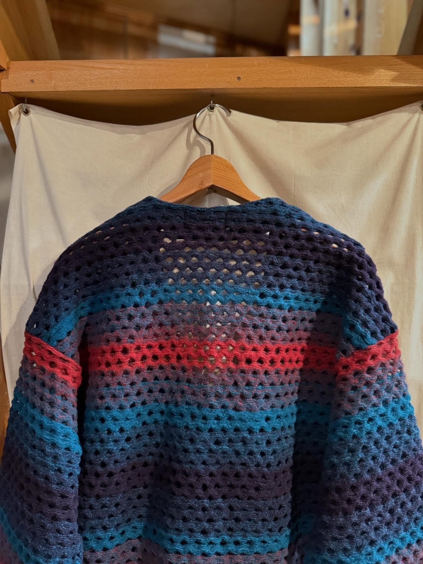 目の粗い鍵編みのようなデッドストック生地を使用し、深みのあるカラーをゆるやかなグラデーションで表現した一着。