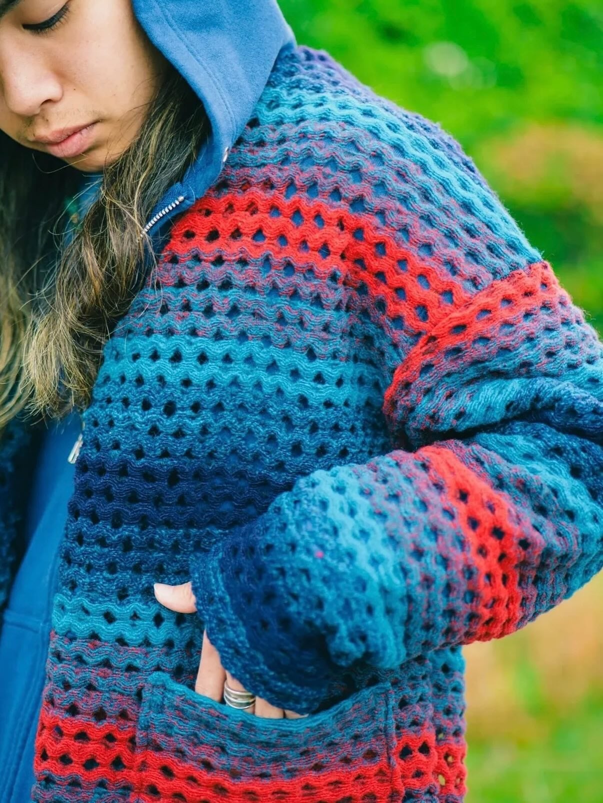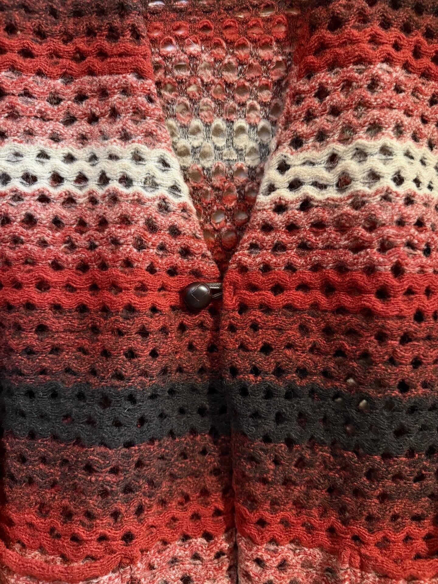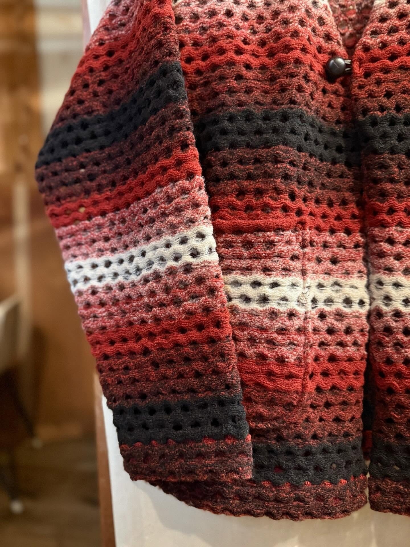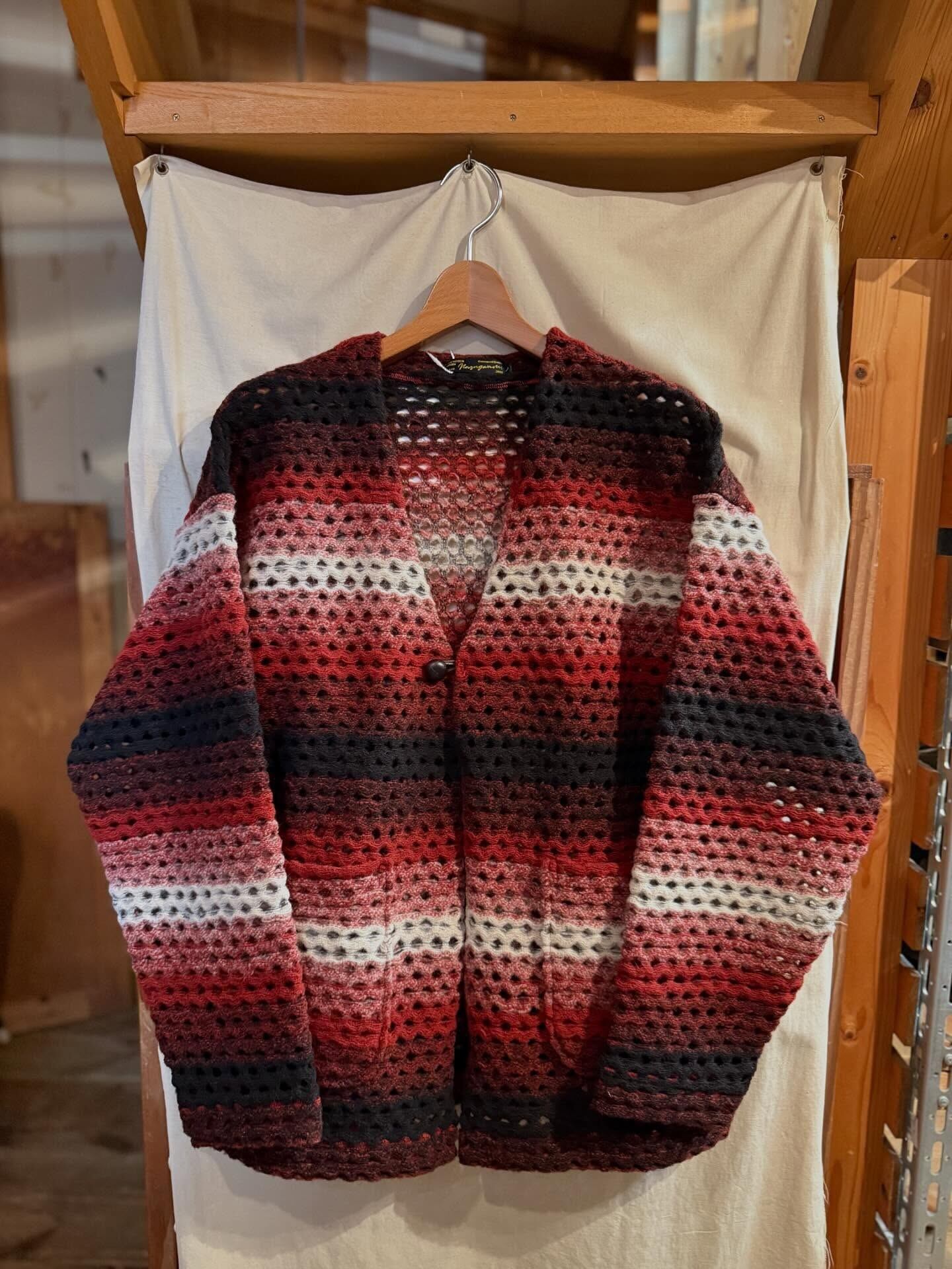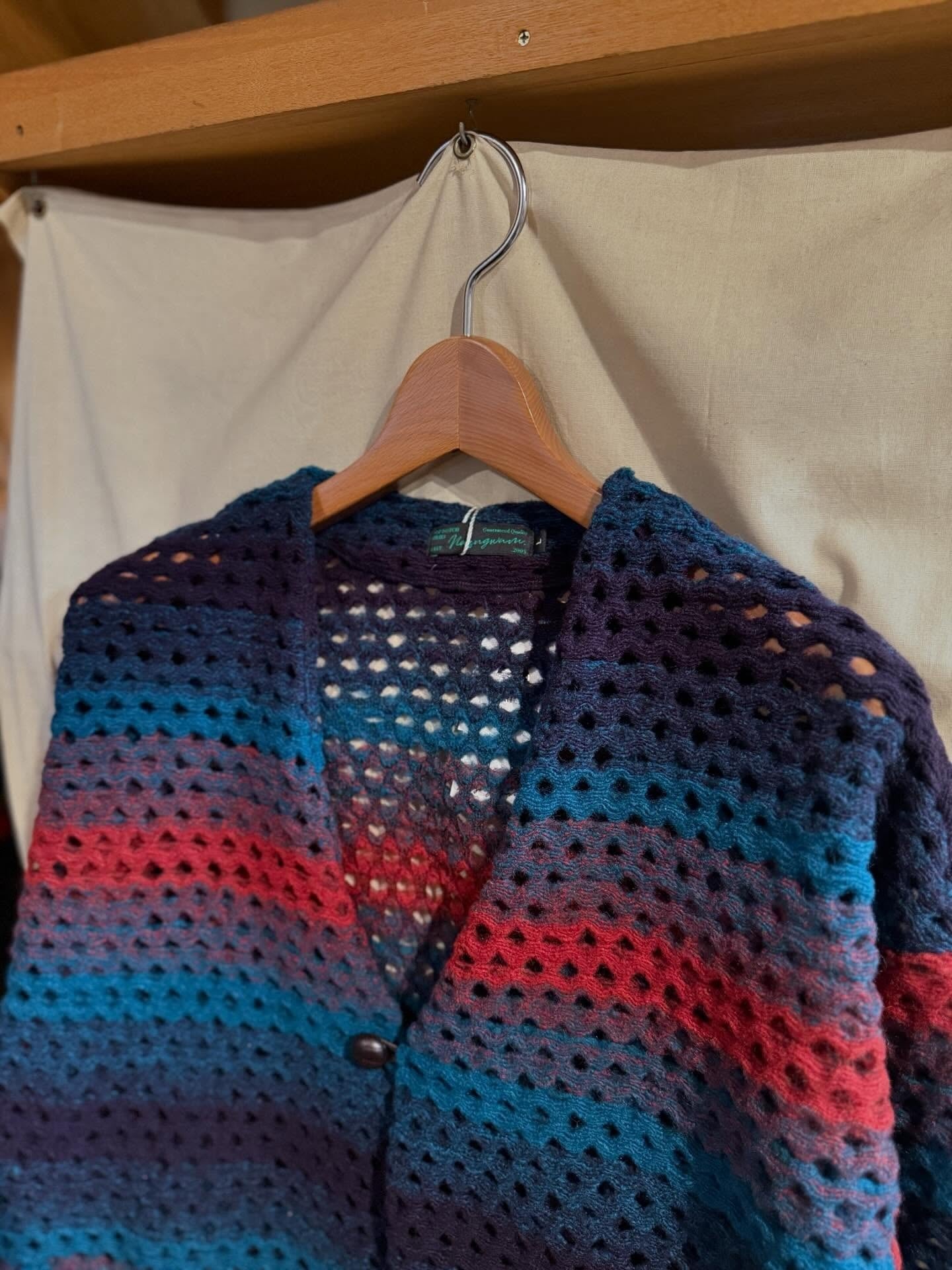 目の粗い鍵編みのようなデッドストック生地を使用し、深みのあるカラーをゆるやかなグラデーションで表現した一着。