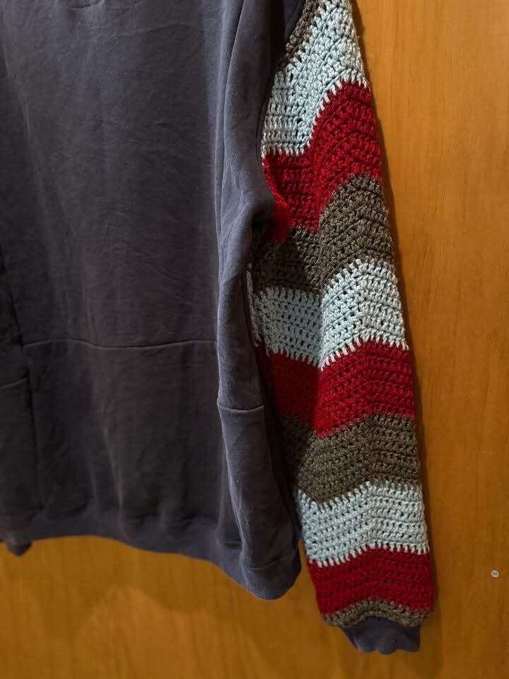 袖はクロシェット編みになっており、模様が一点一点違い、花柄や幾何学柄など、様々なデザインが表現されています。