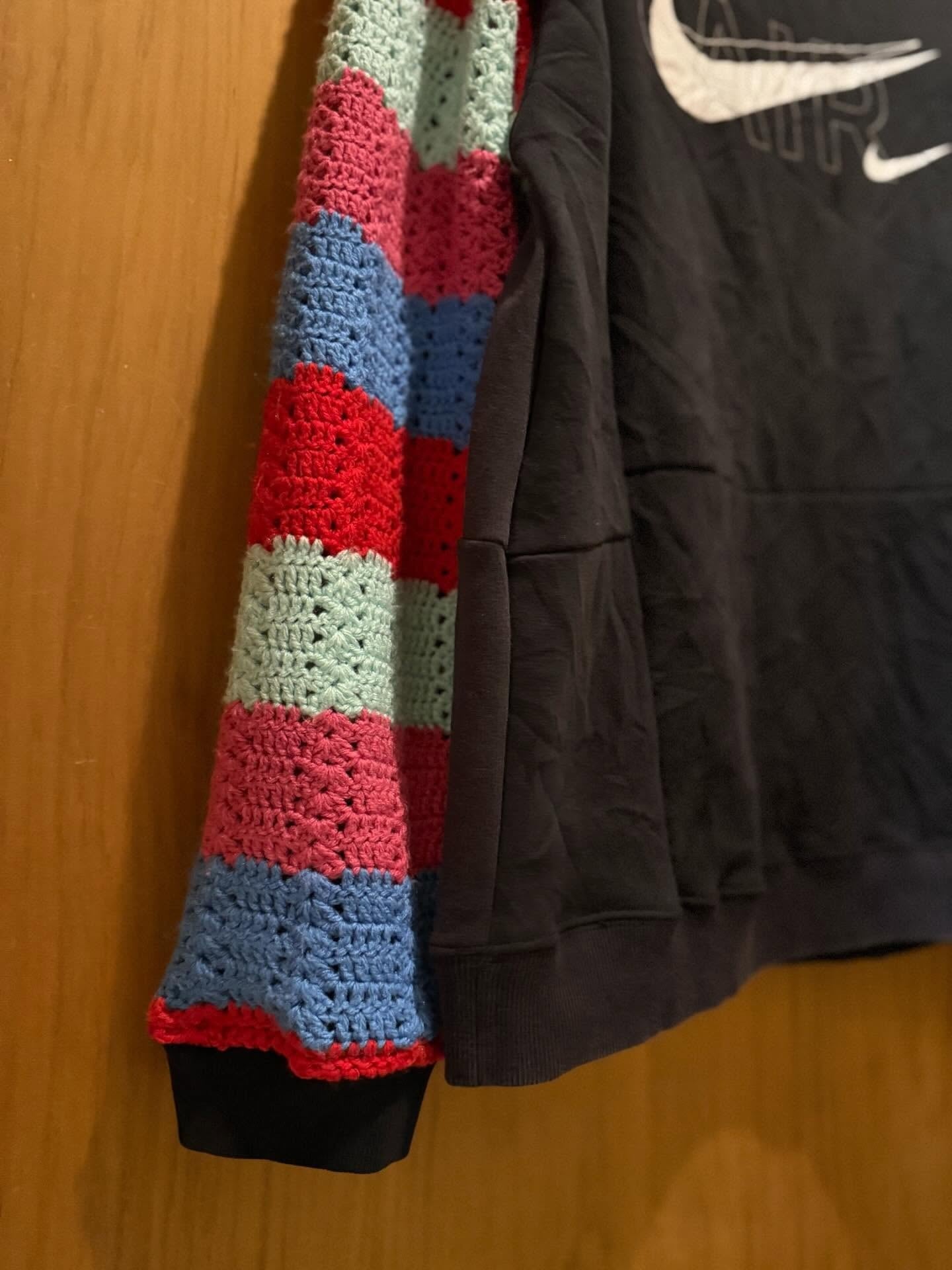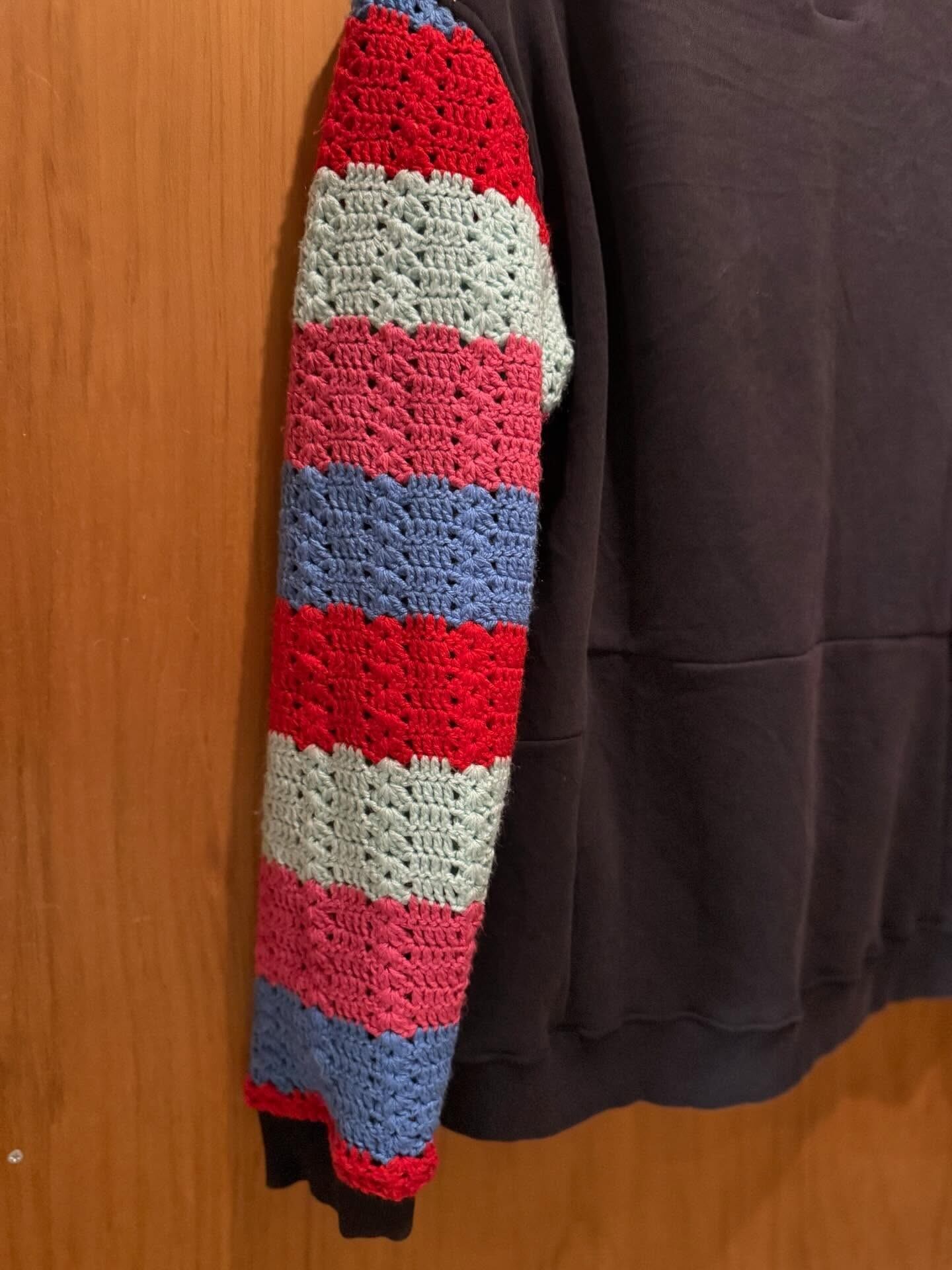 袖はクロシェット編みになっており、模様が一点一点違い、花柄や幾何学柄など、様々なデザインが表現されています。