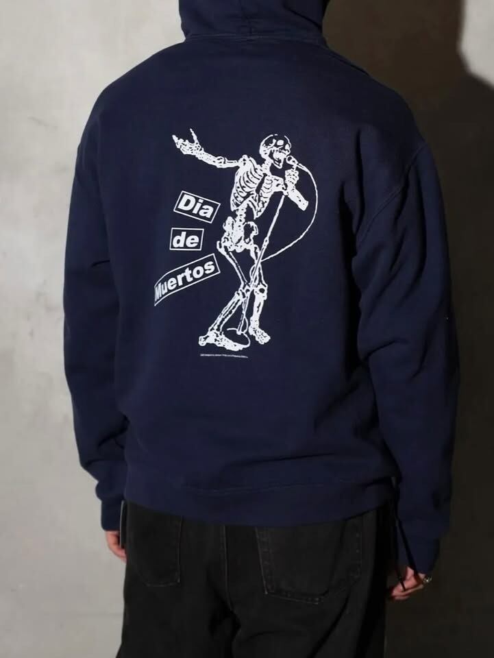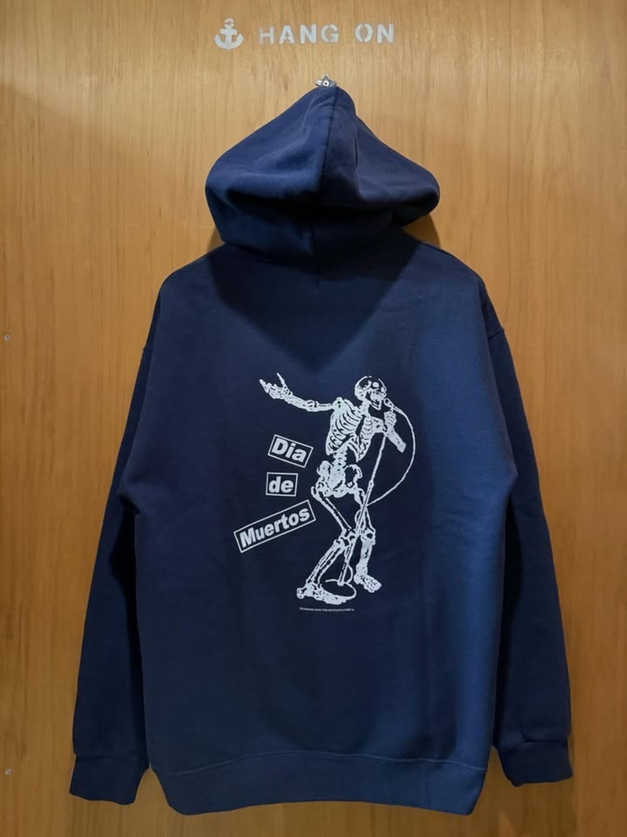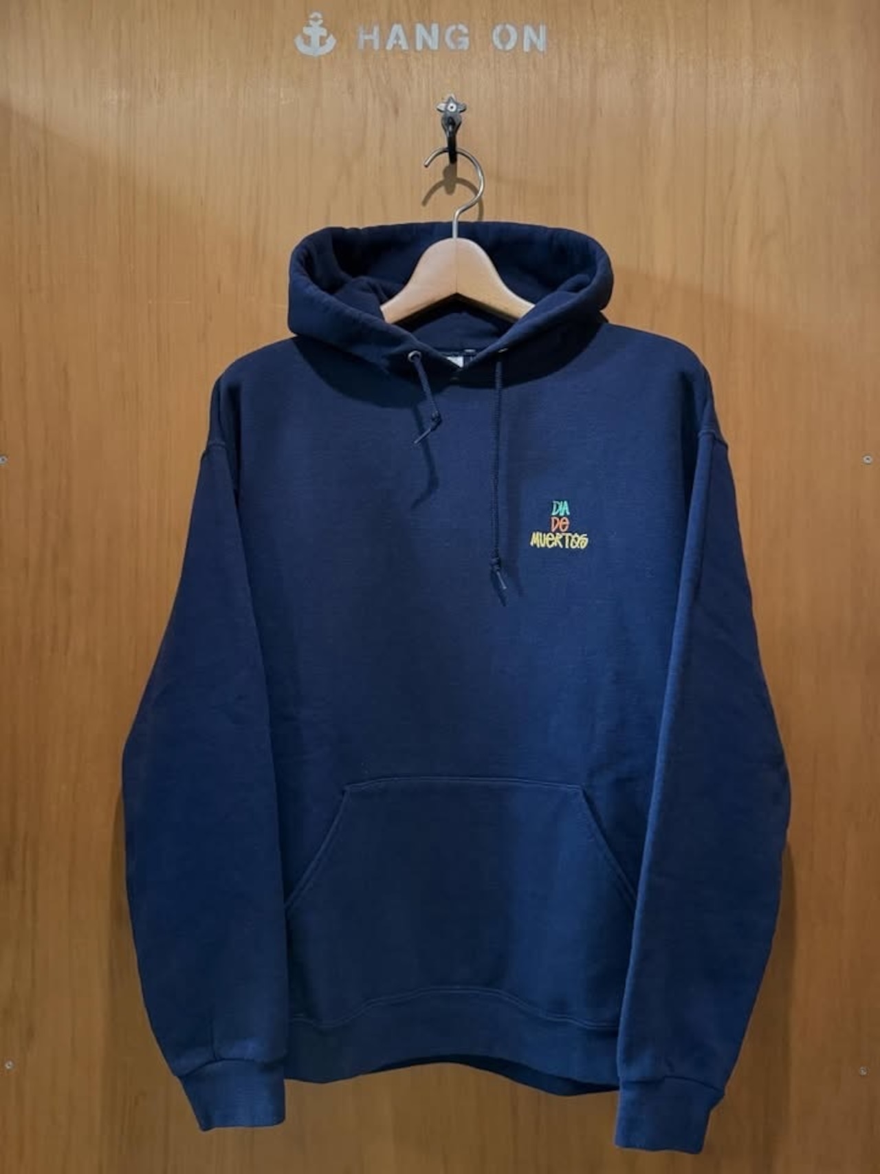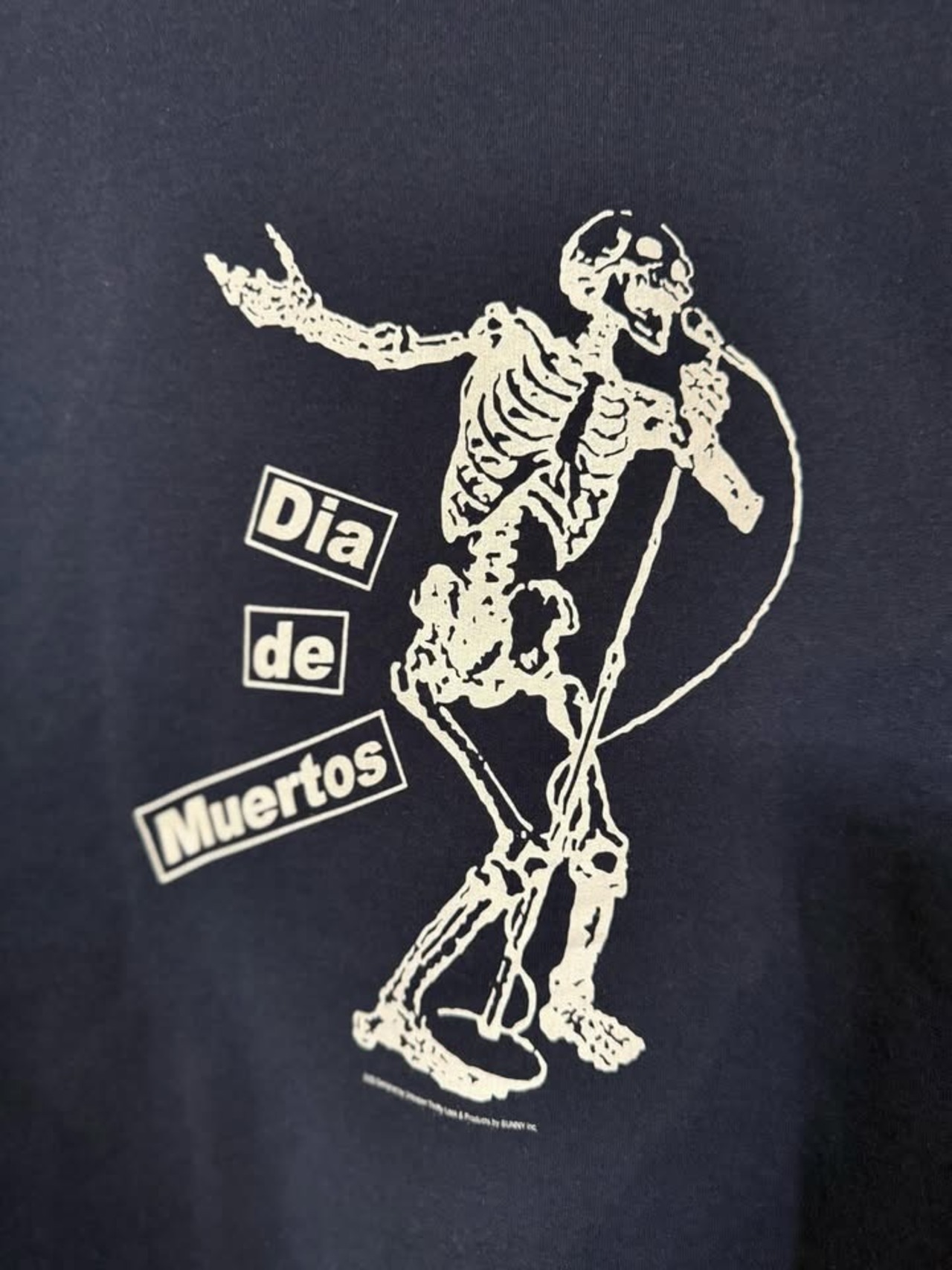 左胸に"DIA DE MUERTOS" (死者の日)をユーモアあるフォント、カラーリングで刺繍。