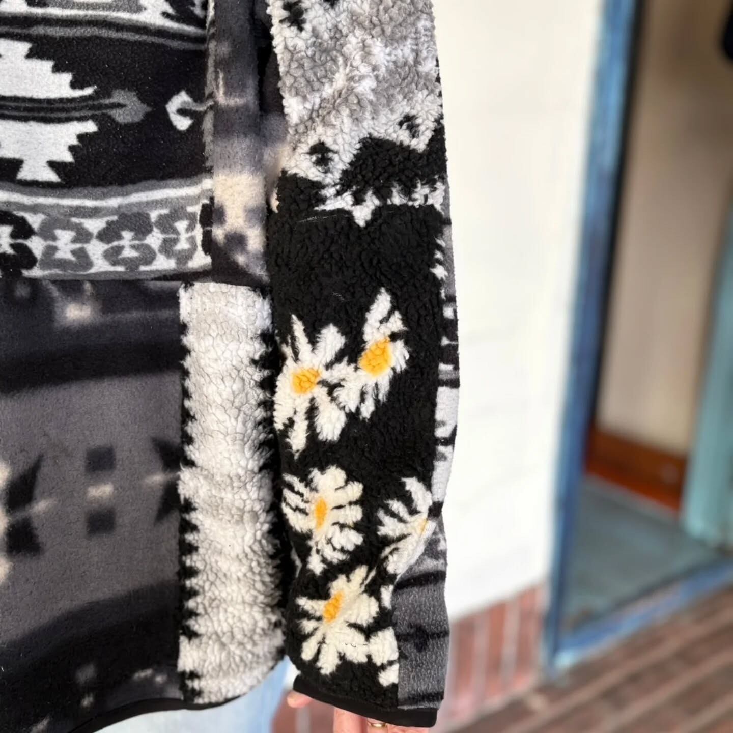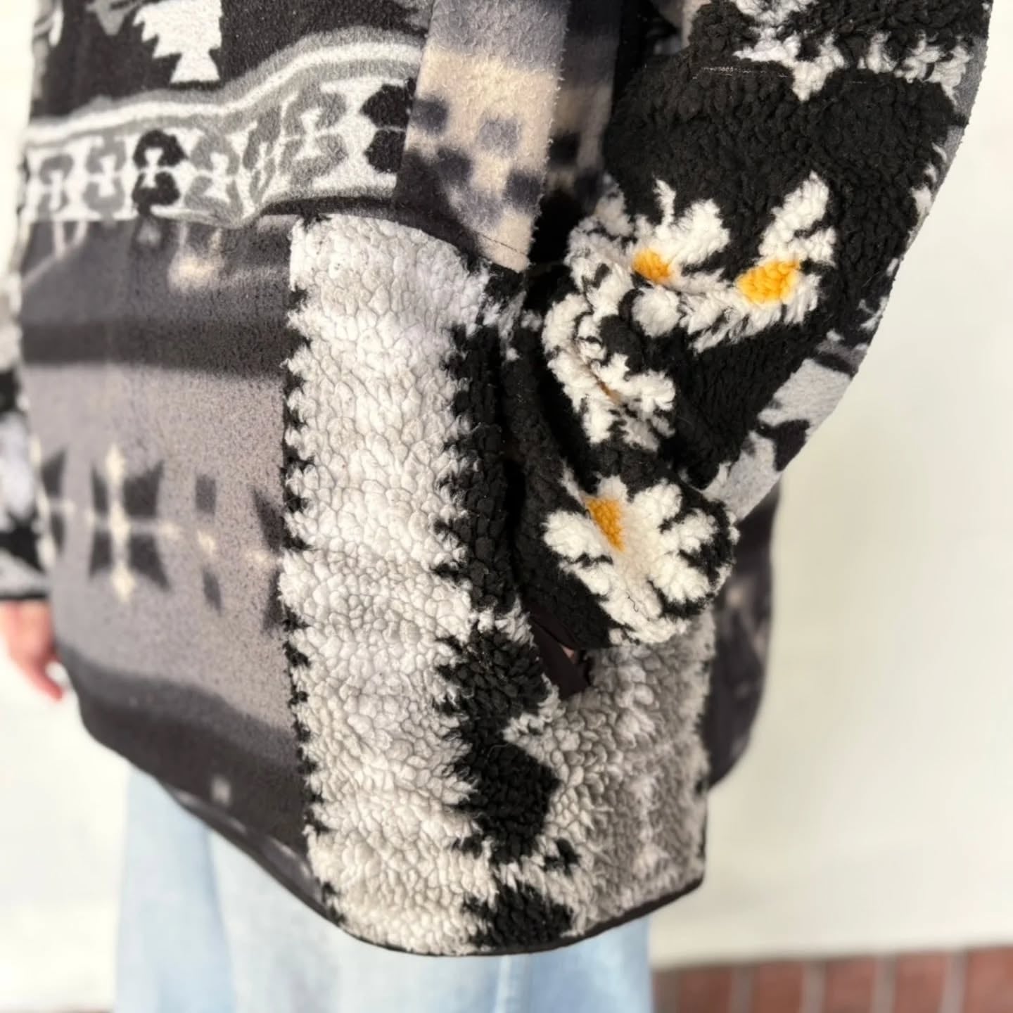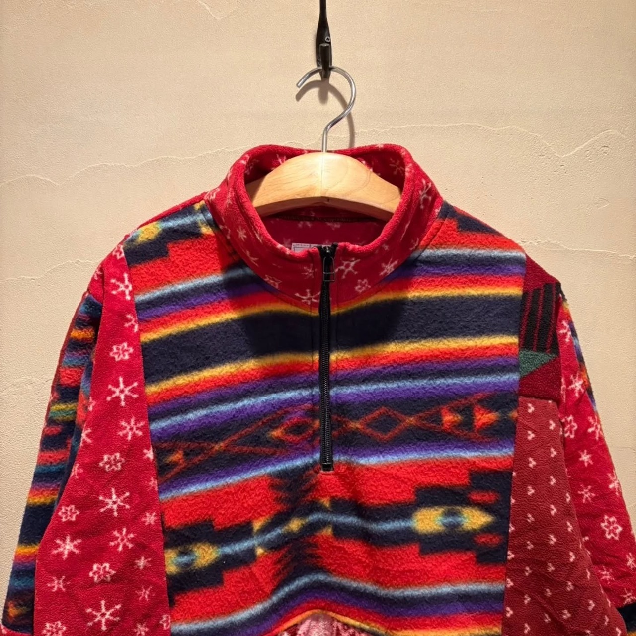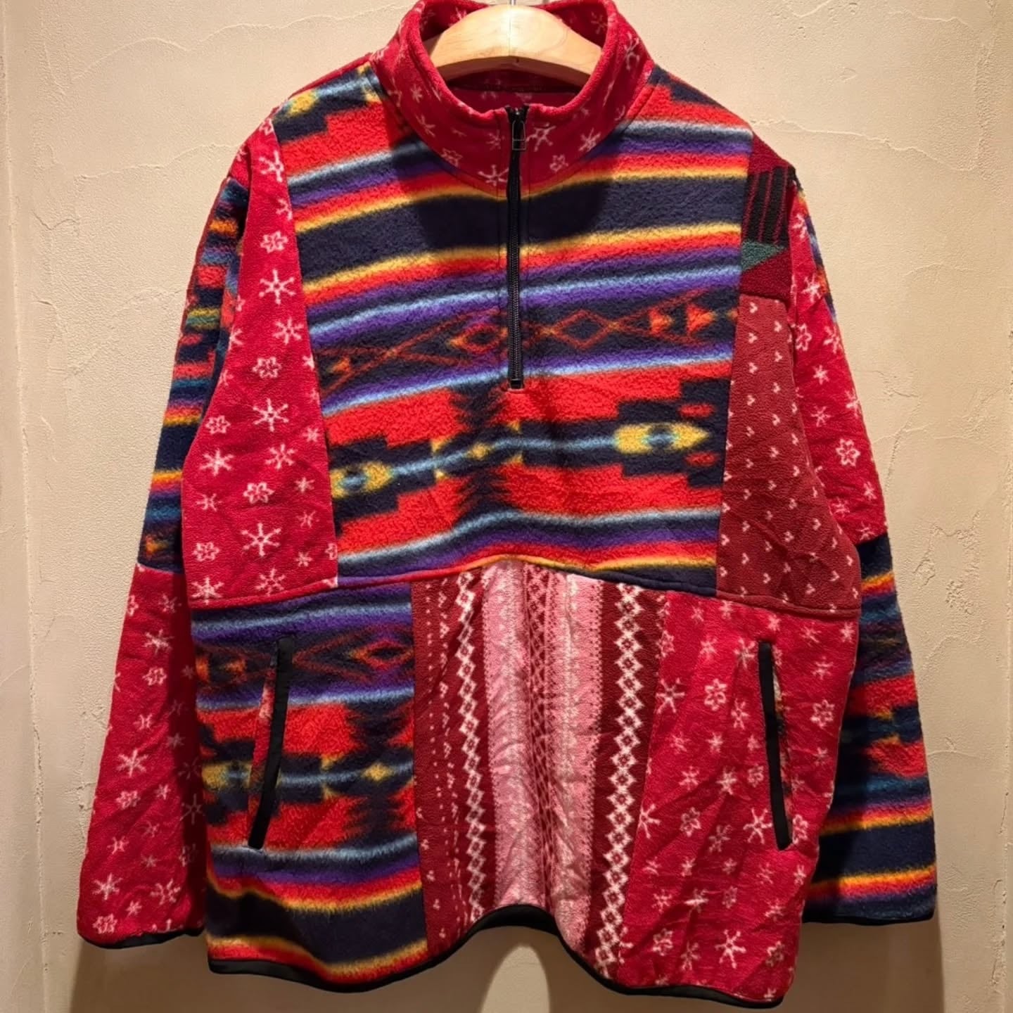 チェックや柄のパッチワークが目を惹く、主役になる一枚。