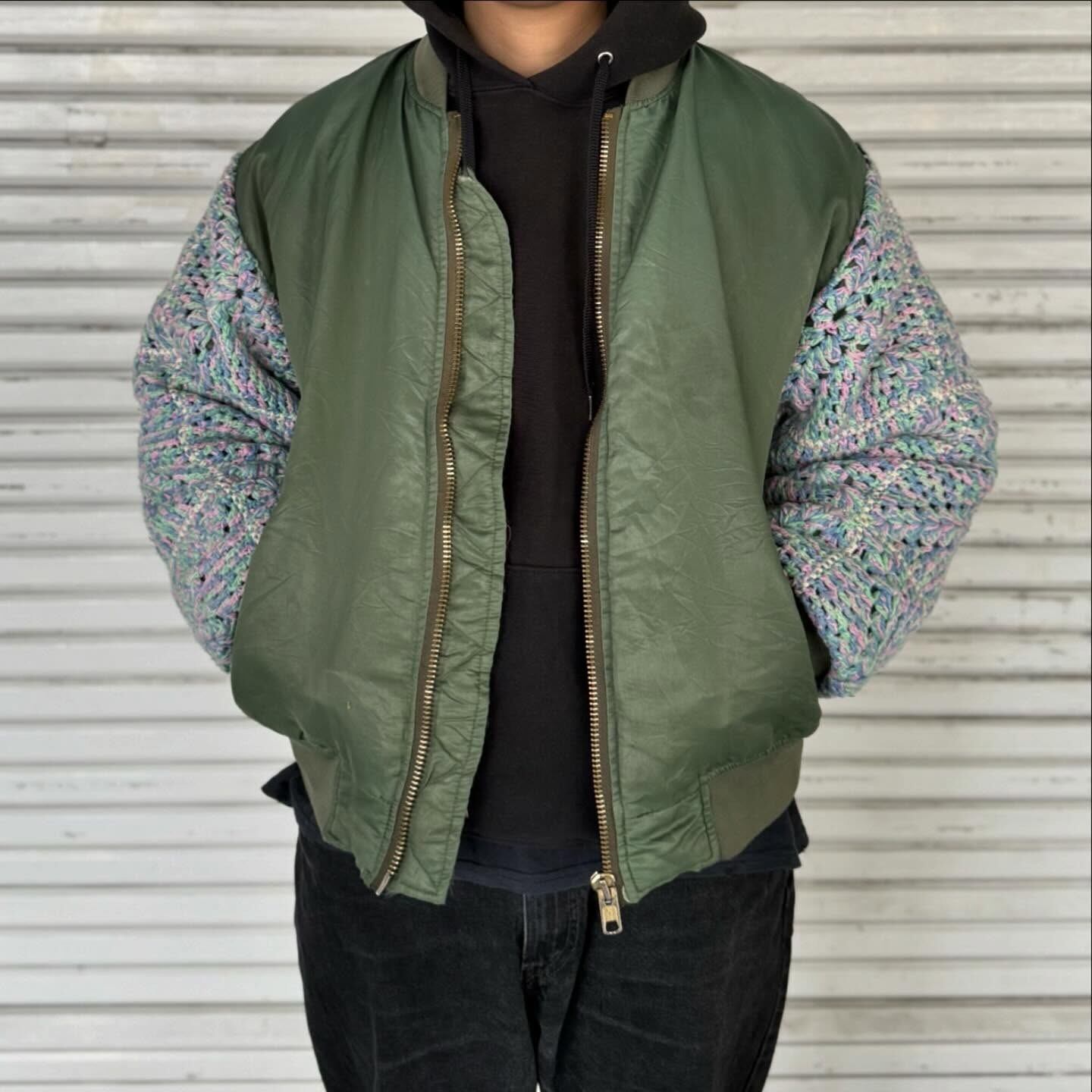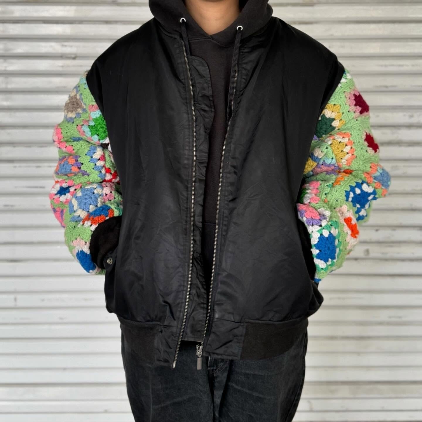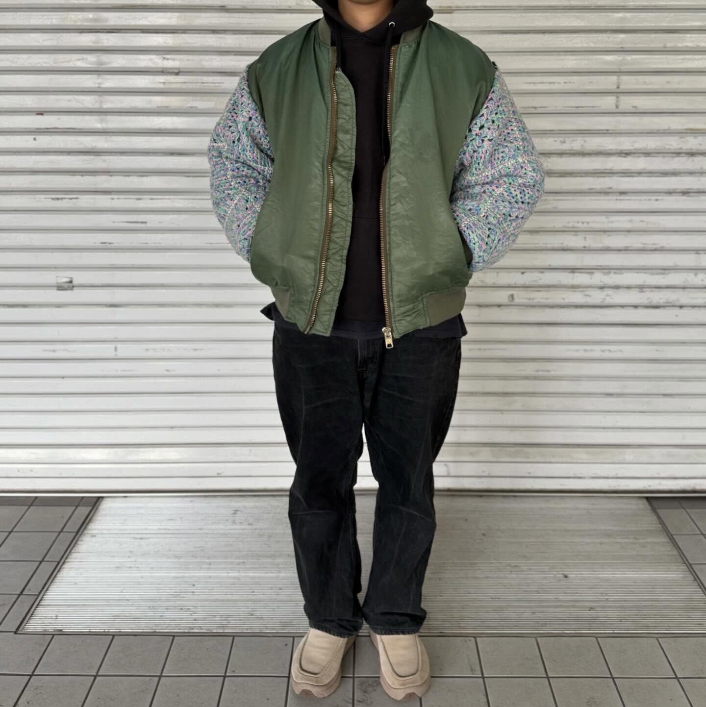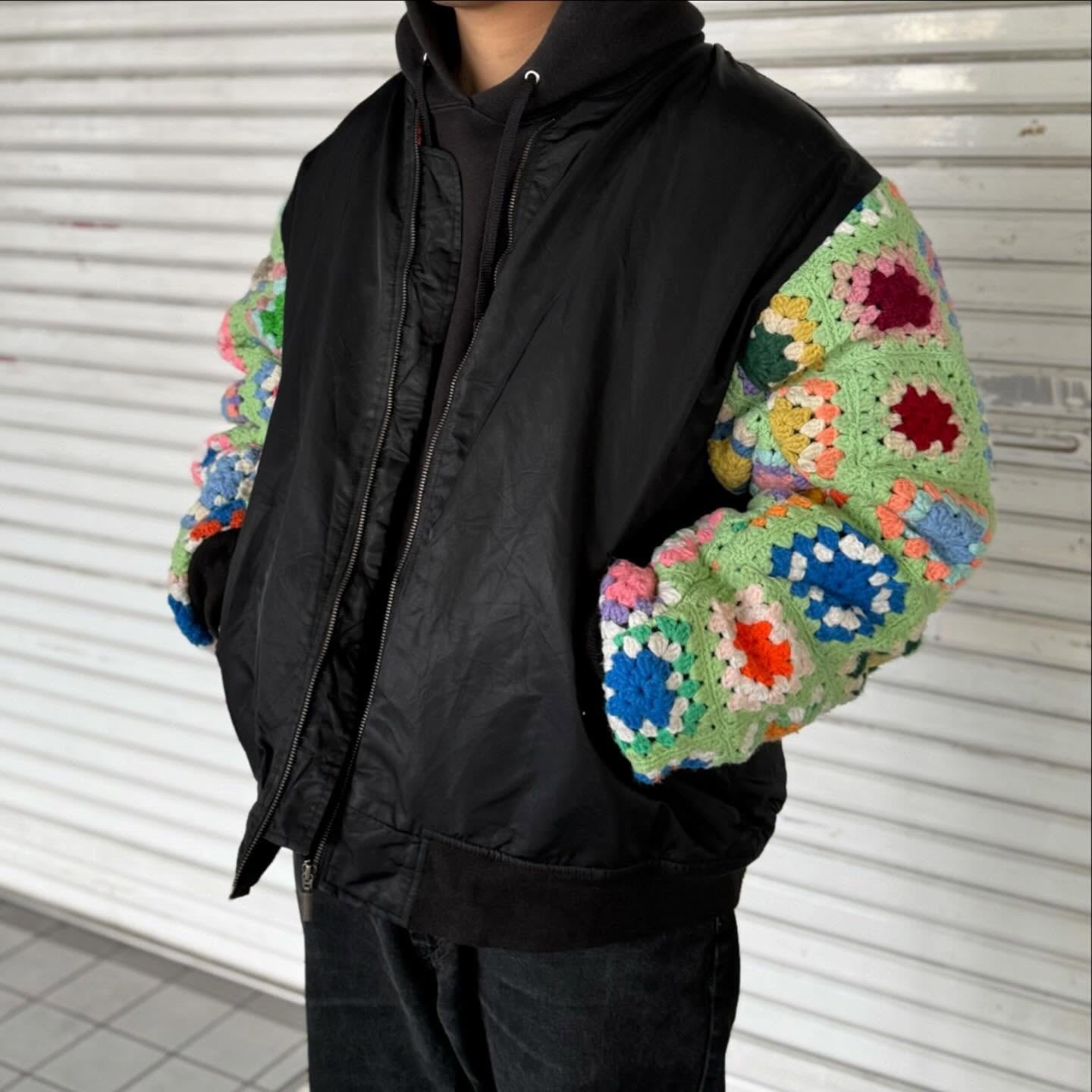 古着の MA-1に袖の上からクロシェット編みを重ねたデザイン。