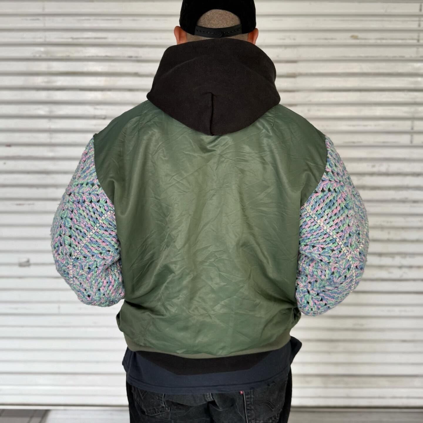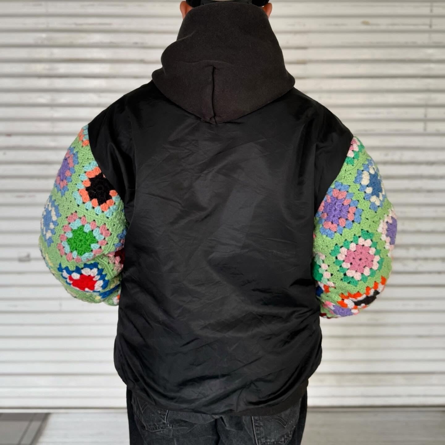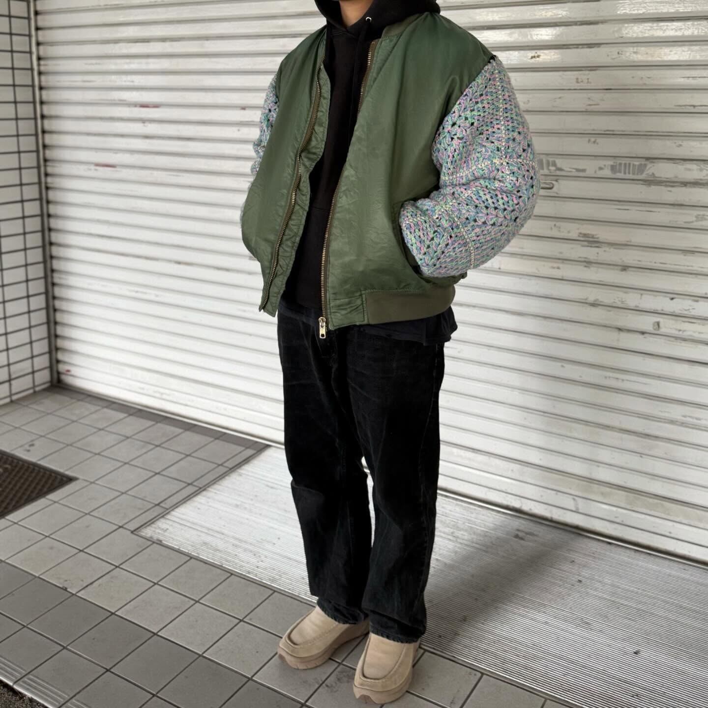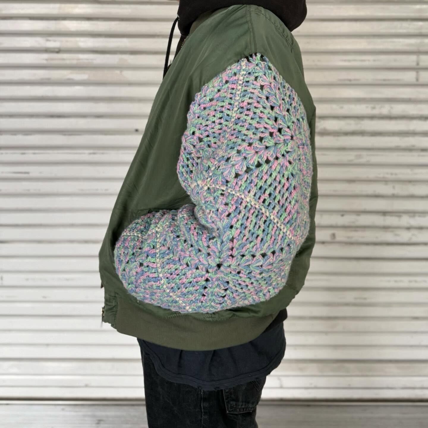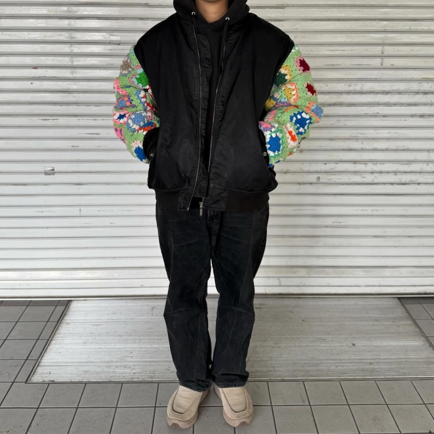 古着の MA-1に袖の上からクロシェット編みを重ねたデザイン。