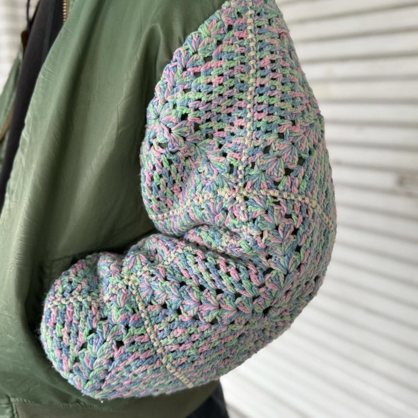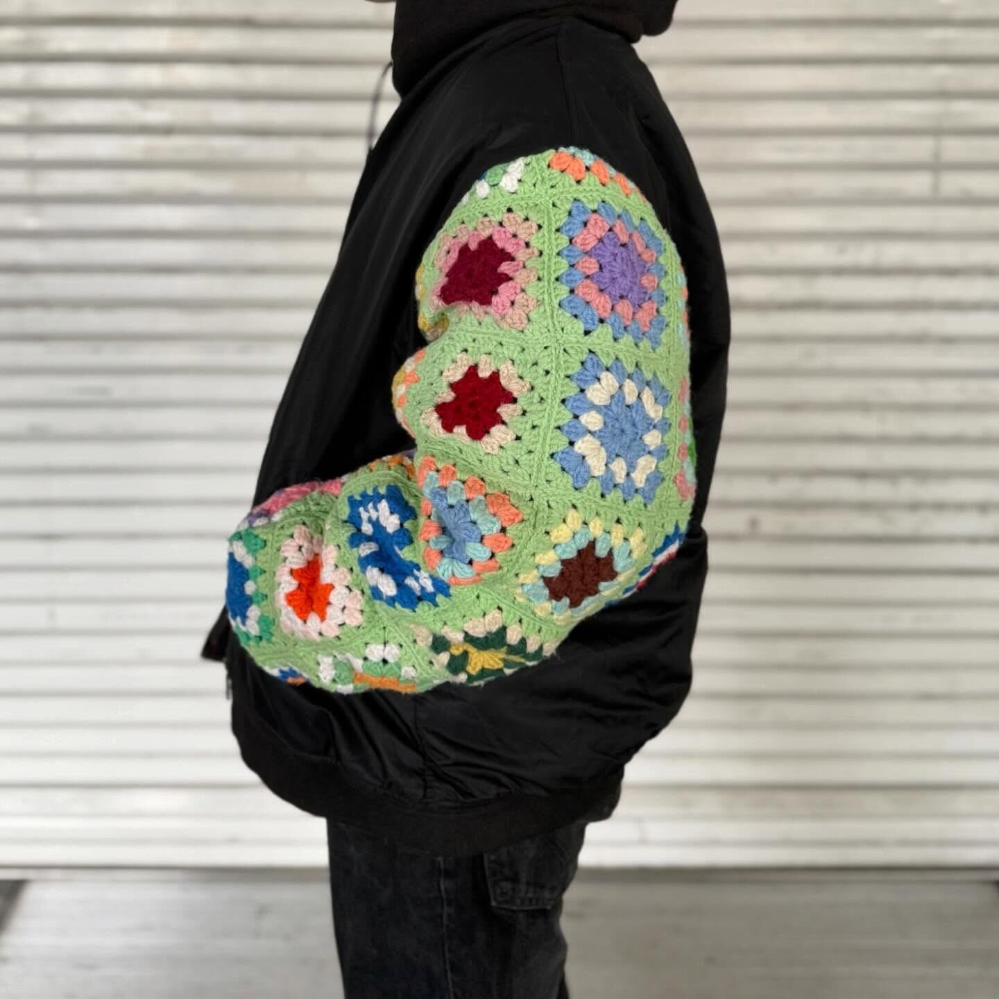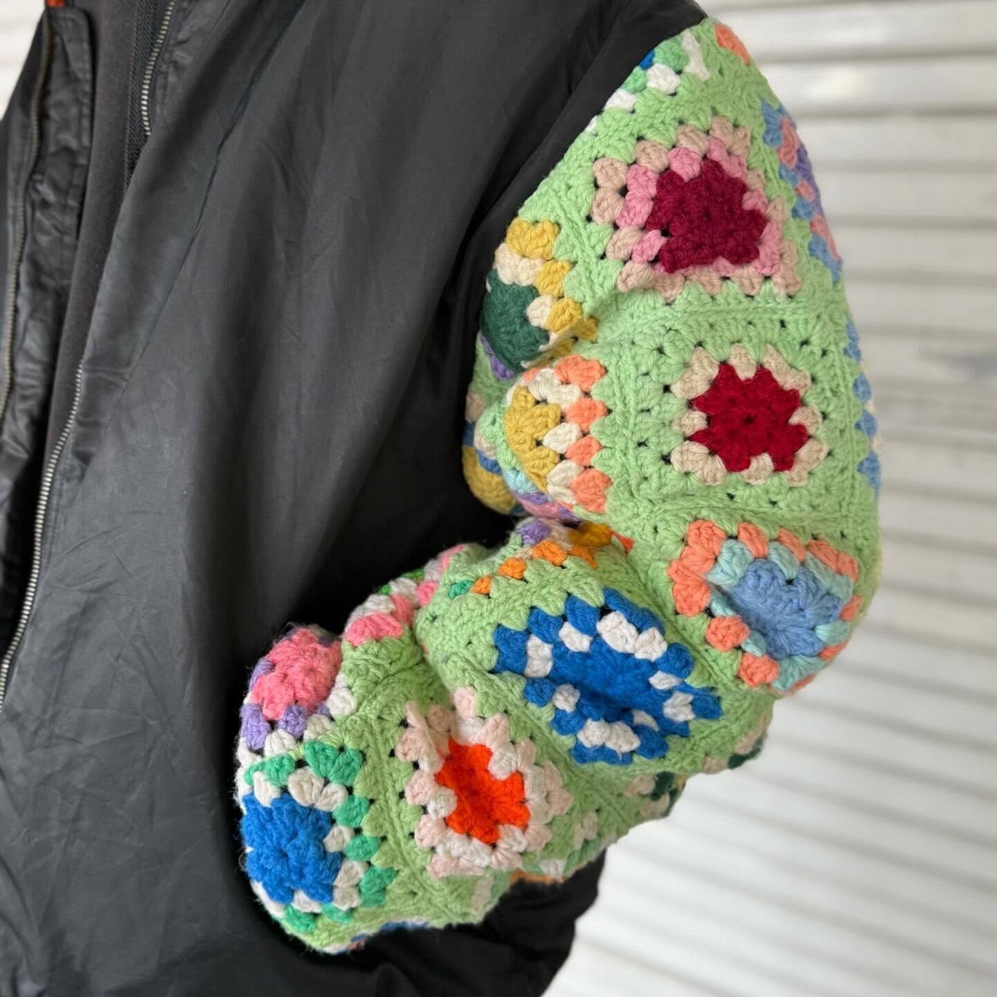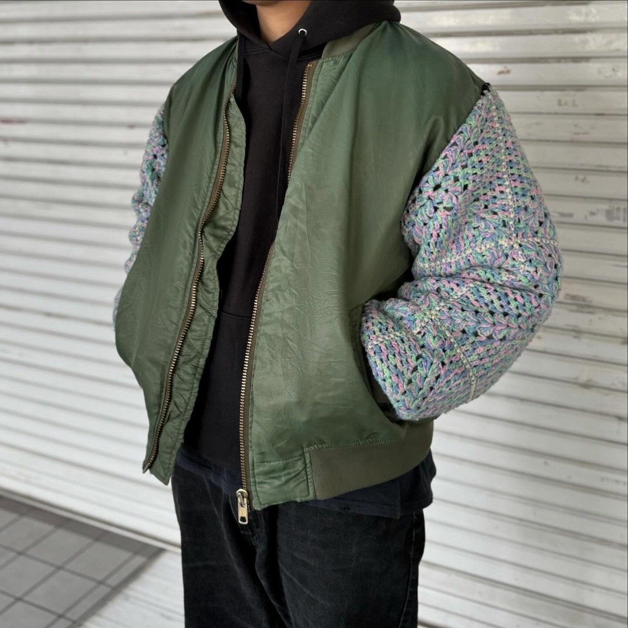 古着の MA-1に袖の上からクロシェット編みを重ねたデザイン。