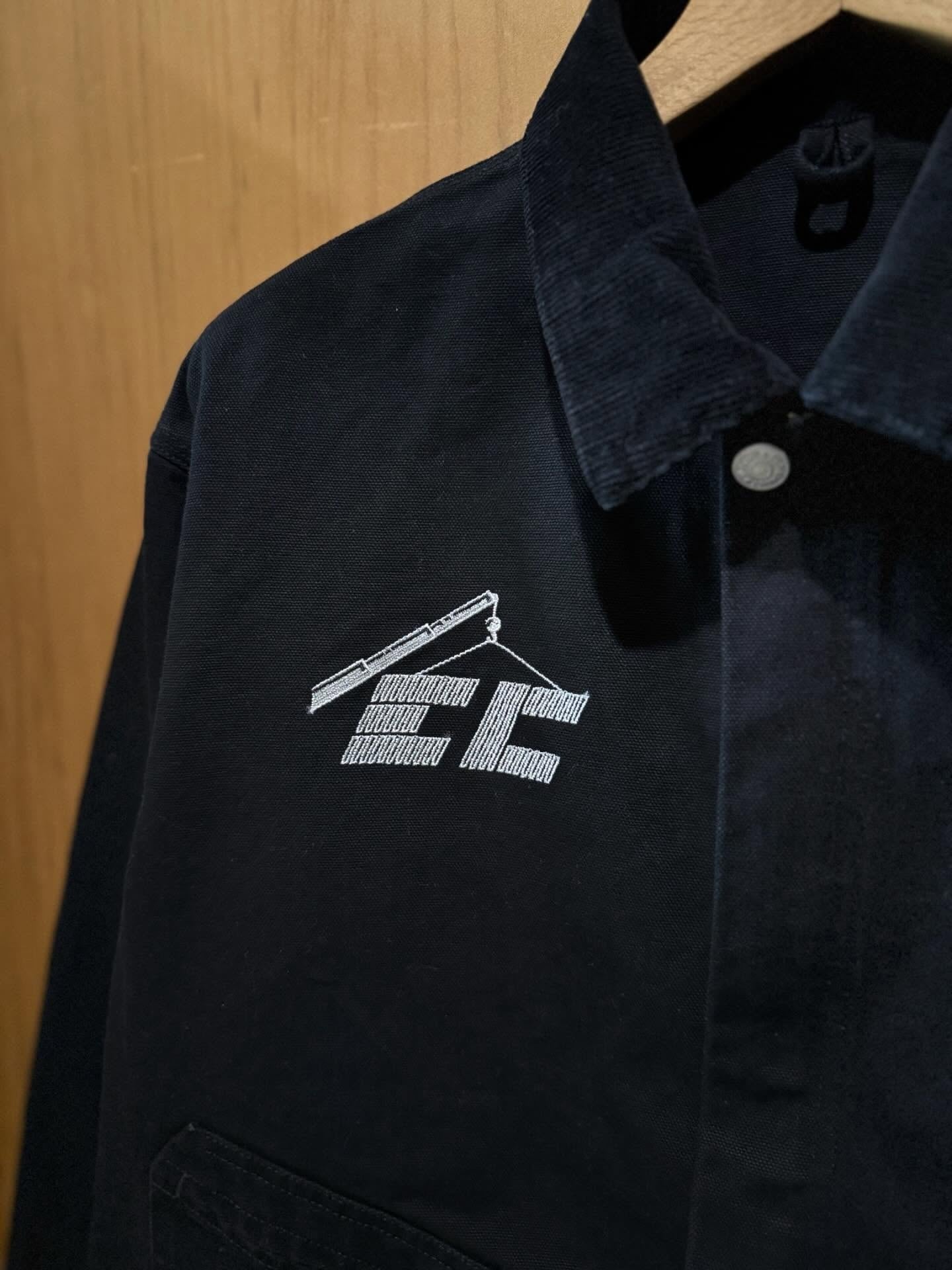 武骨なワークウェアの魅力を残しつつ、現代的なストリートスタイルにハマるクロップド丈(ショート丈)で再構築。フロントのワンポイント刺繍、背面にはクレーンで持ち上げられる看板をモチーフとしたグラフィックと、「EAST COAST SIGNS Philadelphia, PA」のロゴを大きく刺繍。