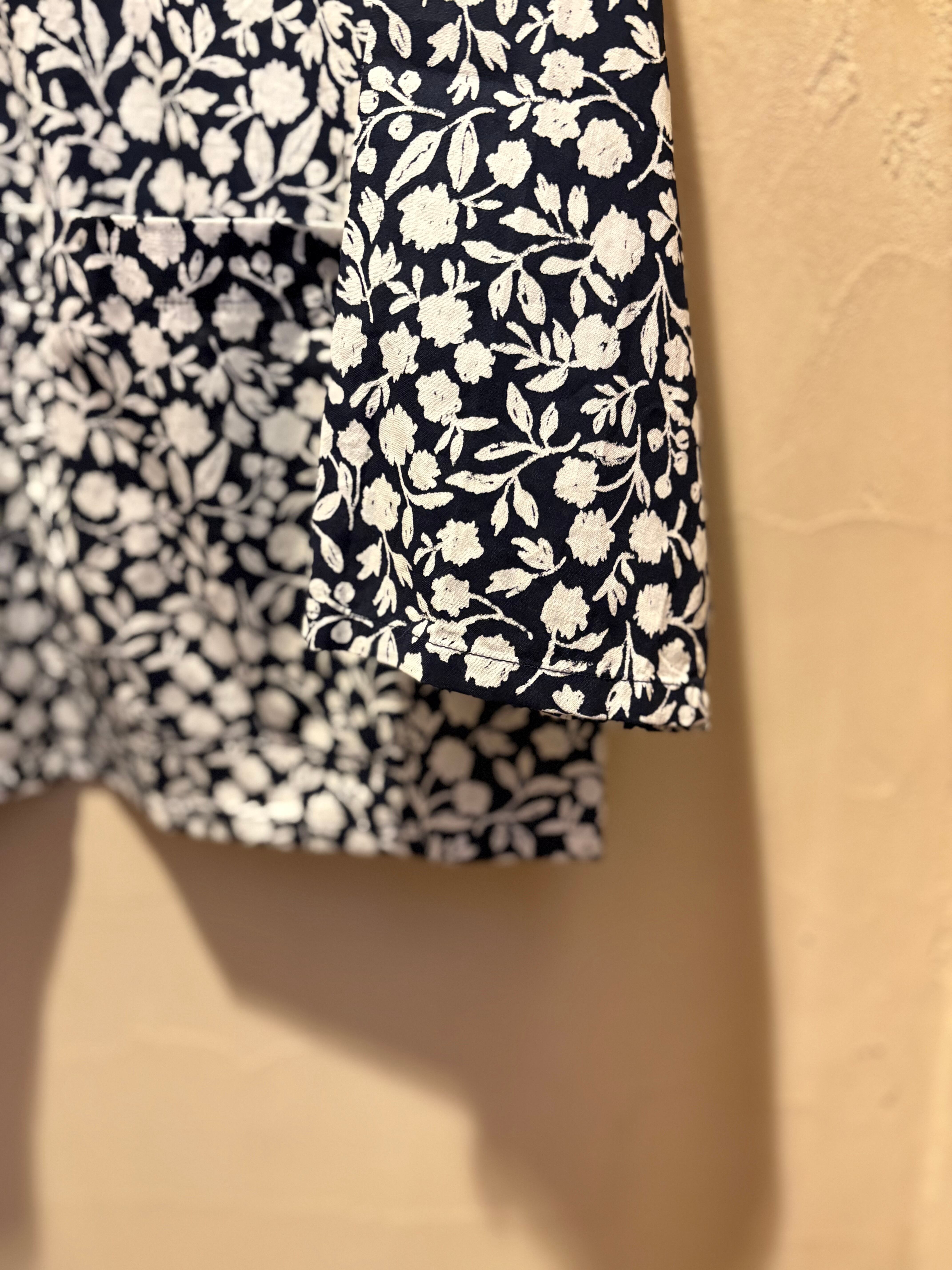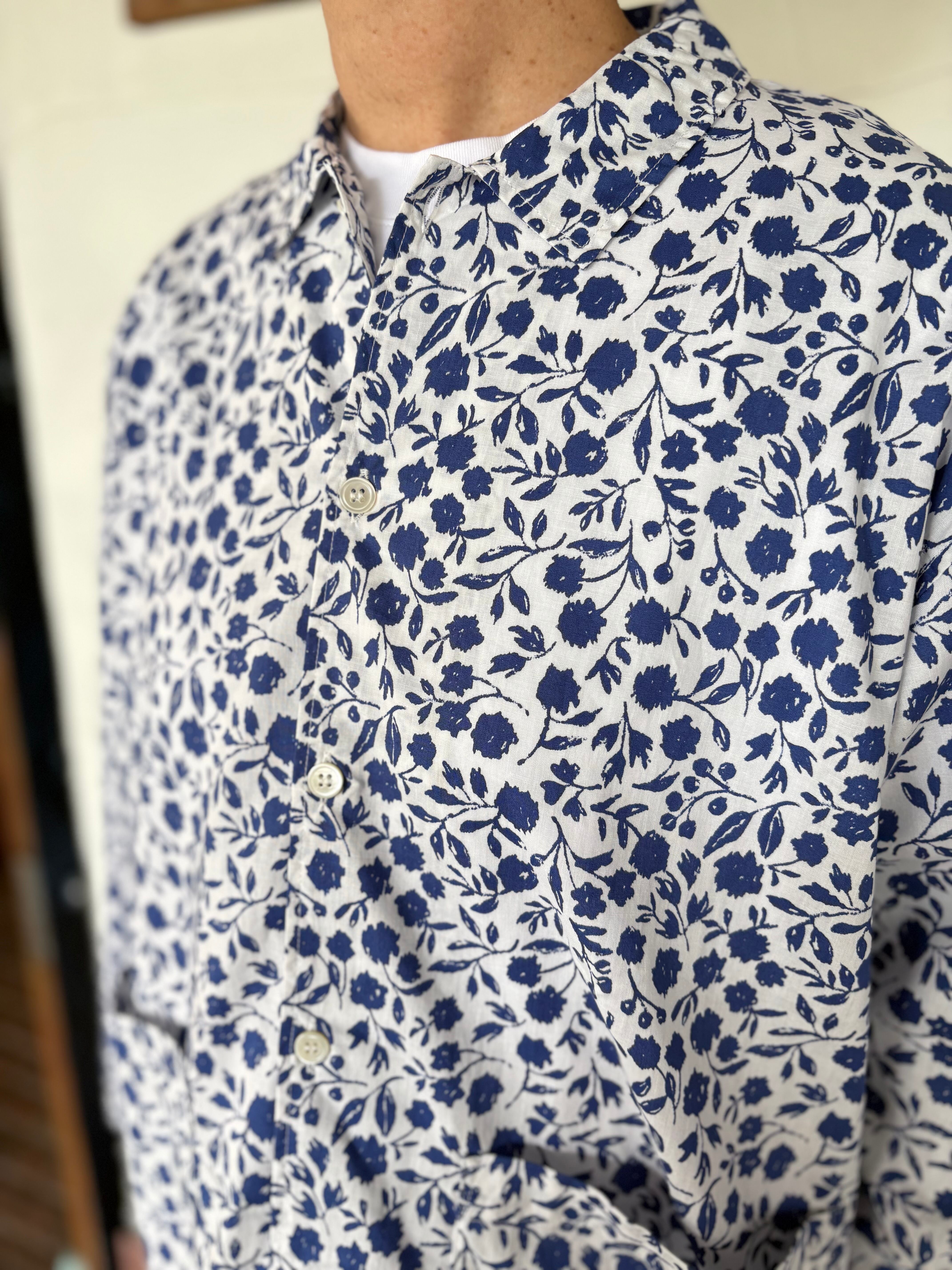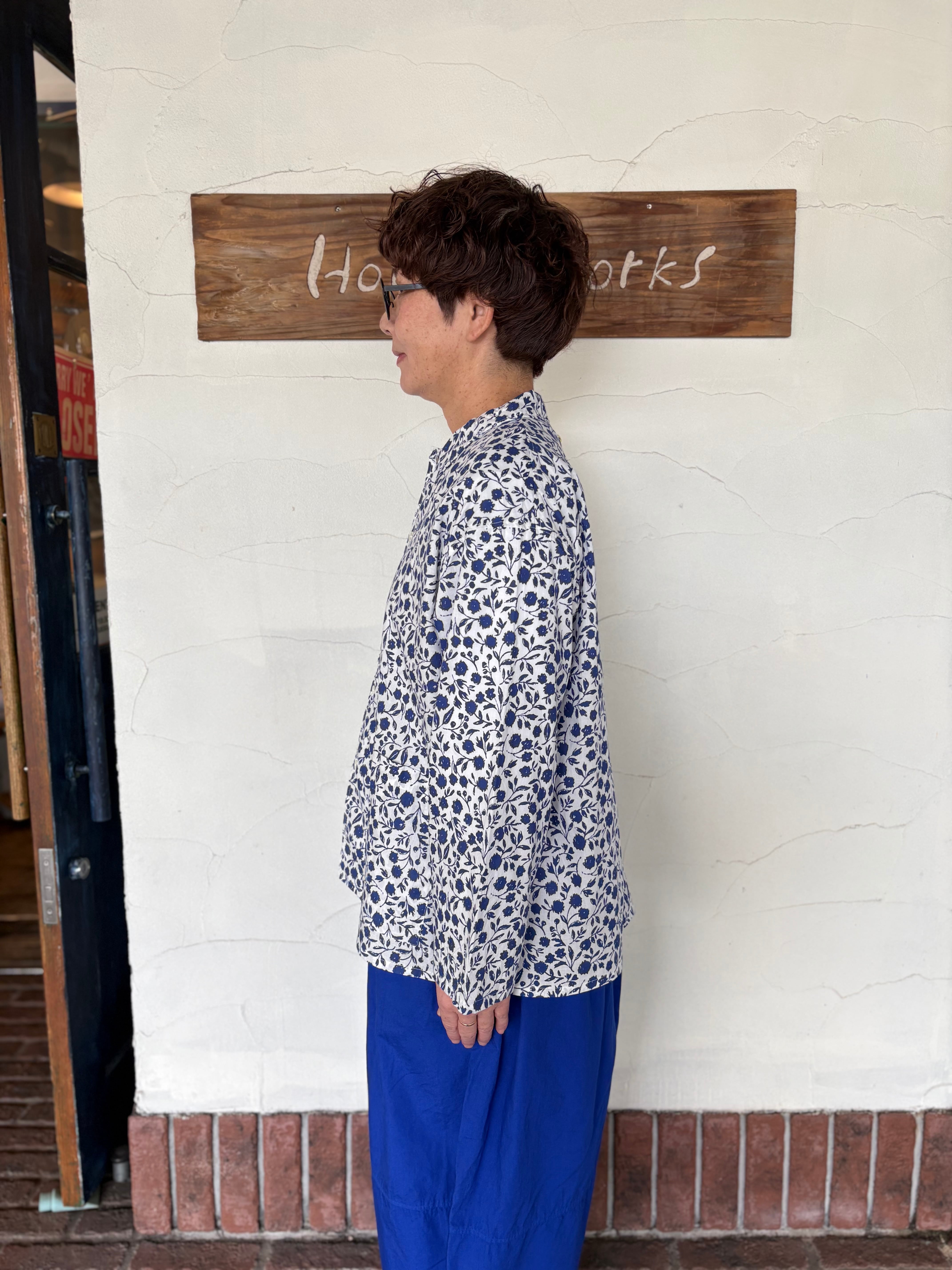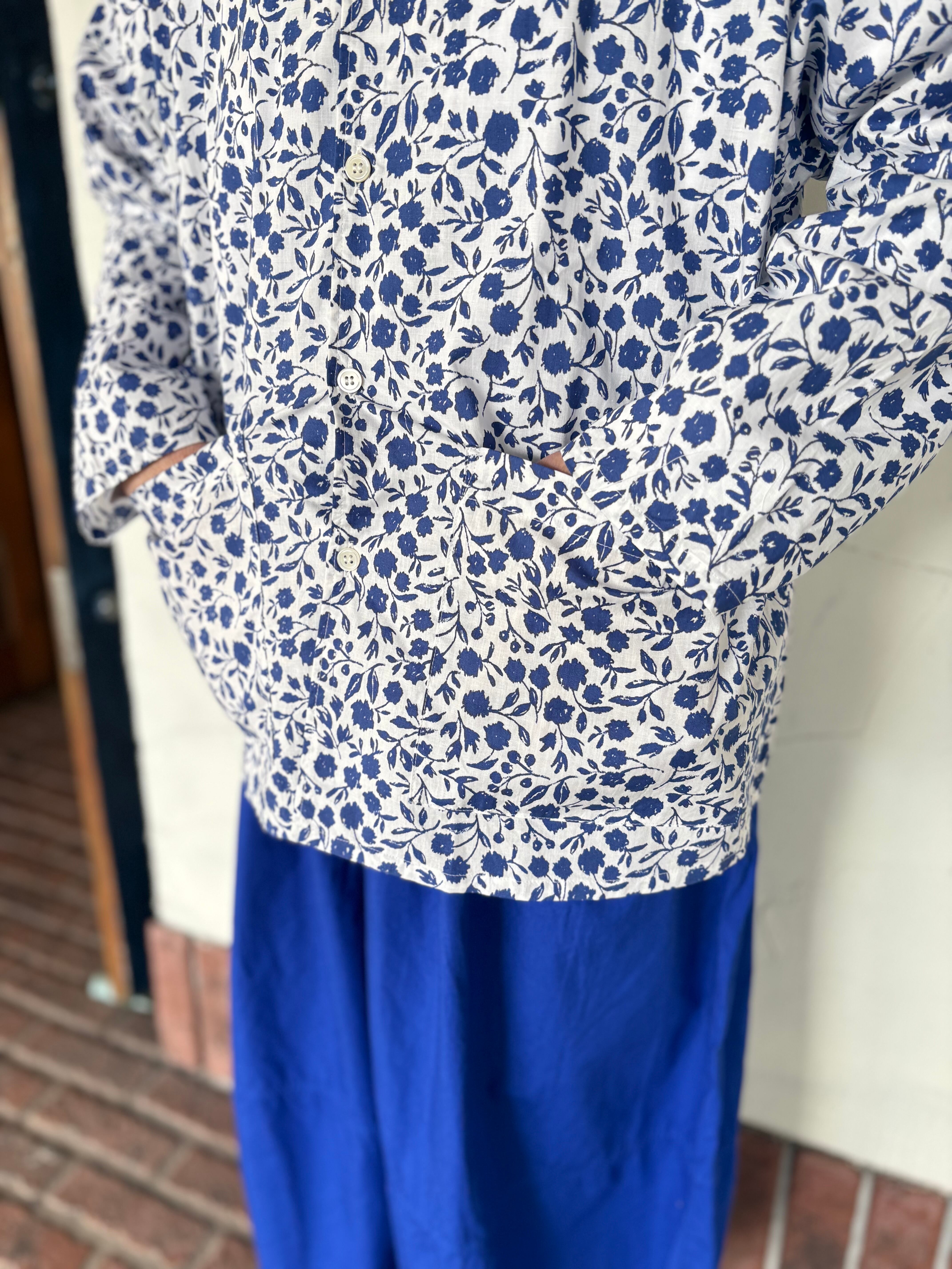 オリジナルフラワープリントのコットン素材の襟付きシャツ、手描きのサッとしたタッチと小花柄よりも少し大きめの柄が華やかな1枚。ゆったりとしたシルエットに柔らかくサラッとした生地。カジュアルな着こなしやジャケットインナーとしても可愛いです!