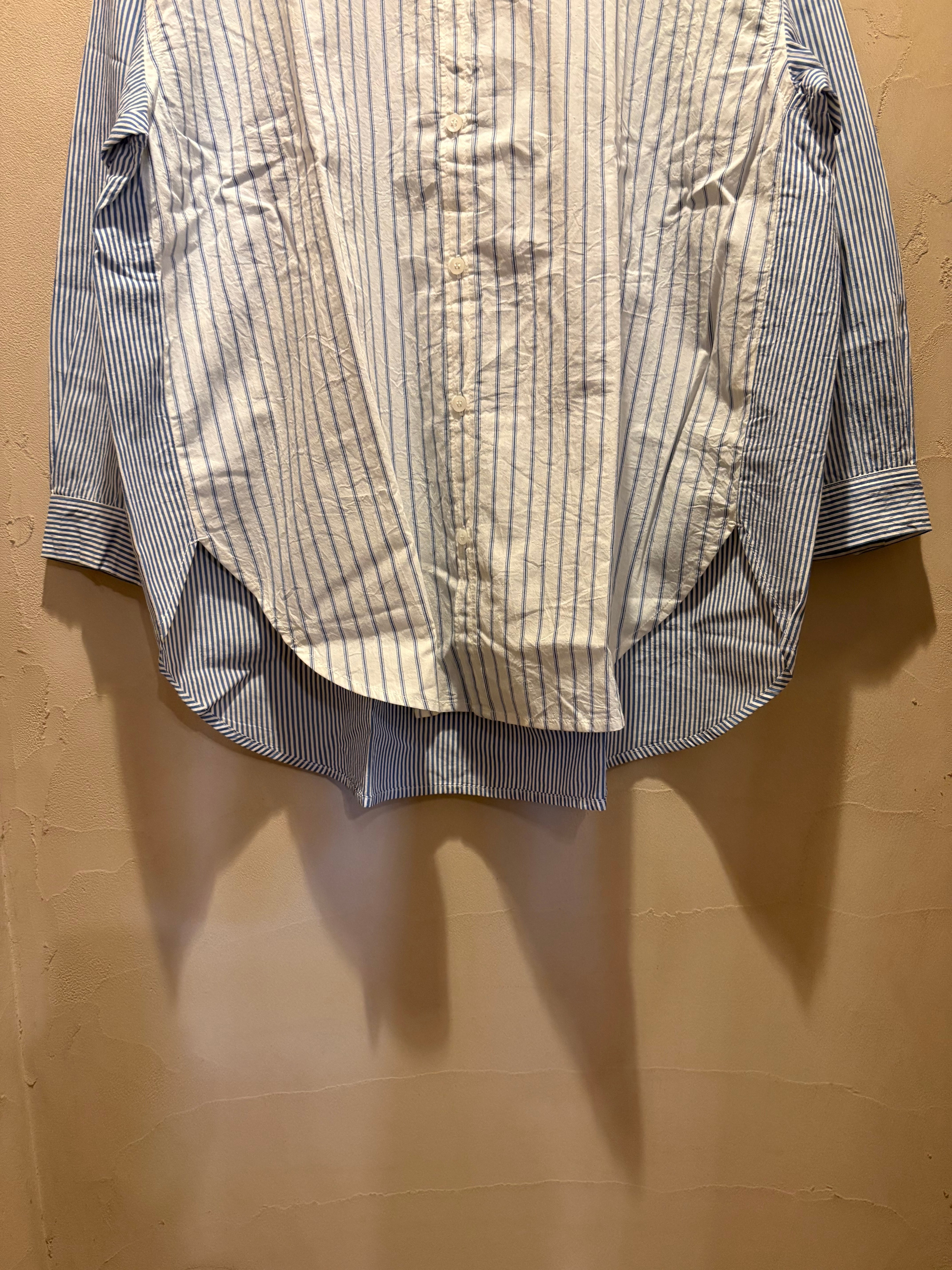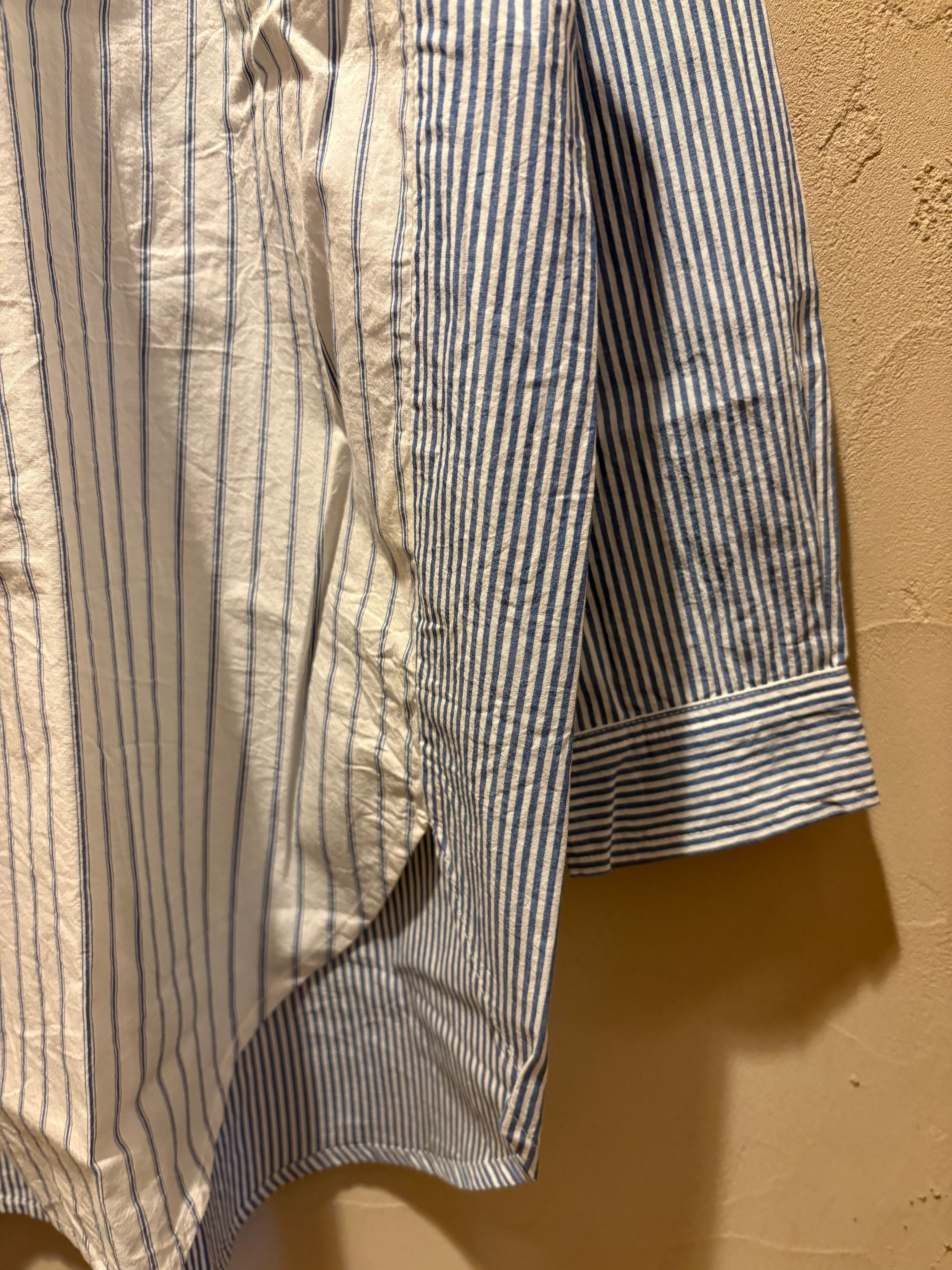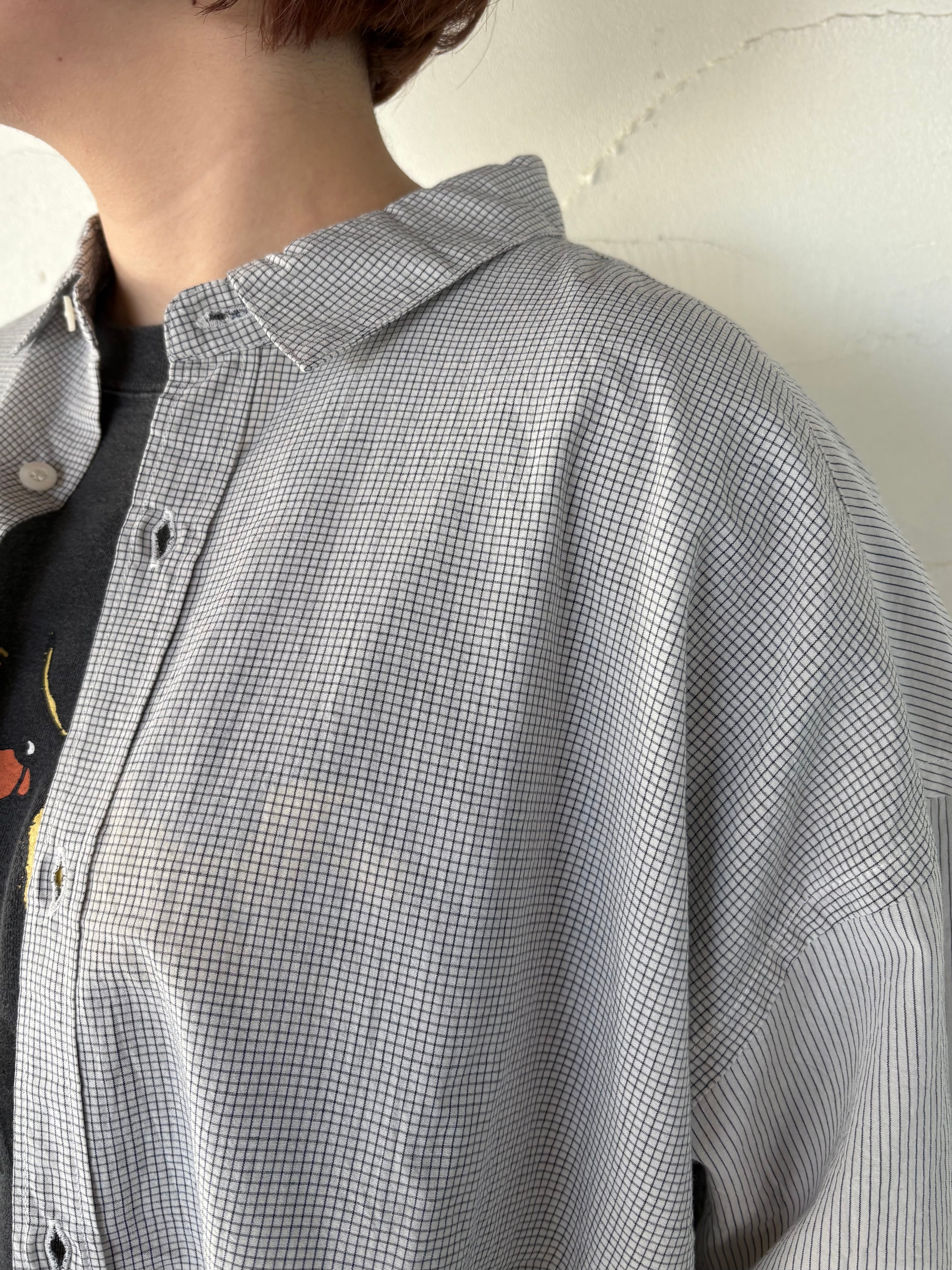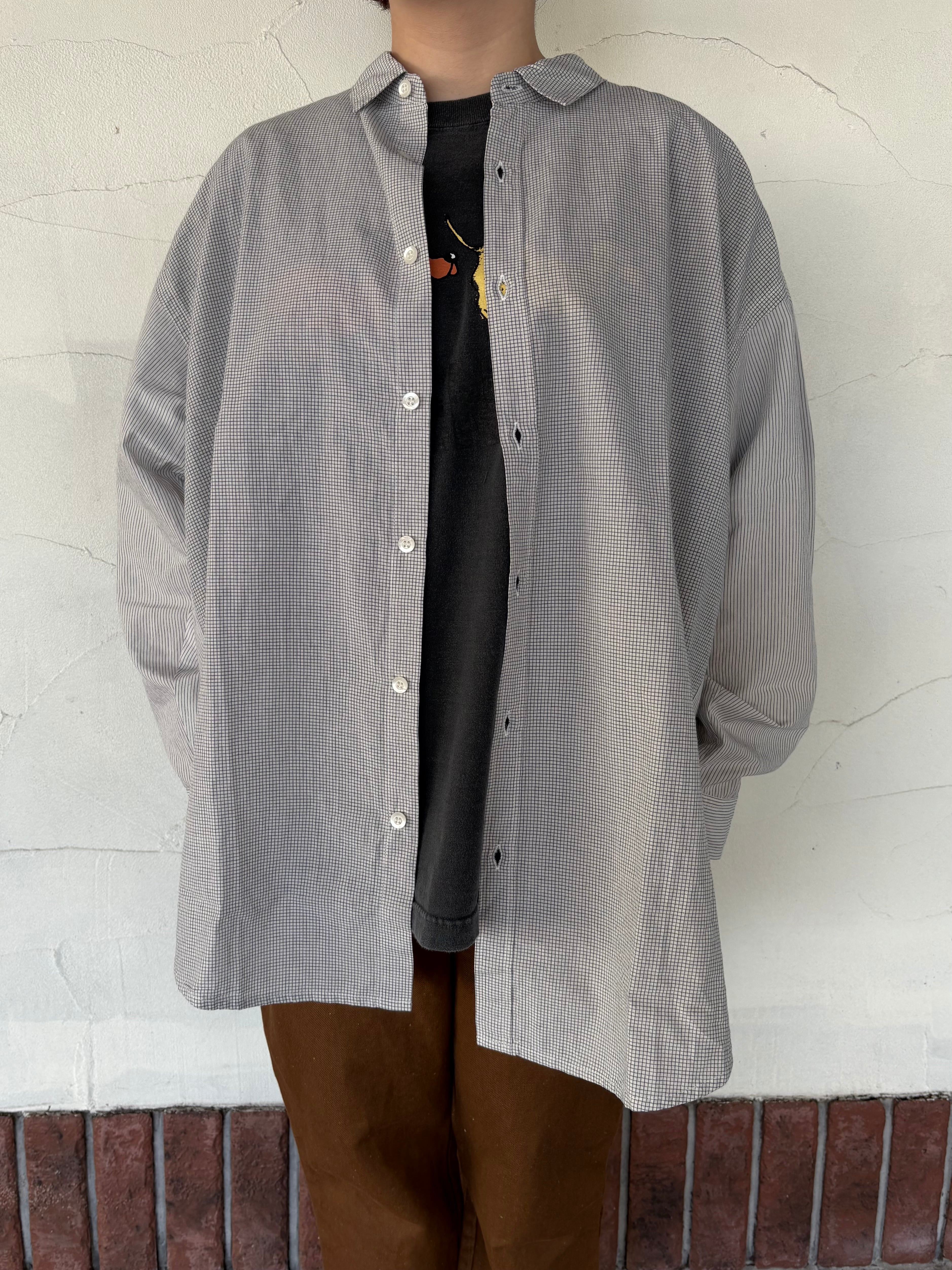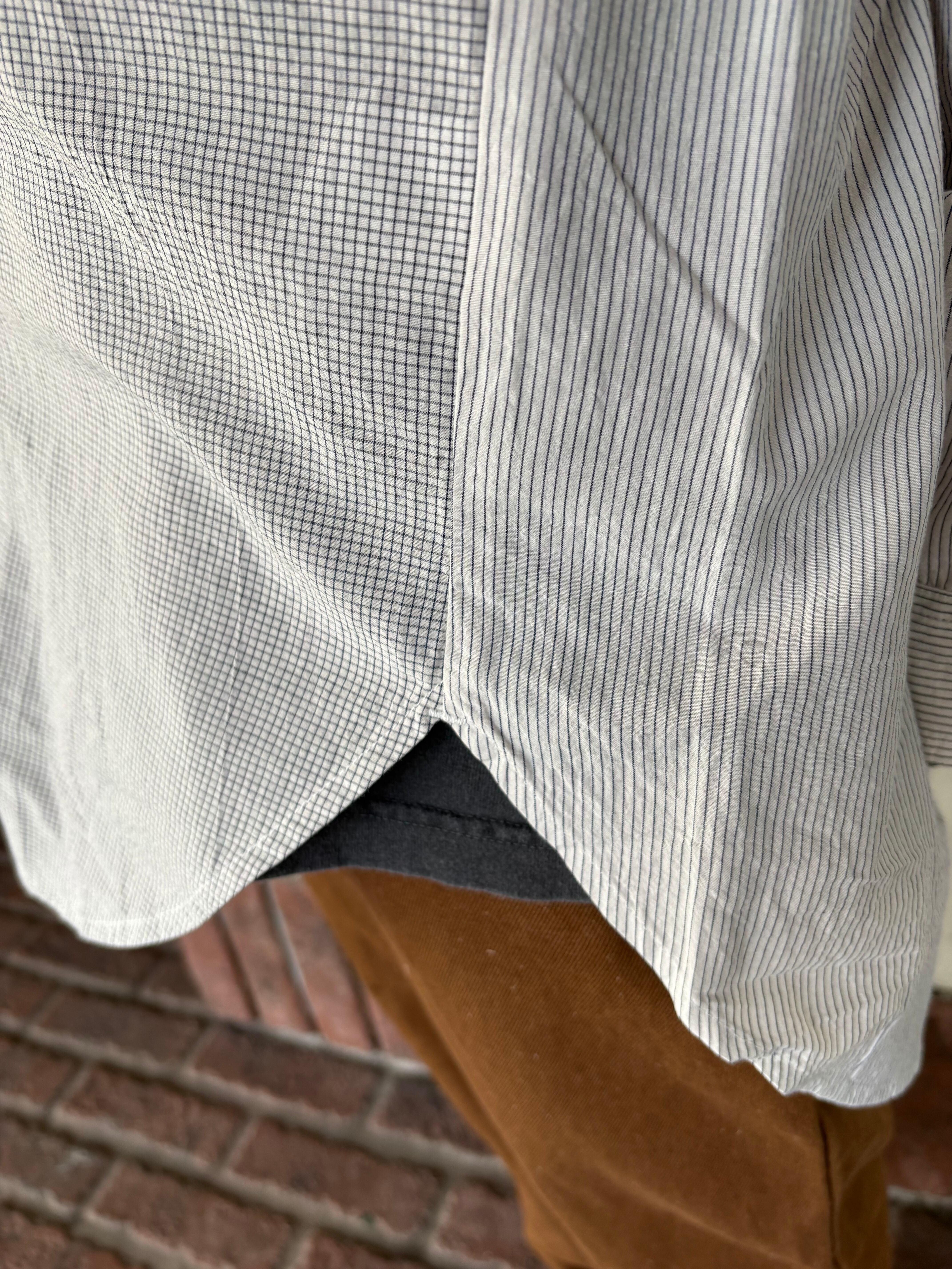 異なる柄を組み合わせたパネルデザインが印象的なロングシャツ。