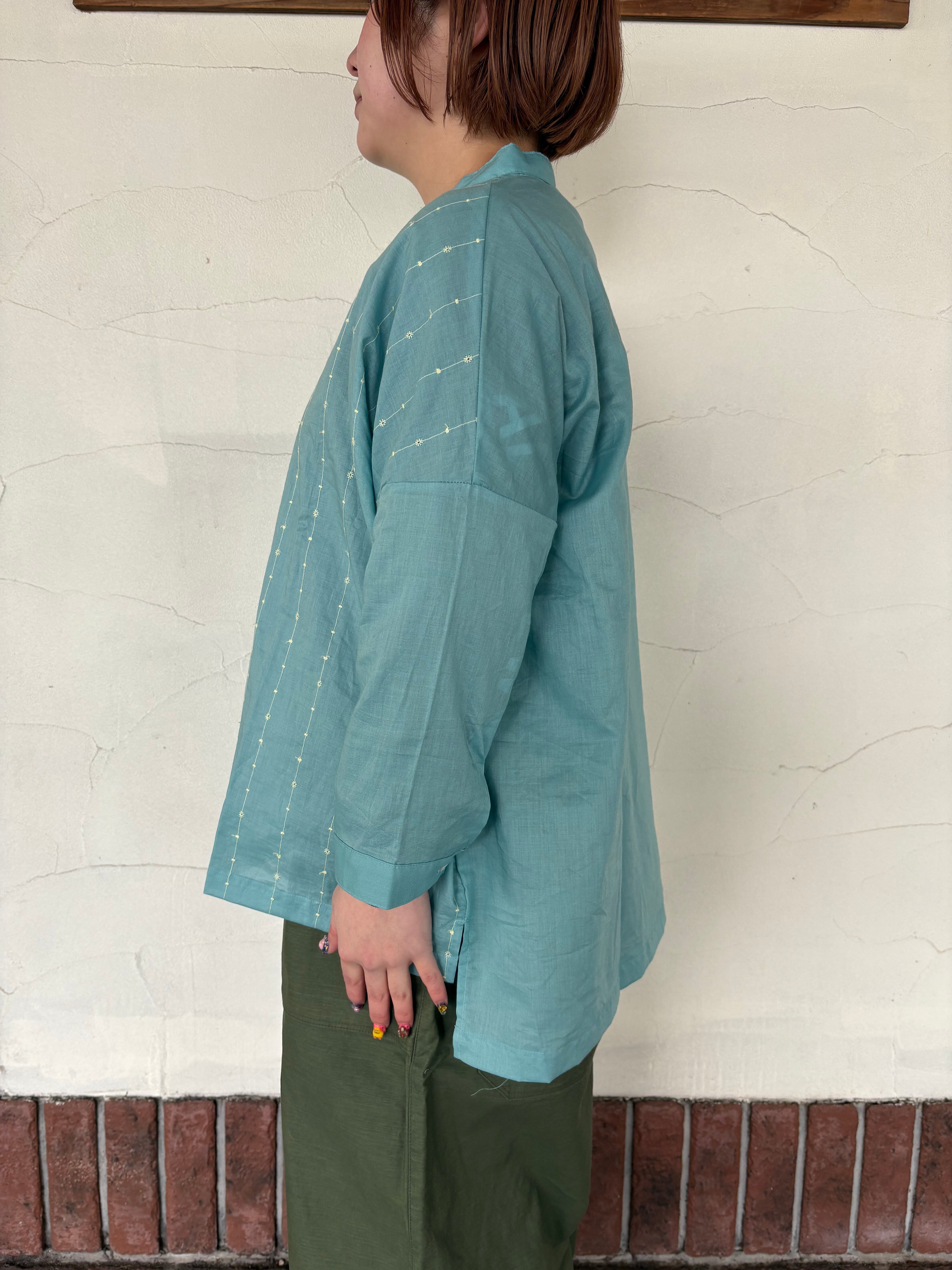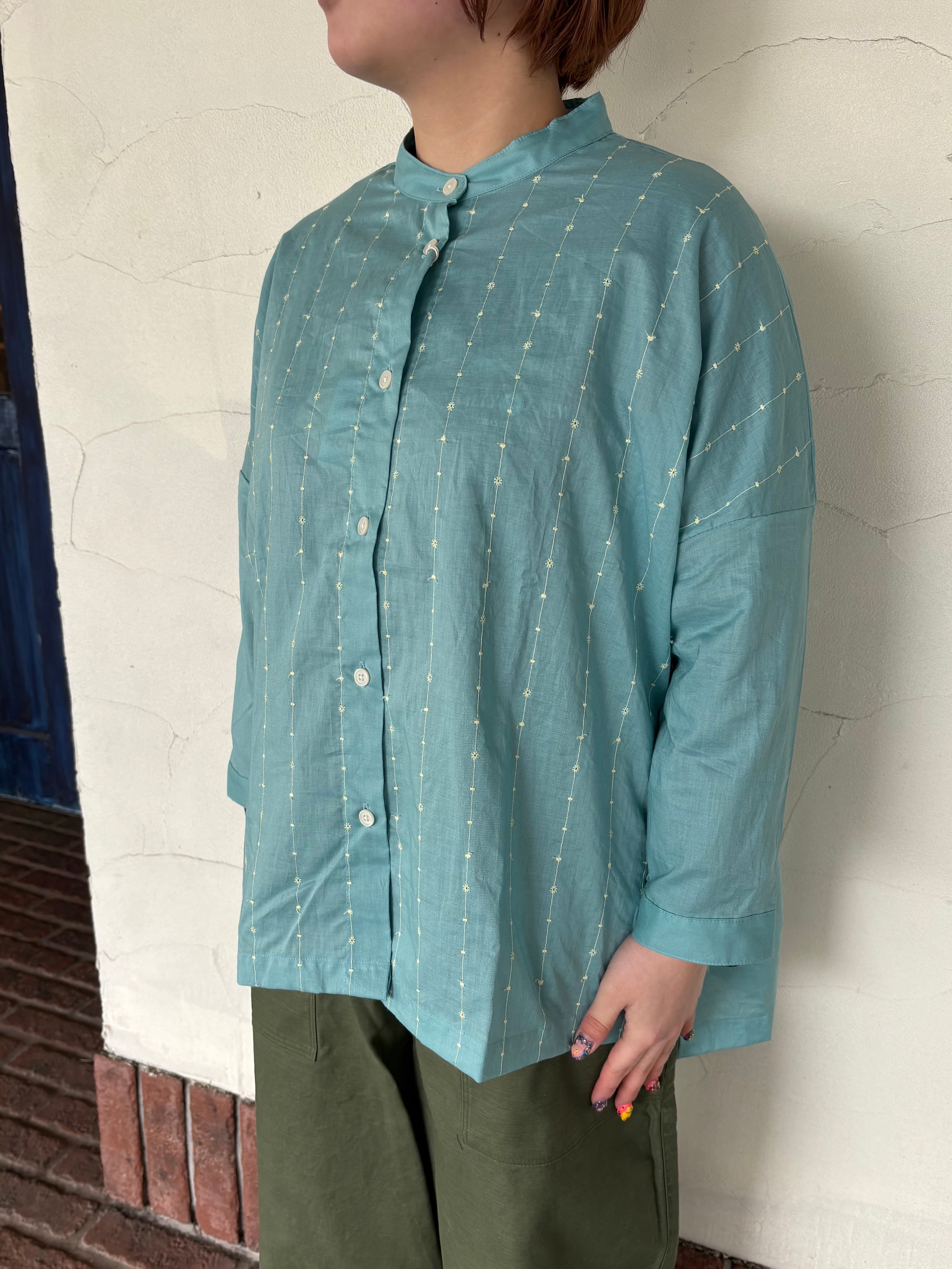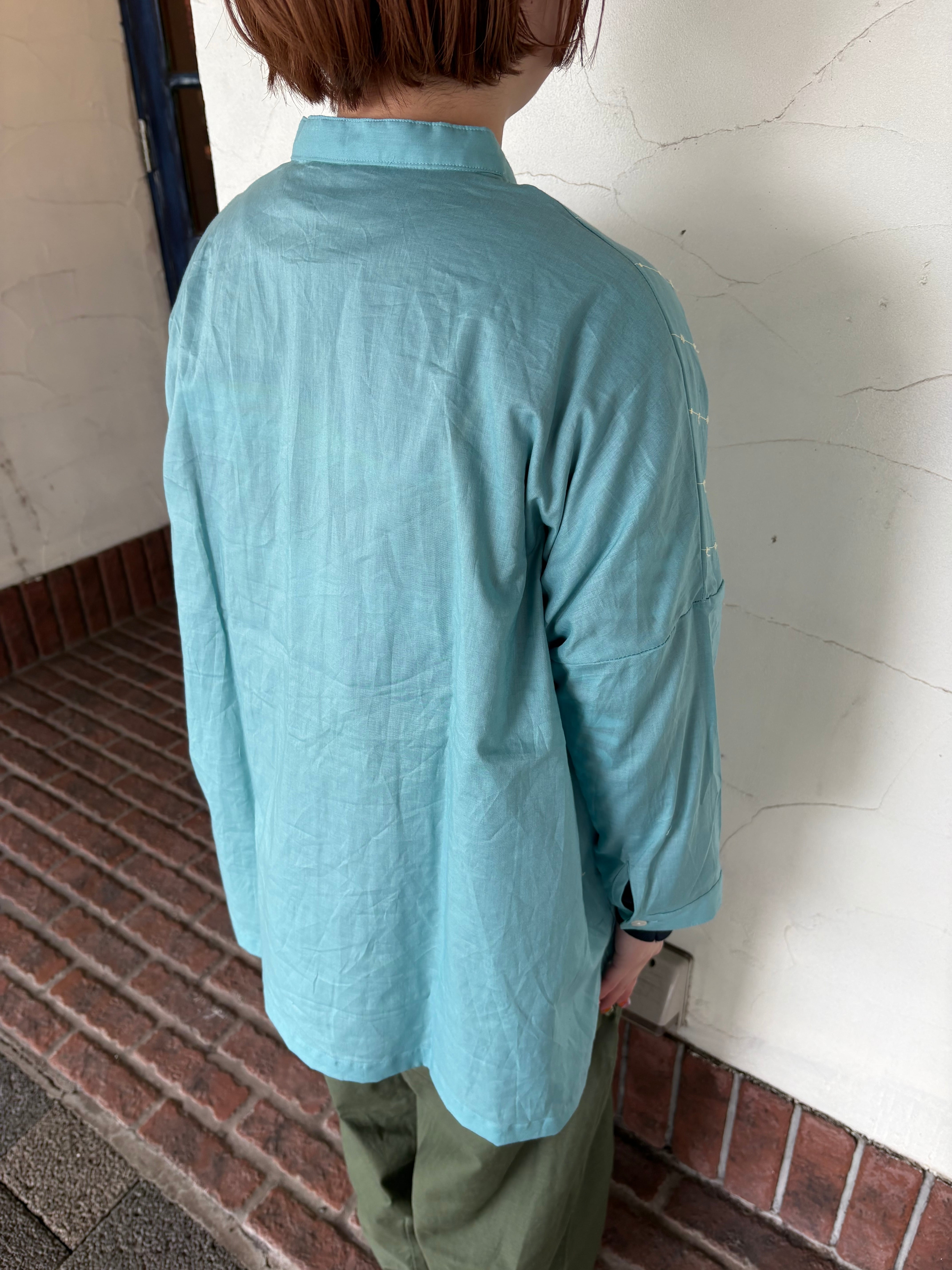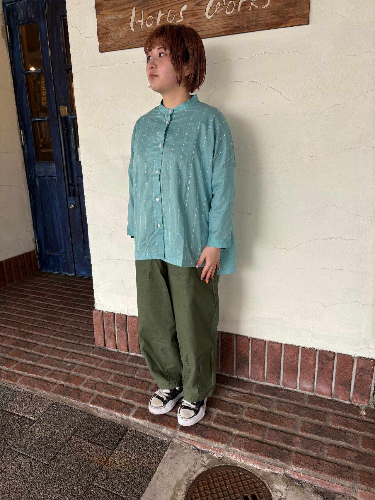 身幅にゆとりを持たせることで、リラックスした着心地ながら、前身頃のみに施した刺繍とバンドカラーがラフすぎない上品な印象を与えるアイテムです!