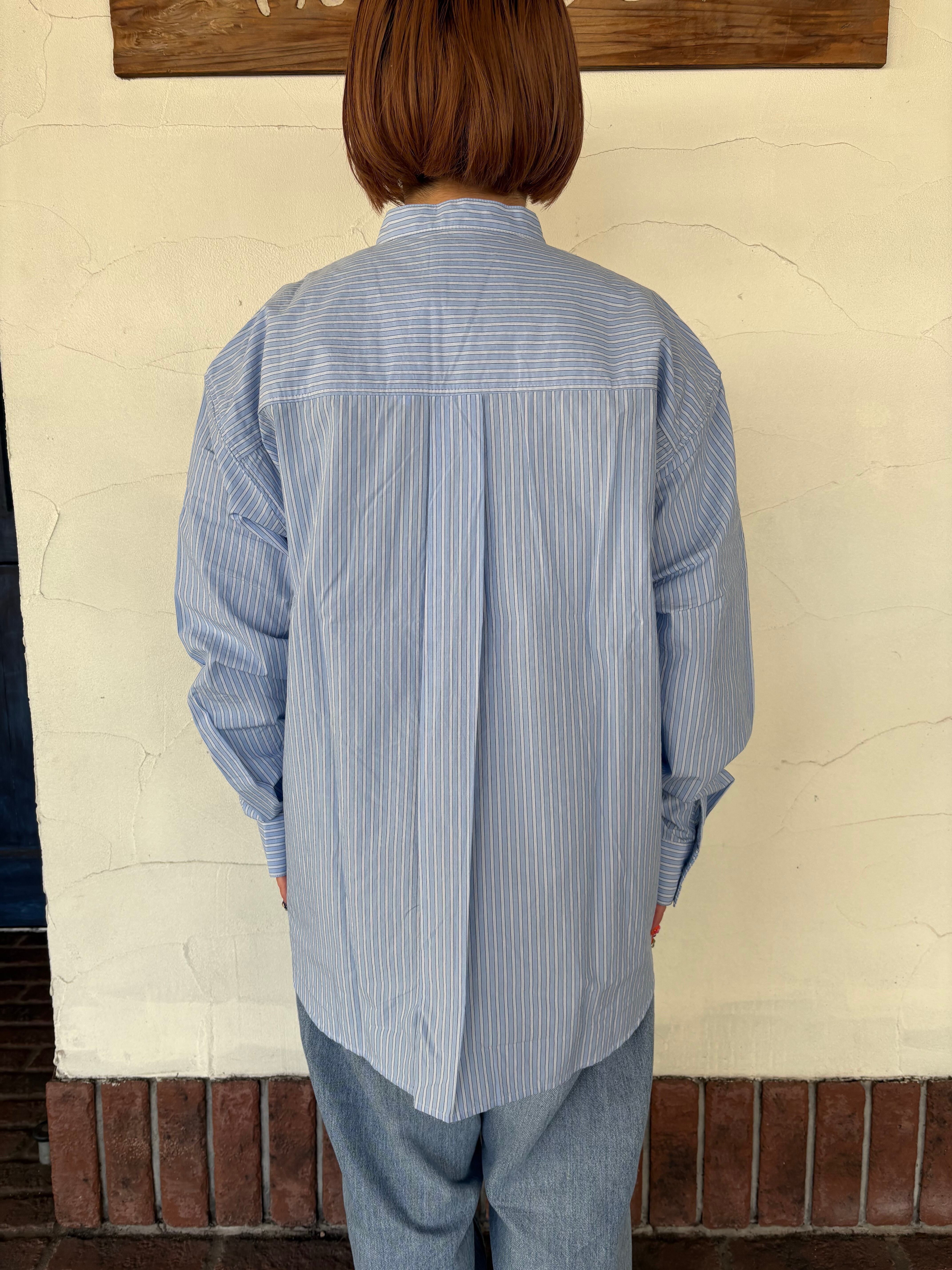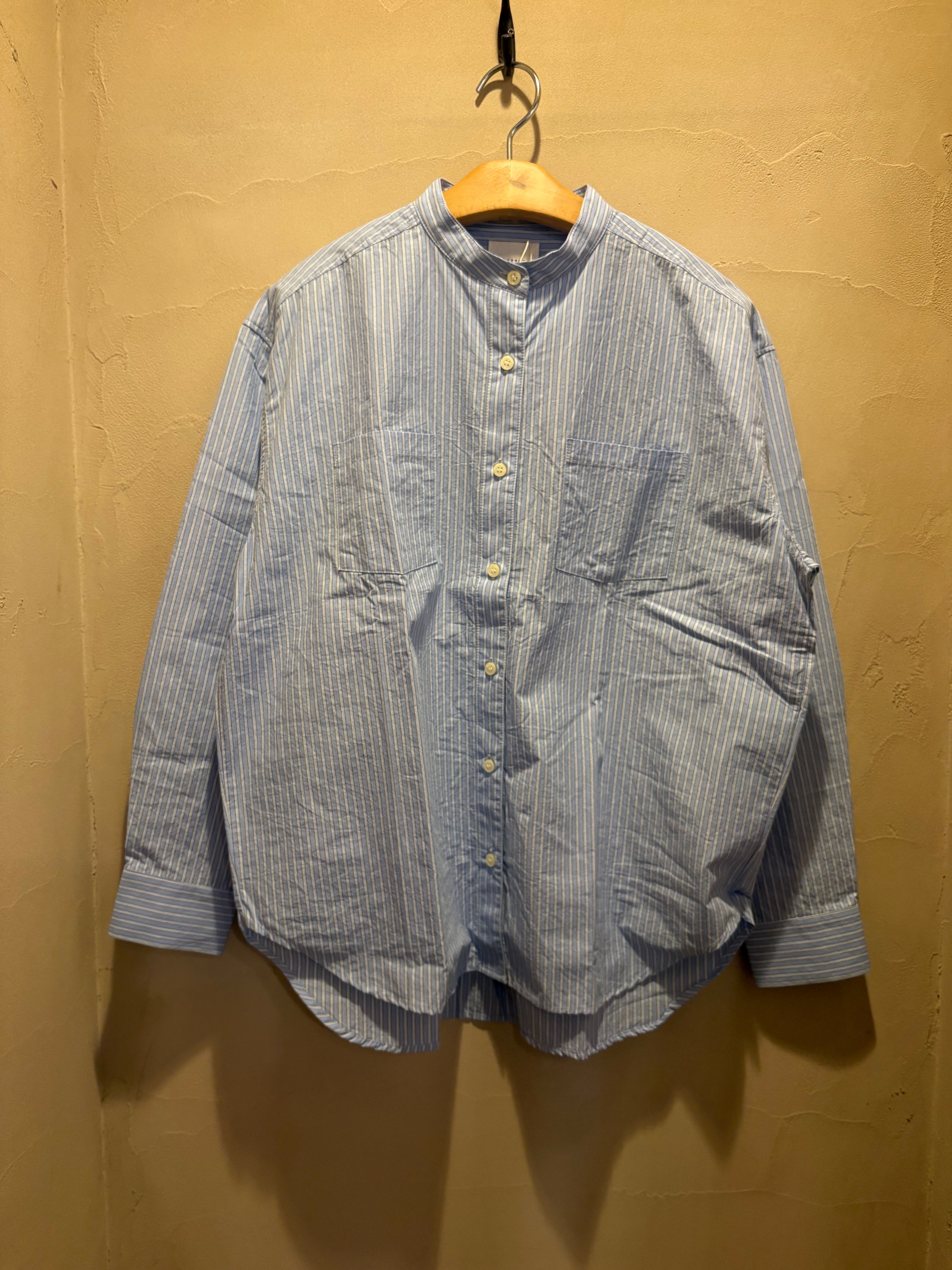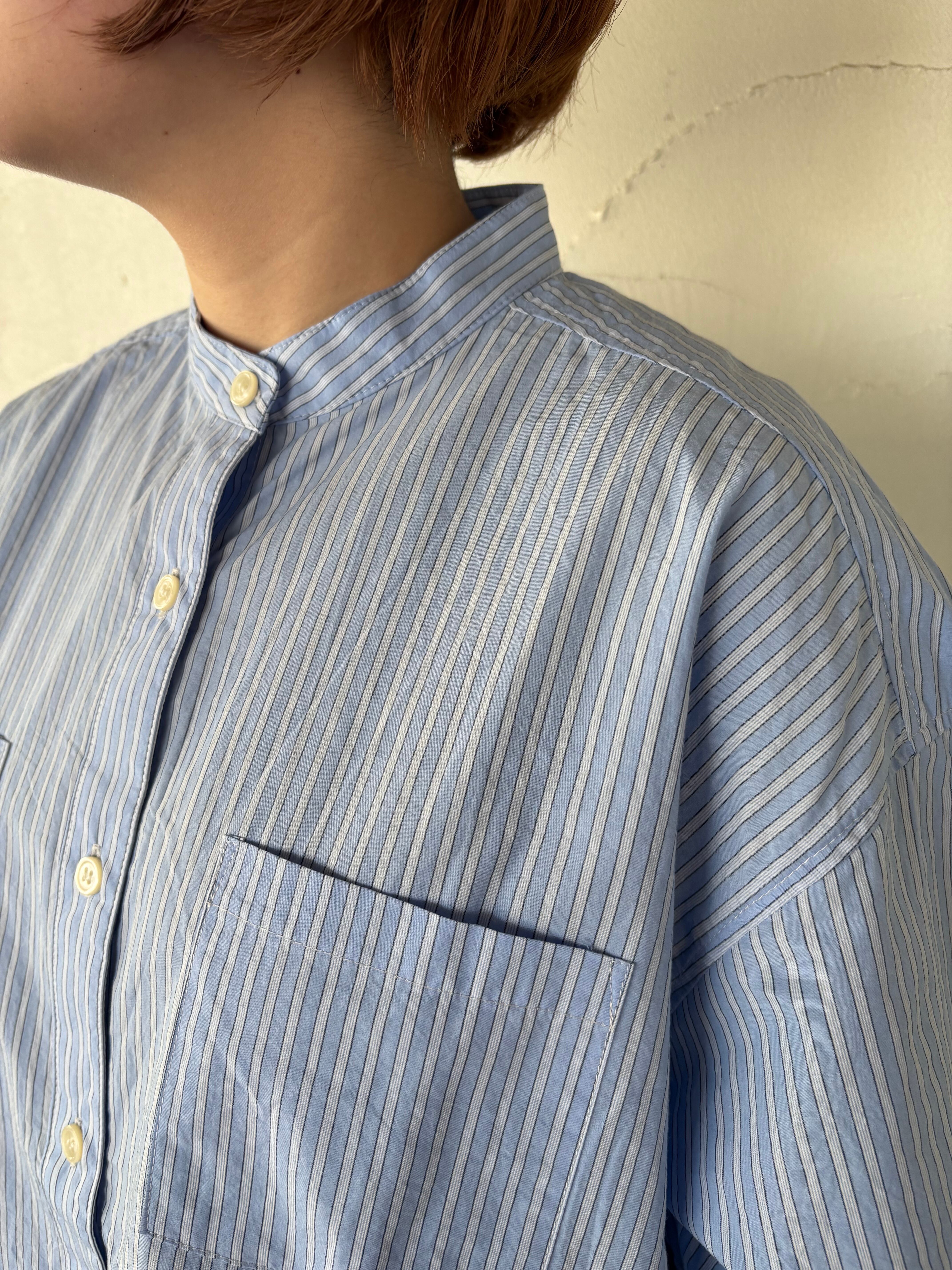 爽やかなストライプ柄が目を引く、軽やかな着心地のバンドカラーシャツ。