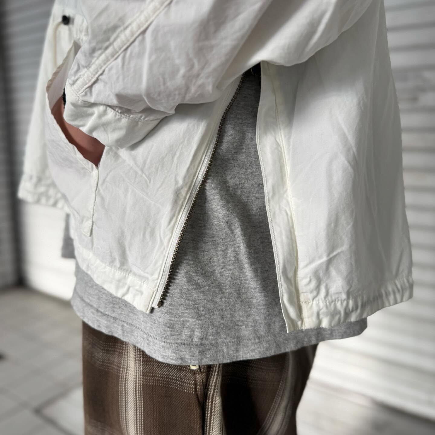ミリタリーアノラックをベースに、デザイナー独自の解釈で様々なギミックを盛り込んだ一枚。
